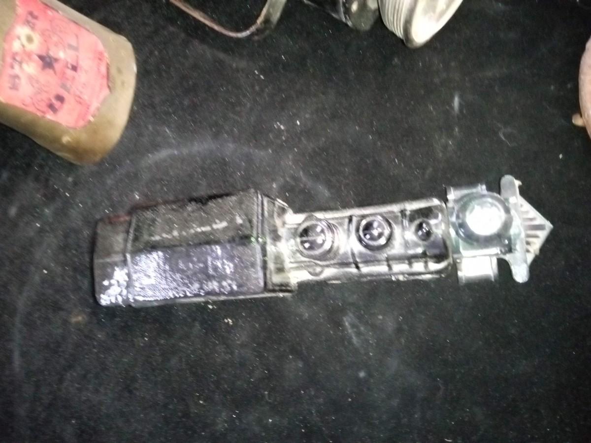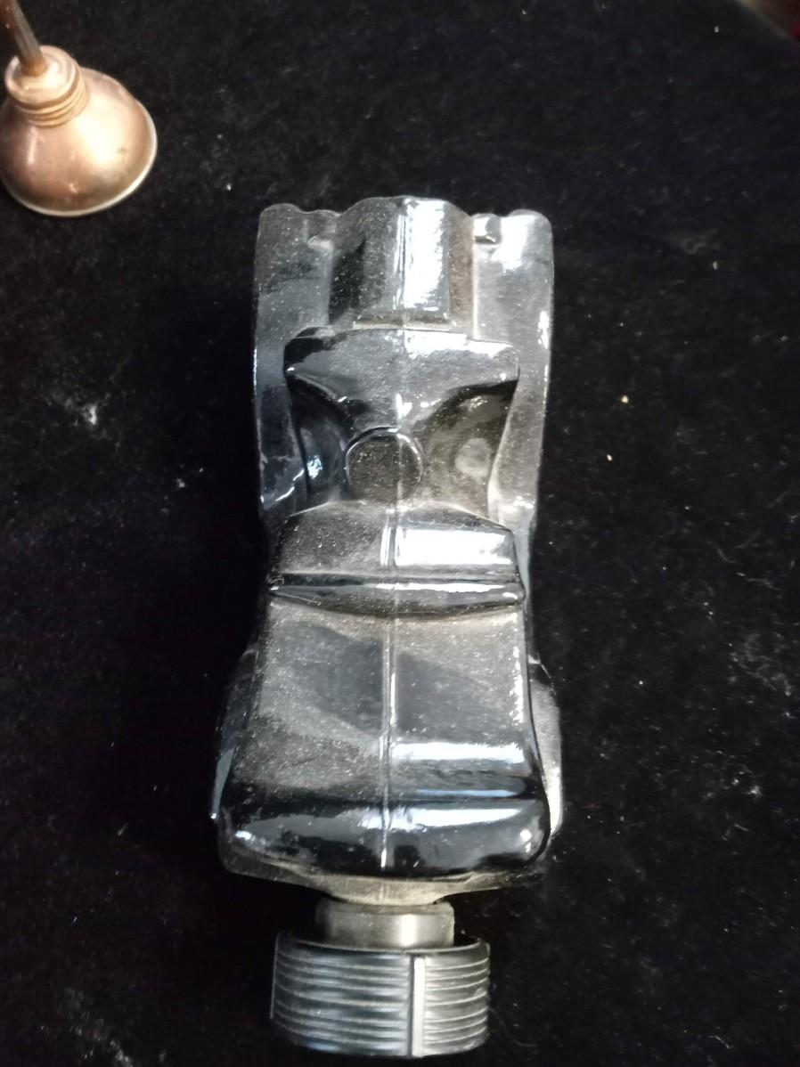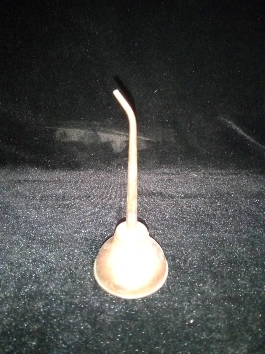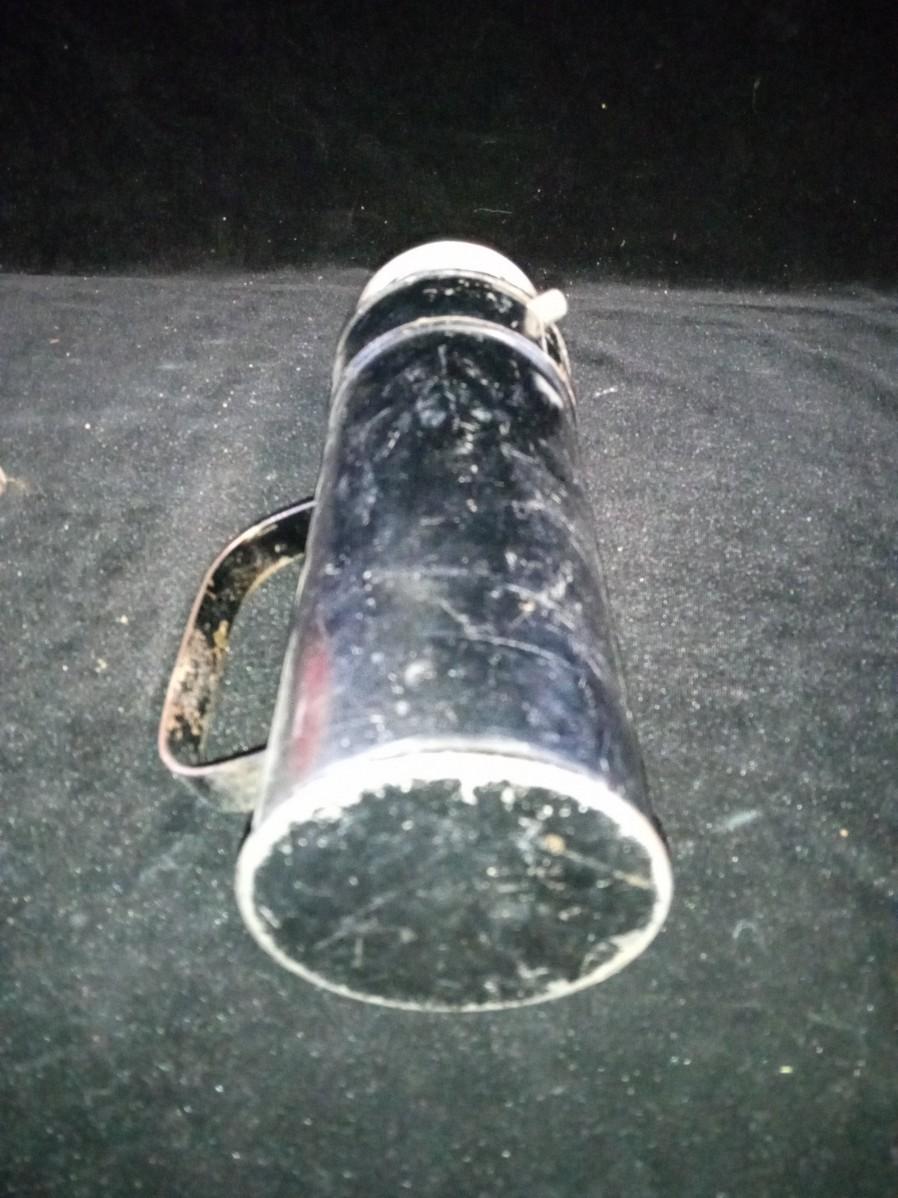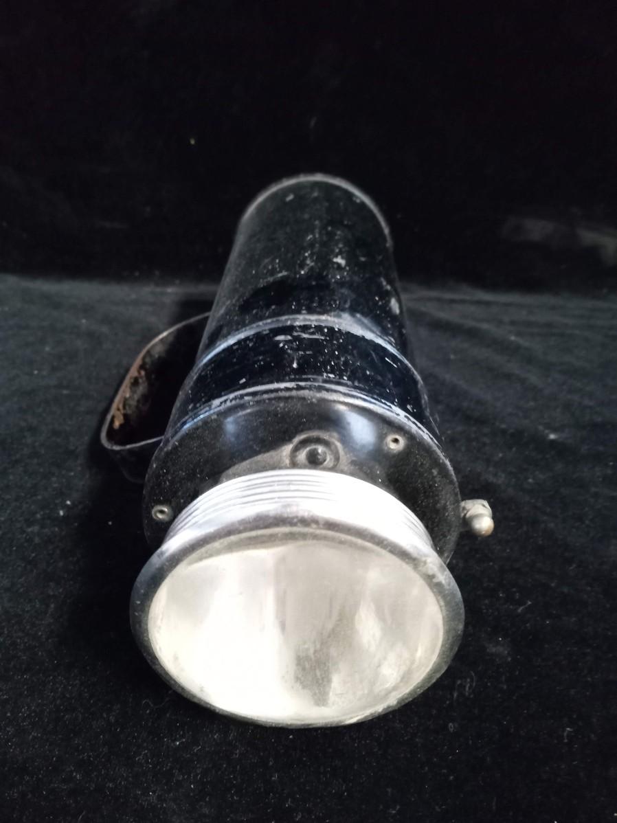 OLD FLASHLIGHT, COPPER OIL CAN, COW BELL, HORSE SHOE AND 2 AVON BOTTLES