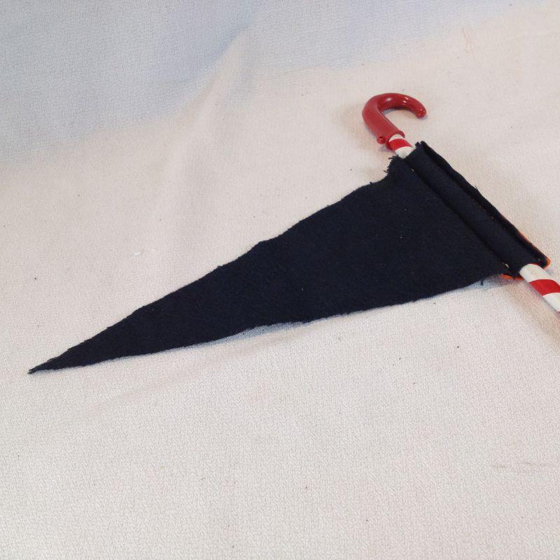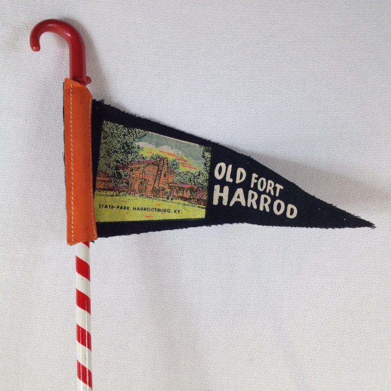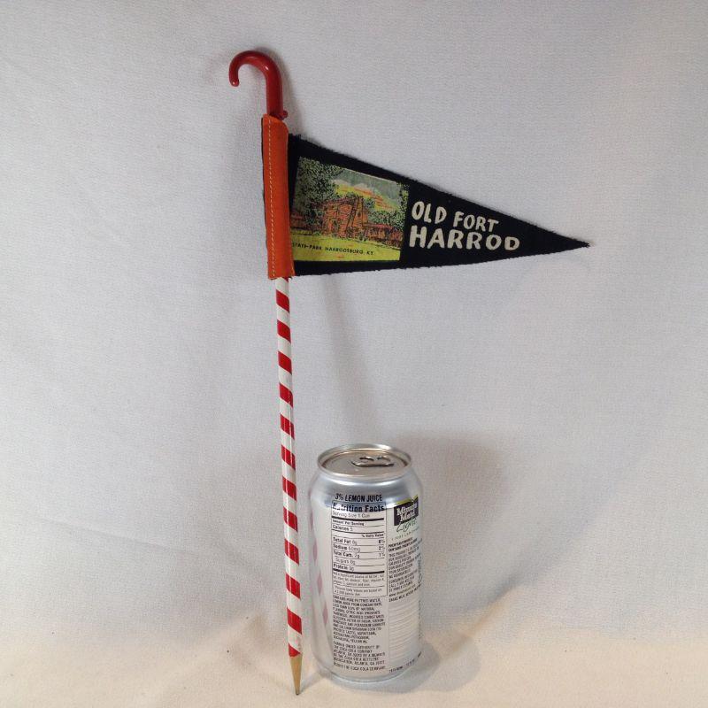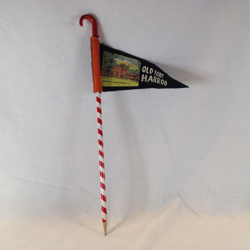 This wonderful Kentucky souvenir collectible is an old Fort Harrod Banner on a pencil cane. Fort Harrod was the first Fort in Kentucky - still stands in Harrodsburg, KY. The cane holder measures 14 1/2-inches tall, the banner is 8 1/2-inches long. Shows wear consistent with age. What a find!