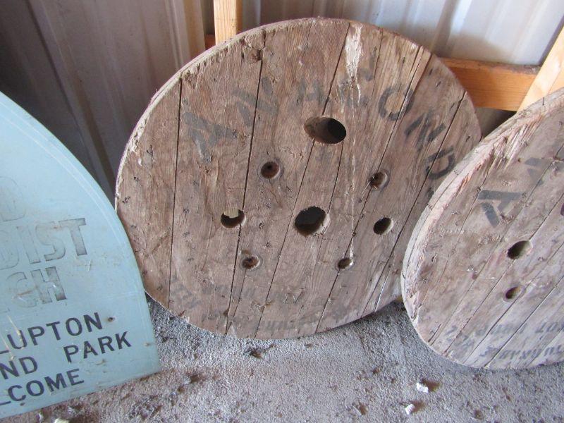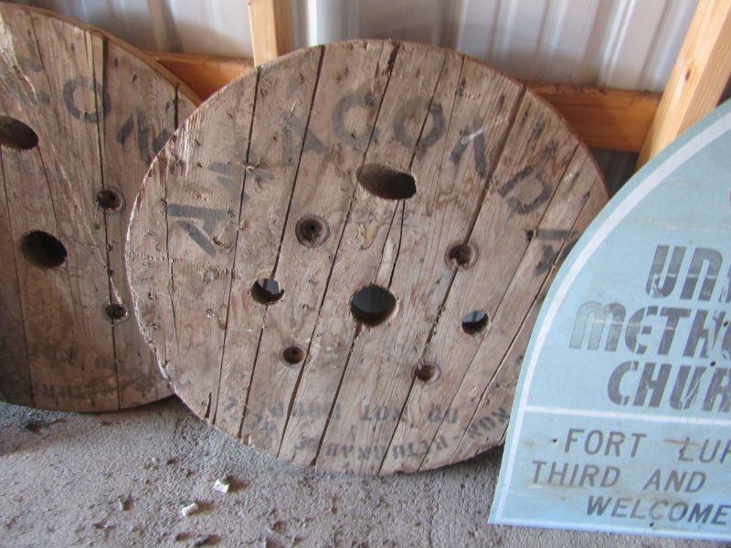 THE ENDS OF A WOODEN SPOOL WITH ADVERTISING