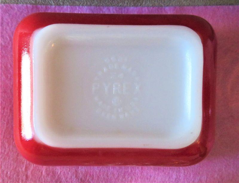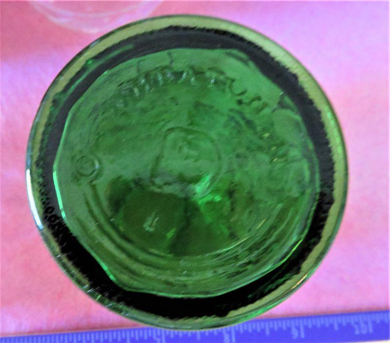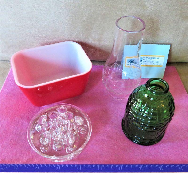 Misc LOT of Old Green Glass Bottle Marked, Red Pyrex Dish, Glass PEN / Pencil Holder - paperweight and Miniature etched Glass Oil Lamp Chimney. All in Good Condition for its age.