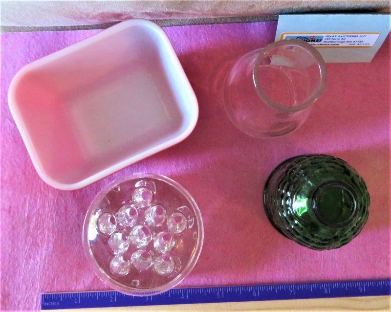 OLD GREEN Bottle, Pyrex, Glass Pen Holder, Mini Oil Lamp Chimney LOT