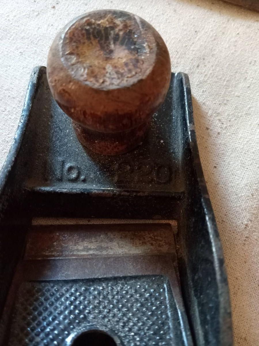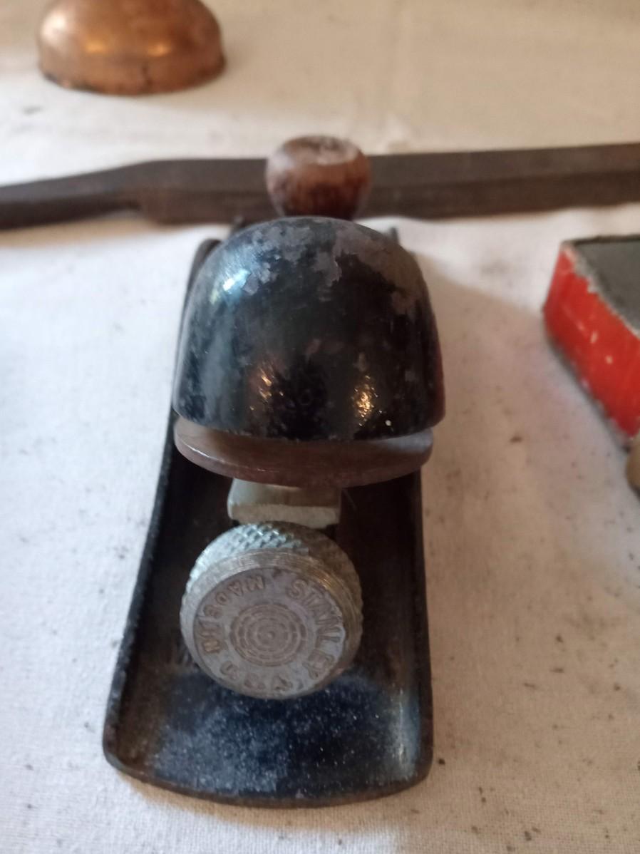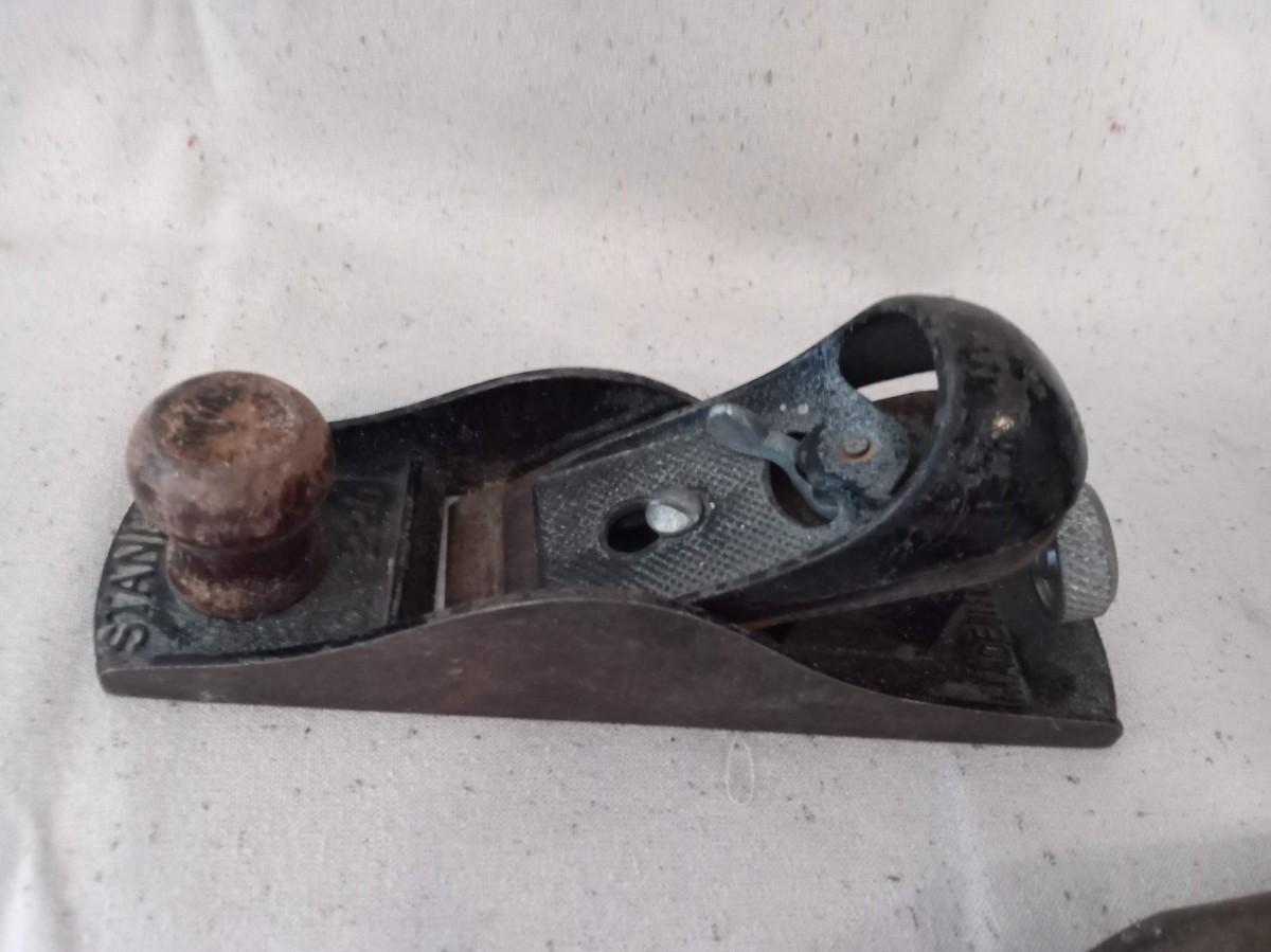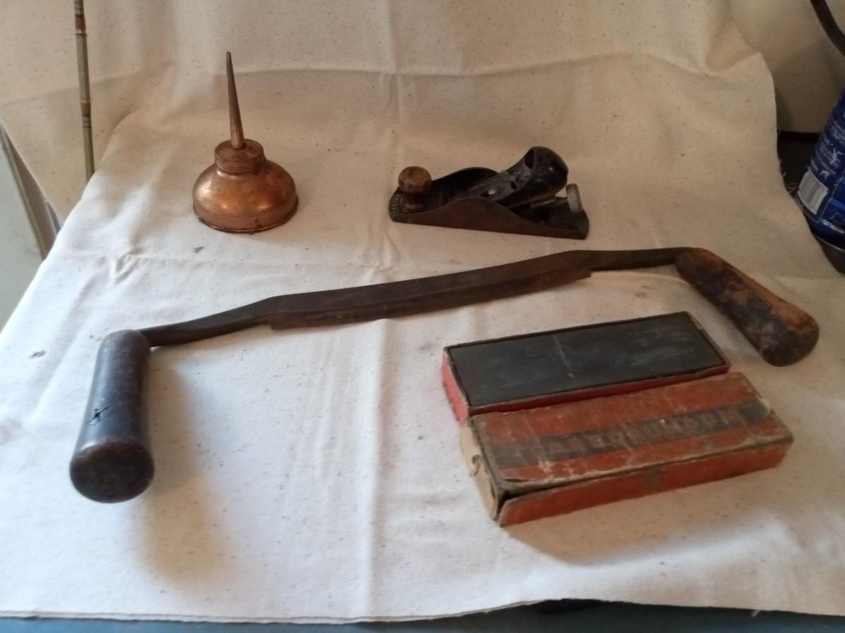 DRAW KNIFE, COPPER OIL CAN, SHARPENING STONE AND A STANLEY NO 220 WOOD PLANE