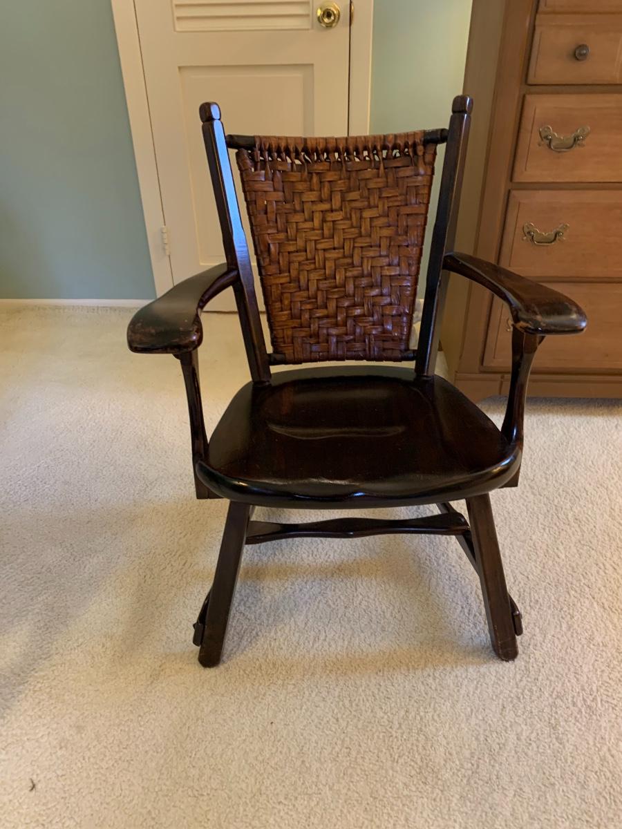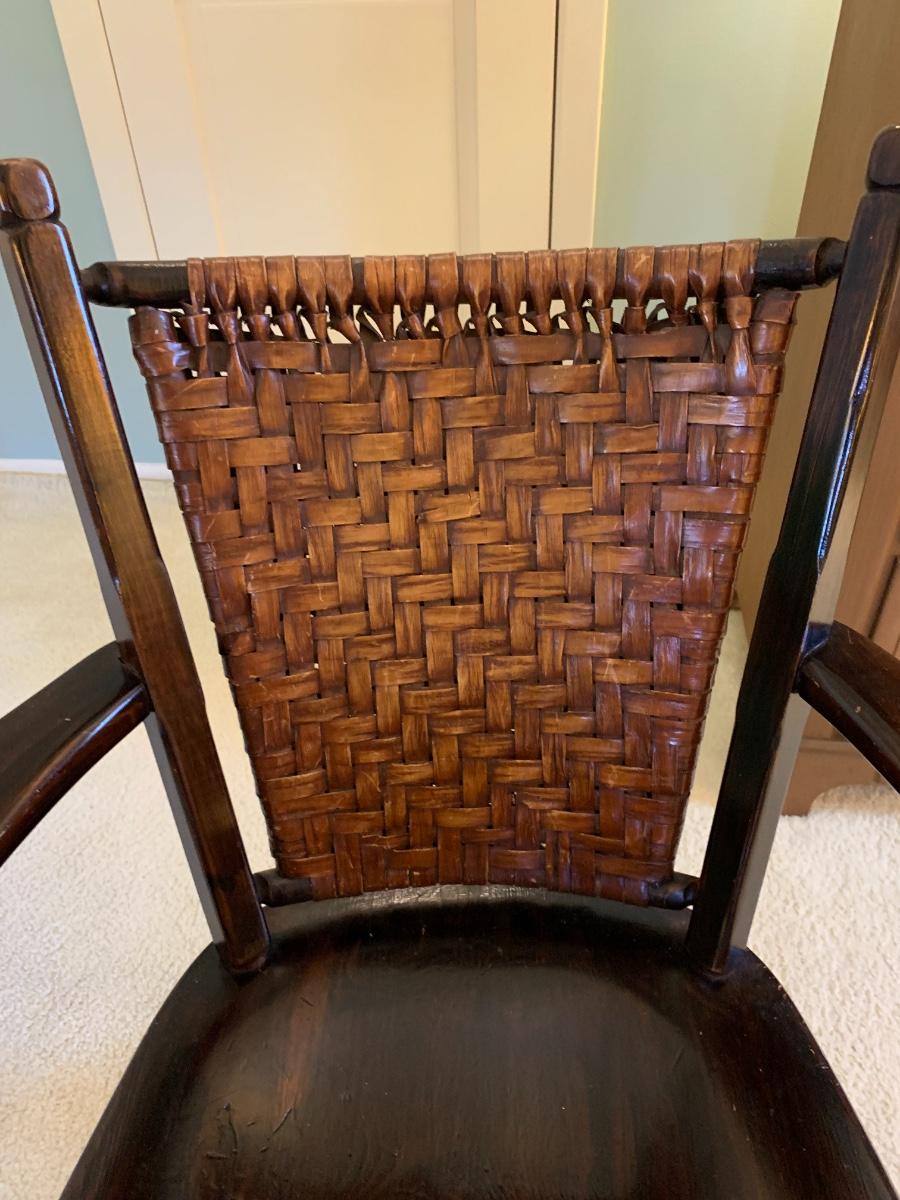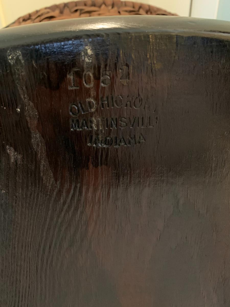 Classic American Rustic furniture - lounge, armchair, made by the Old Hickory Furniture Company circa 1940's. The chair features a solid oak frame with a woven wicker backrest, it is in very good, original, clean and ready to use condition, showing only light cosmetic wear, normal and consistent with age.