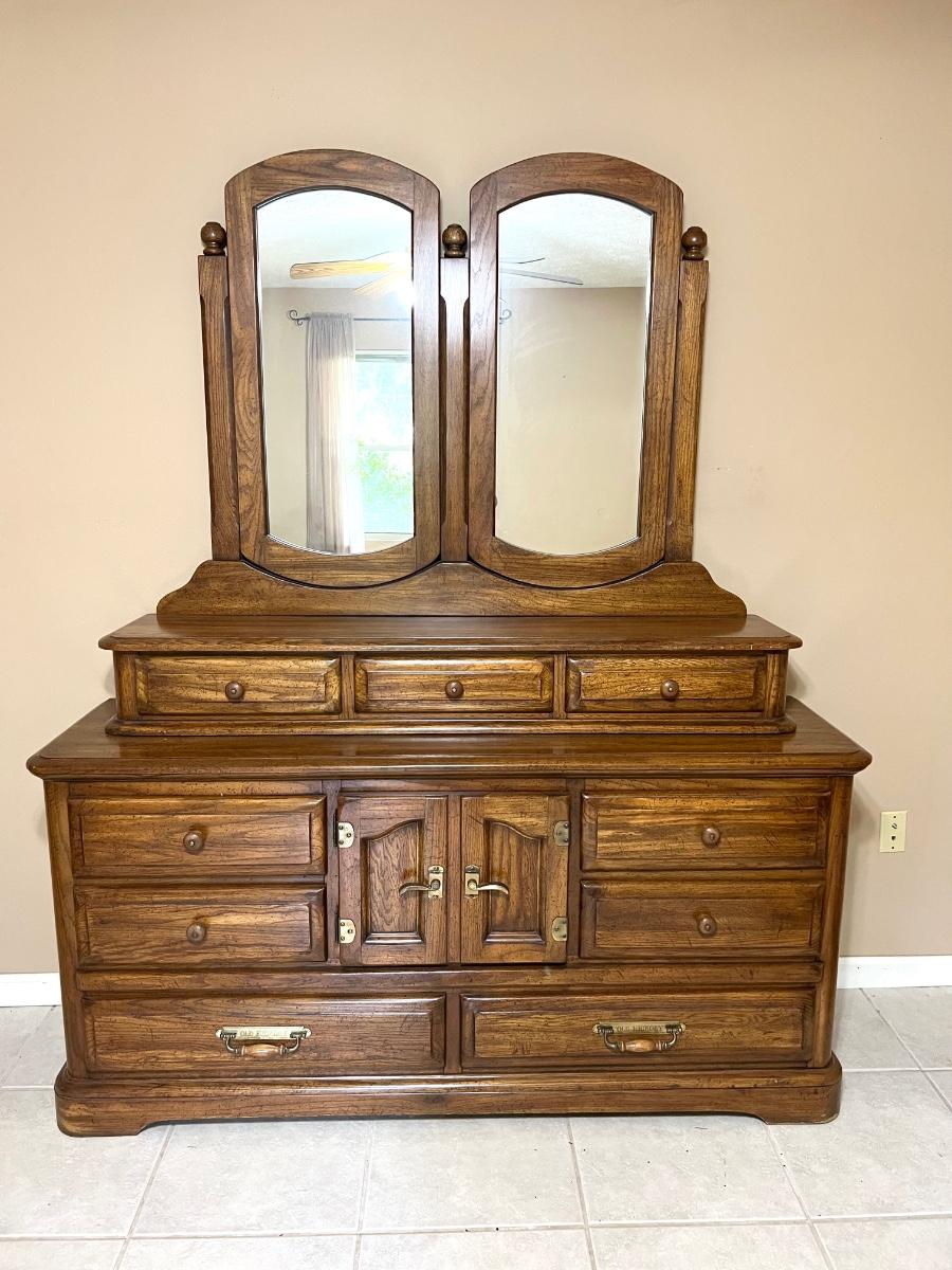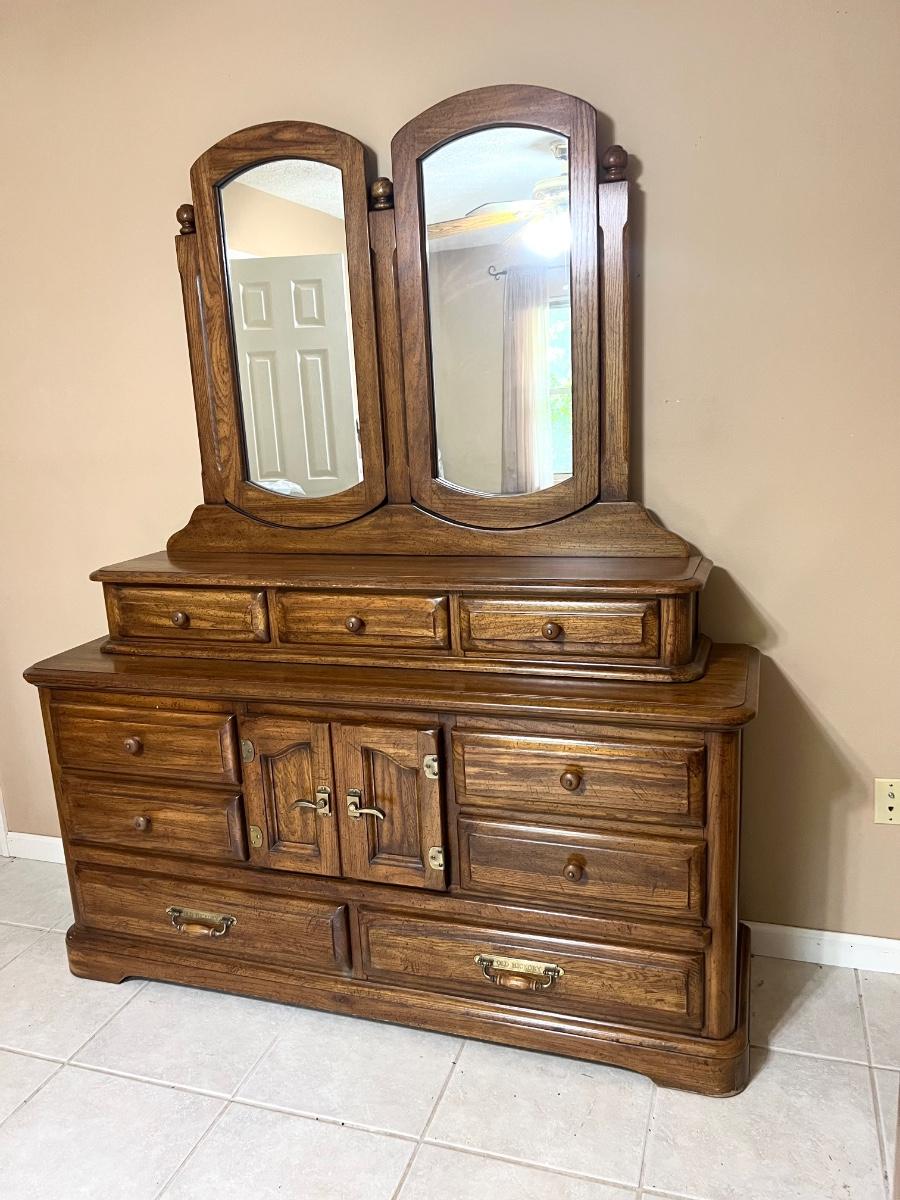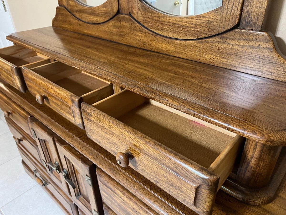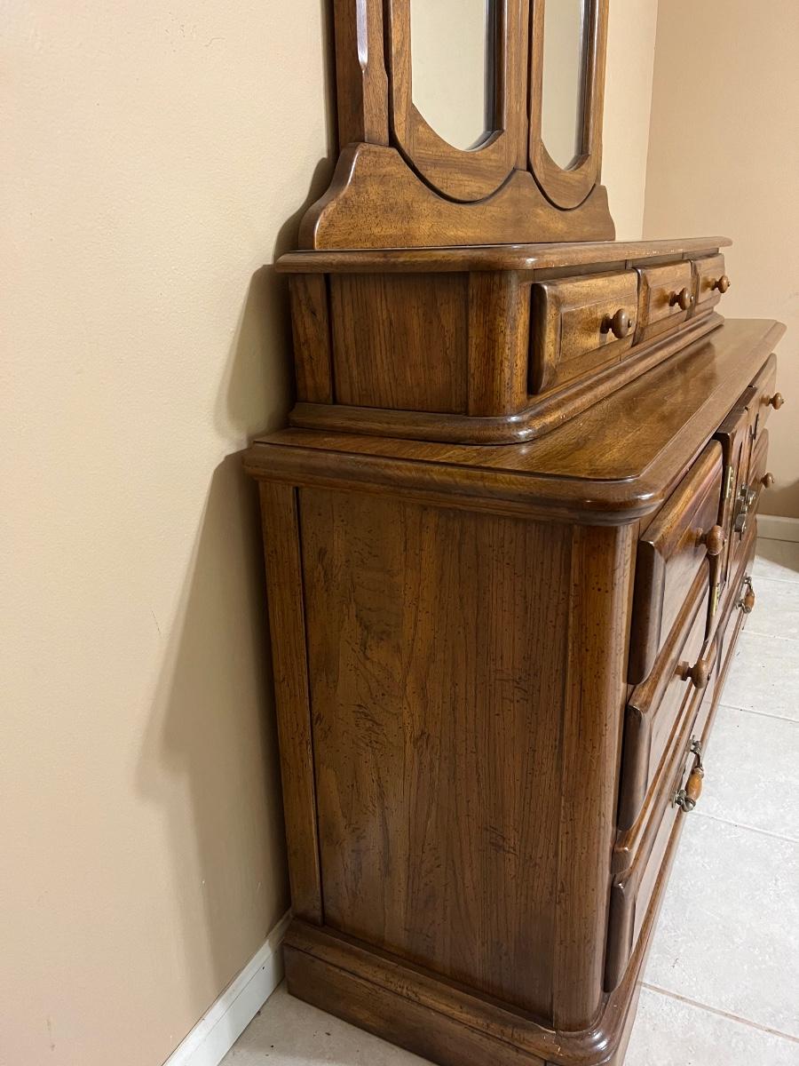 When we say solid, I mean SOLID!! It is heavy! This dresser has 11 drawers total! This is two pieces, so moving it will be easier. Measure 78 inches tall, 66 inches wide and 18 inches deep.