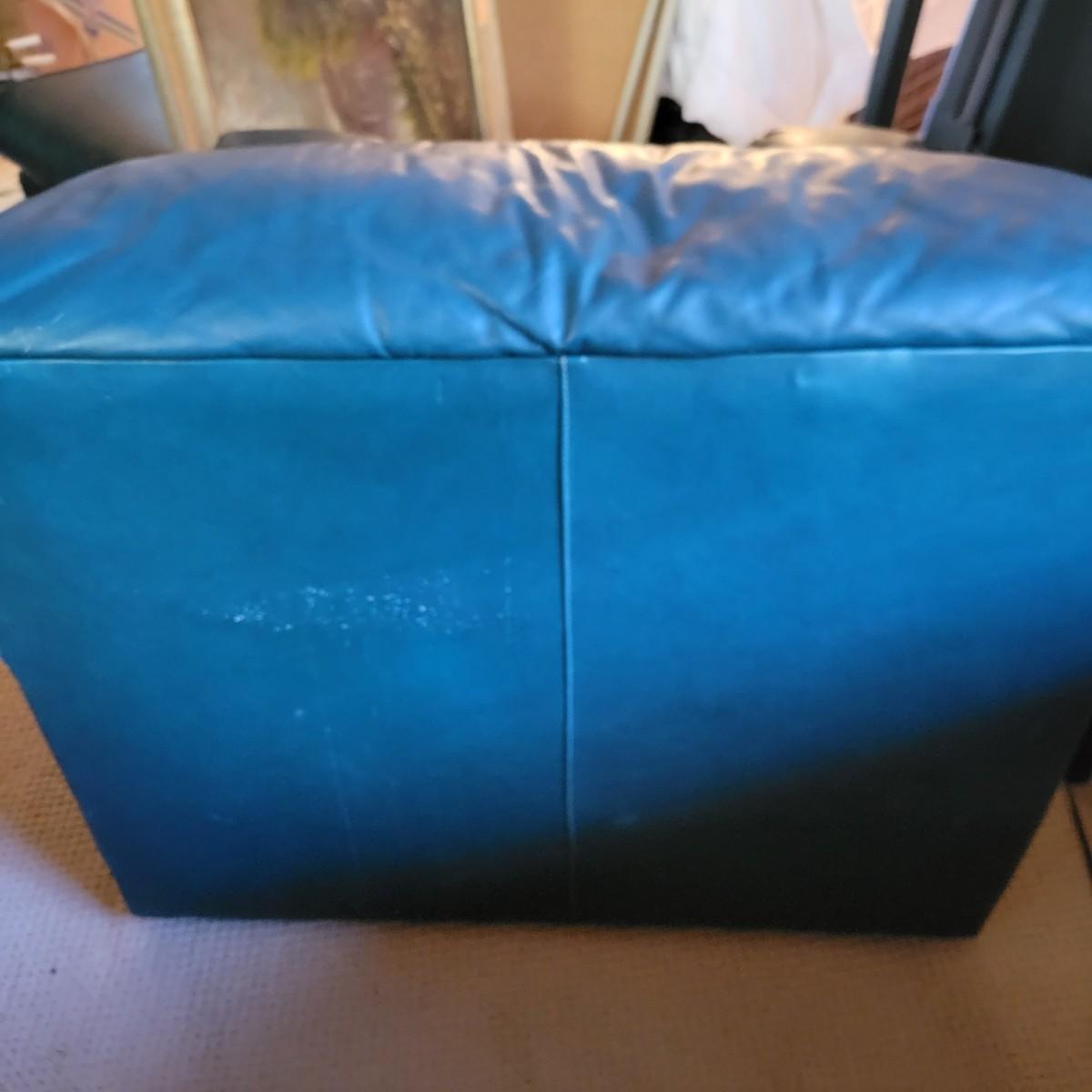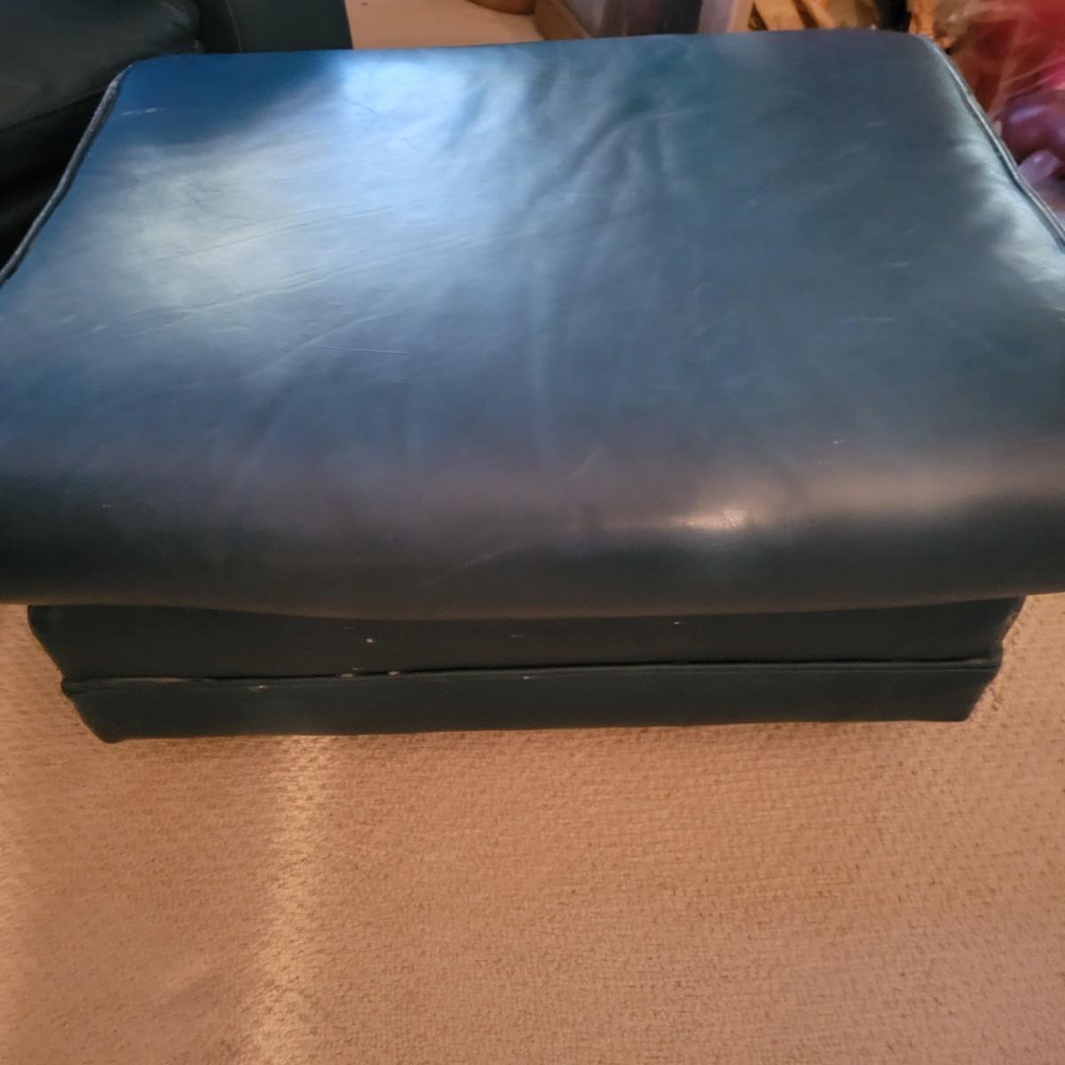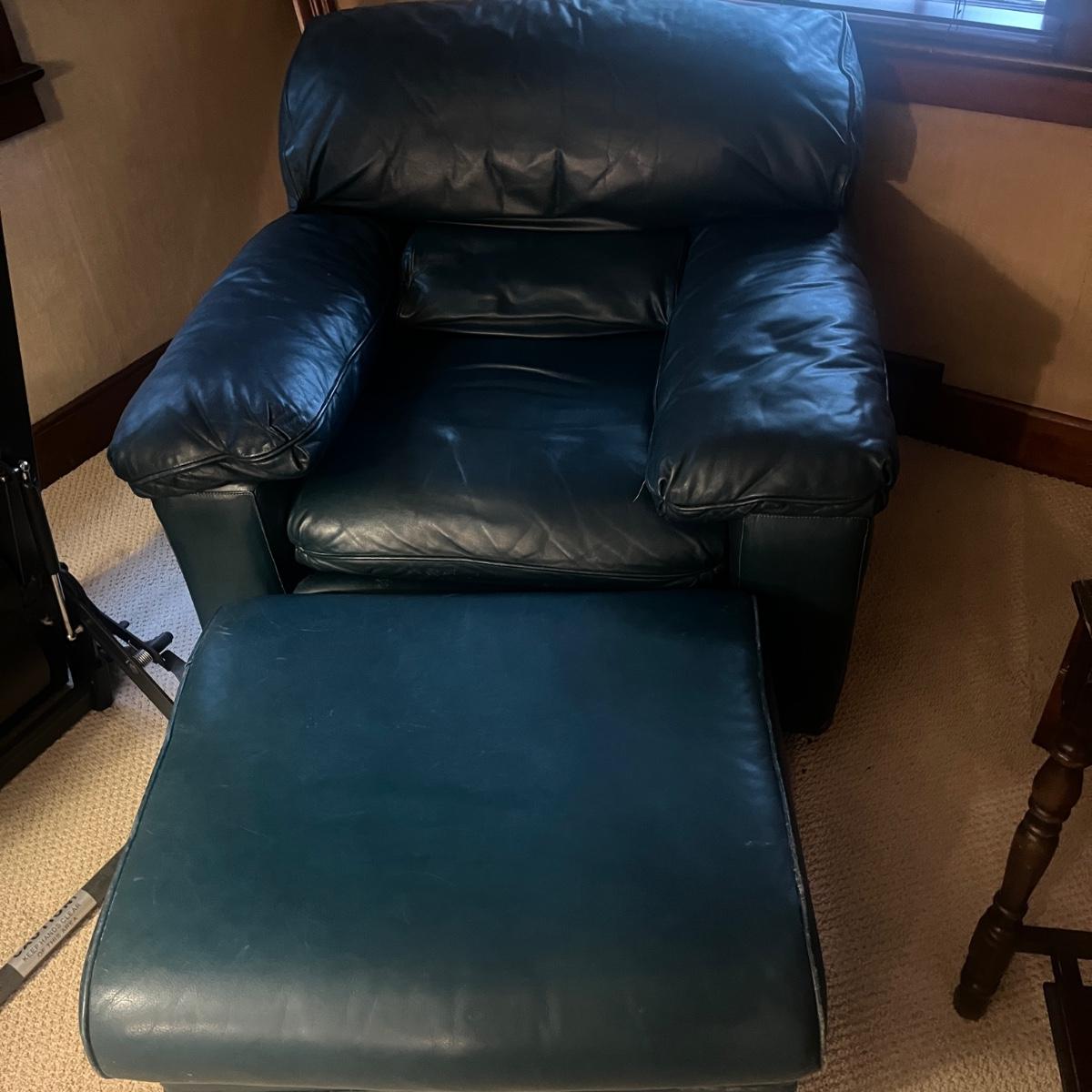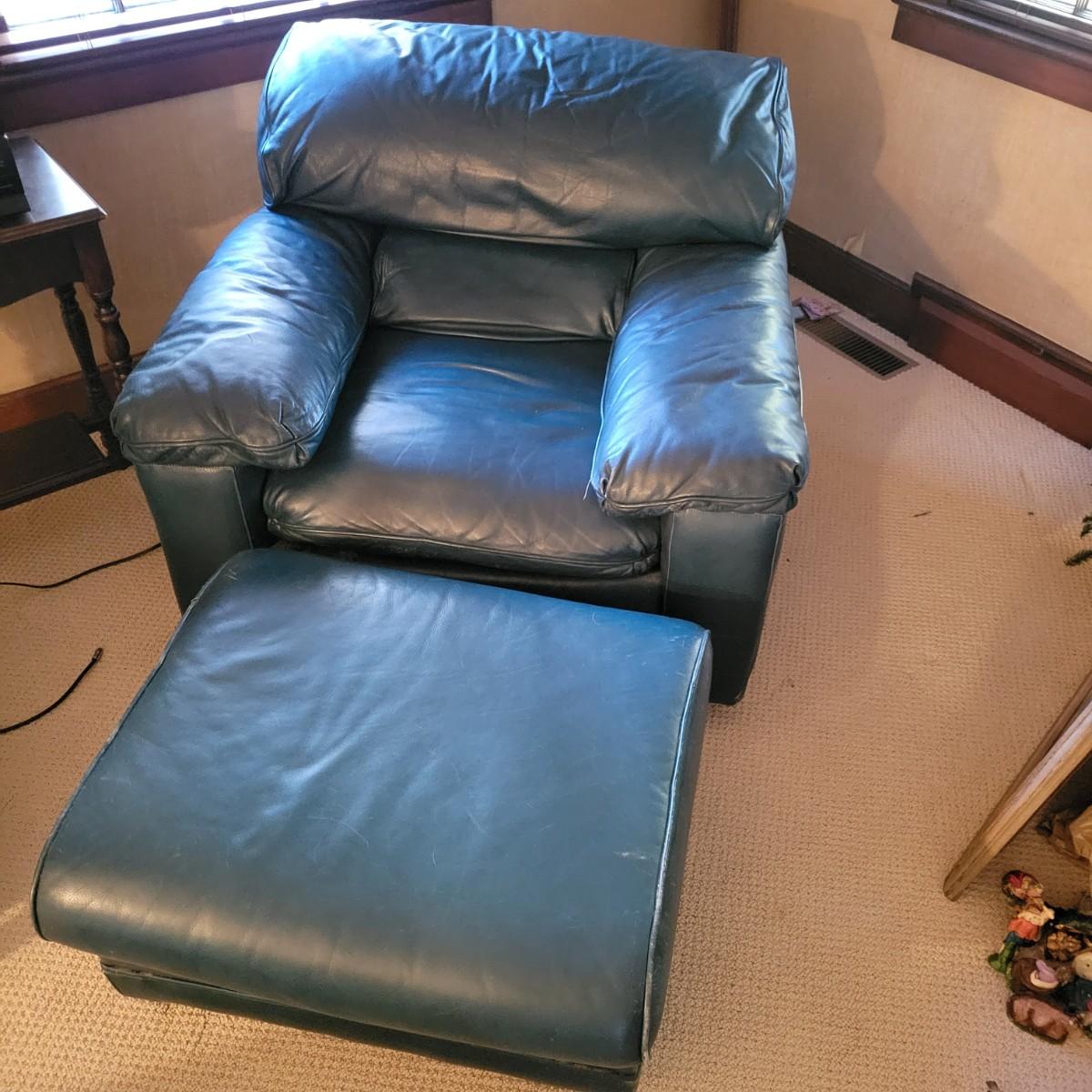 A leather chair and footstool by Old Hickory Tannery that has a teal color to it. The chair measures approximately 39" x 36" x 31.5" with a seat height of 16 5". The chair and footstool have some spots that need to be cleaned. Local pickup only. Winning bidder must bring assistance to help move and load this item due to its weight and/or size.