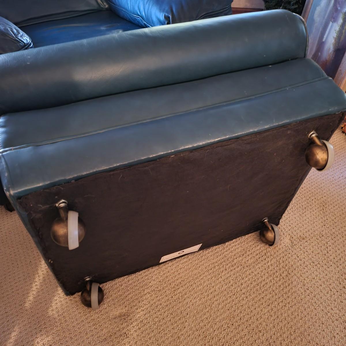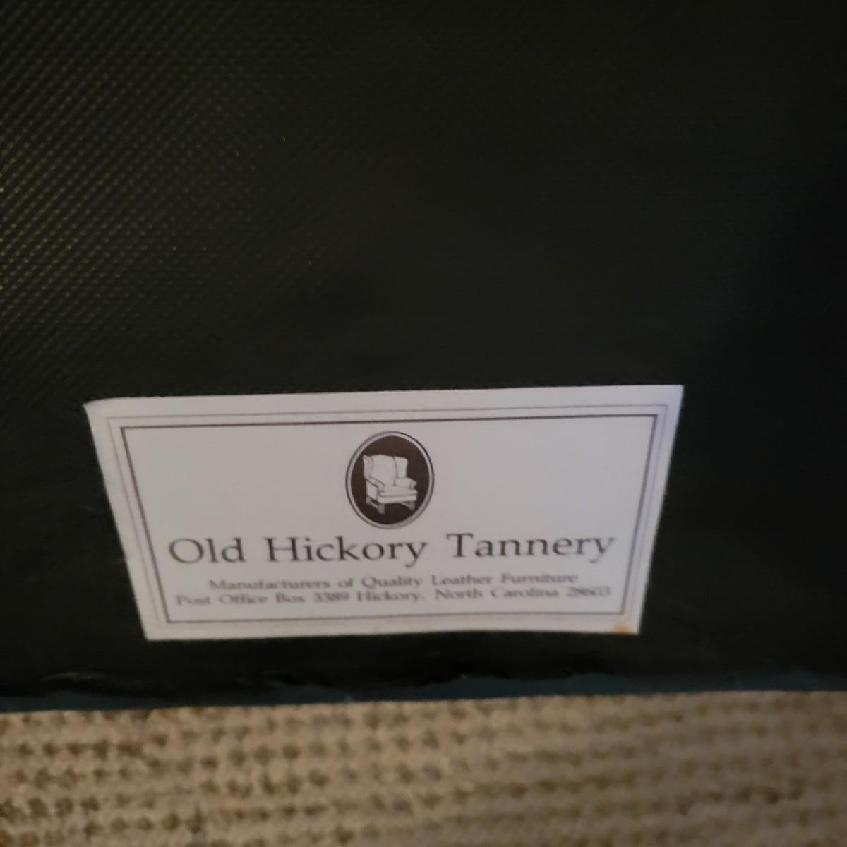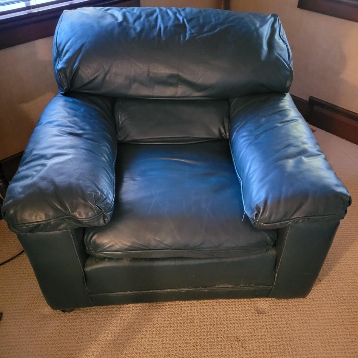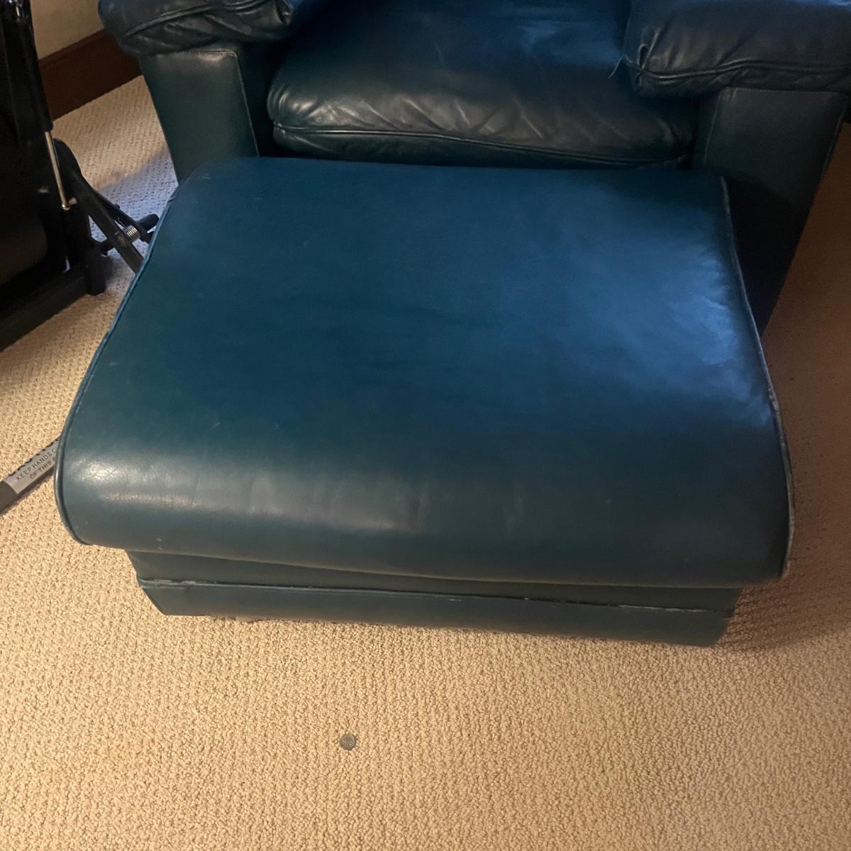 A leather chair and footstool by Old Hickory Tannery that has a teal color to it. The chair measures approximately 39" x 36" x 31.5" with a seat height of 16 5". The chair and footstool have some spots that need to be cleaned. Local pickup only. Winning bidder must bring assistance to help move and load this item due to its weight and/or size.
