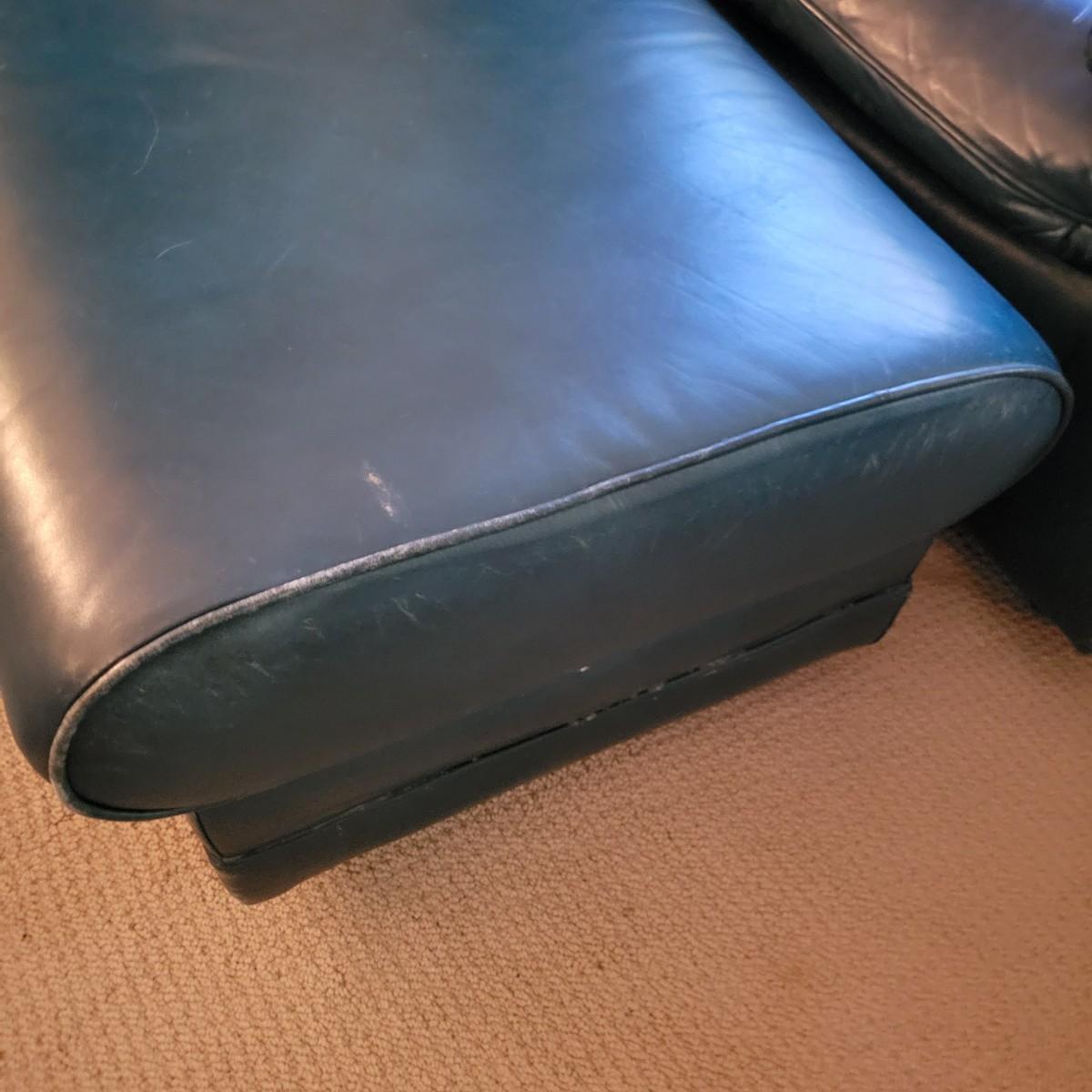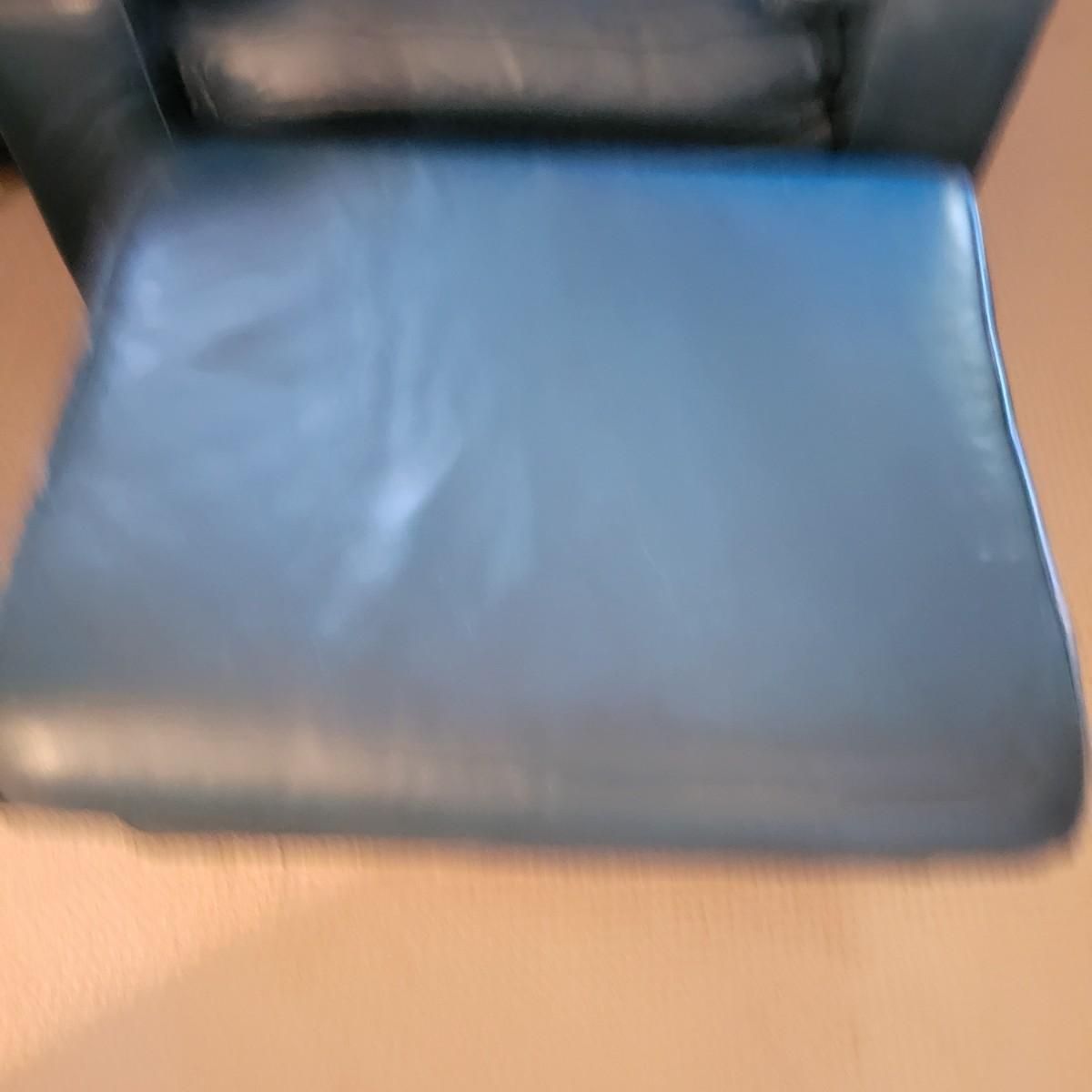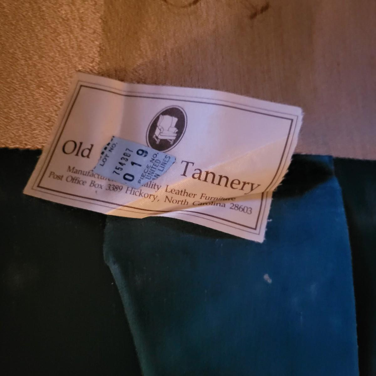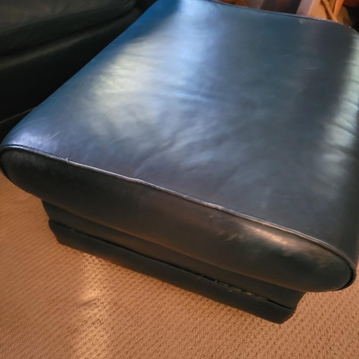 A leather chair and footstool by Old Hickory Tannery that has a teal color to it. The chair measures approximately 39" x 36" x 31.5" with a seat height of 16 5". The chair and footstool have some spots that need to be cleaned. Local pickup only. Winning bidder must bring assistance to help move and load this item due to its weight and/or size.