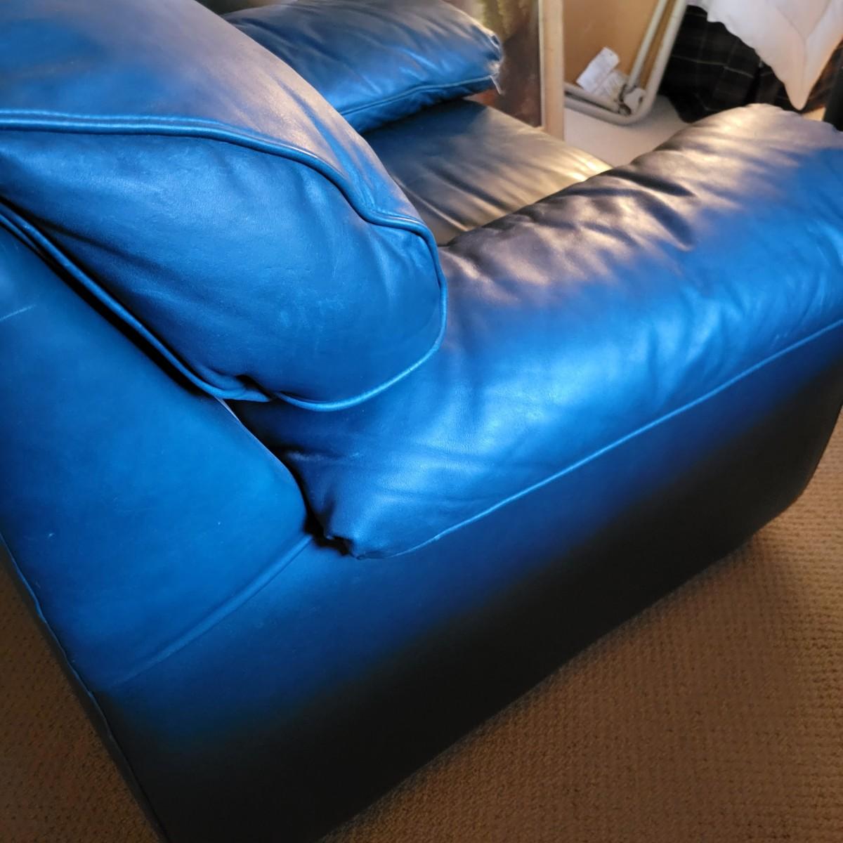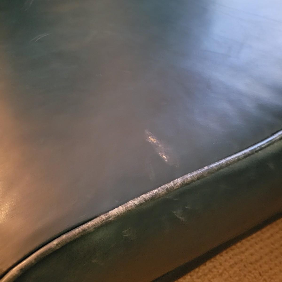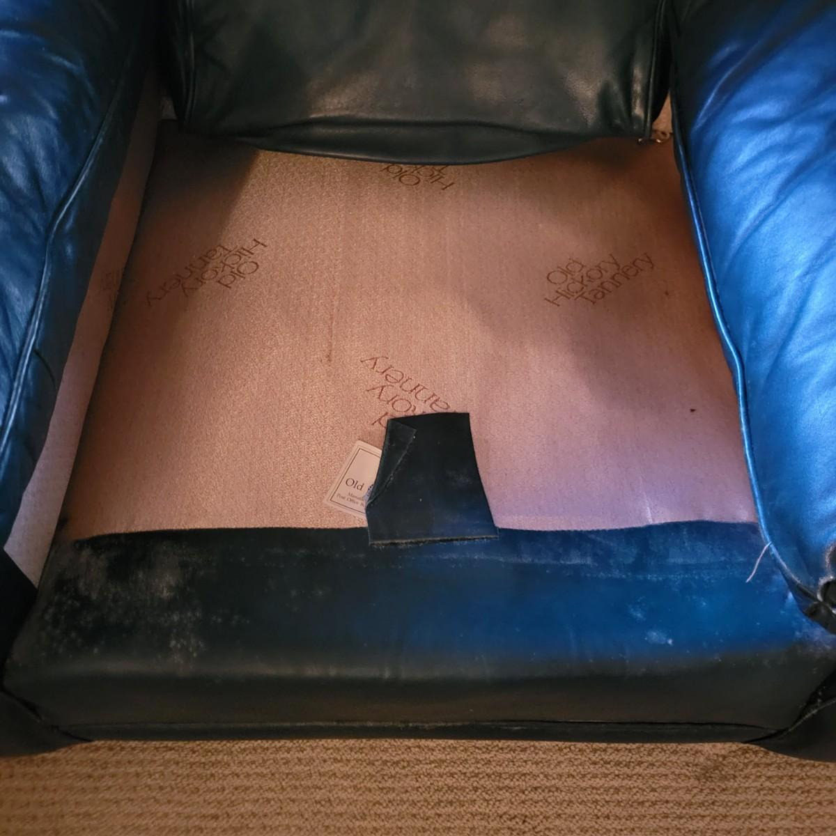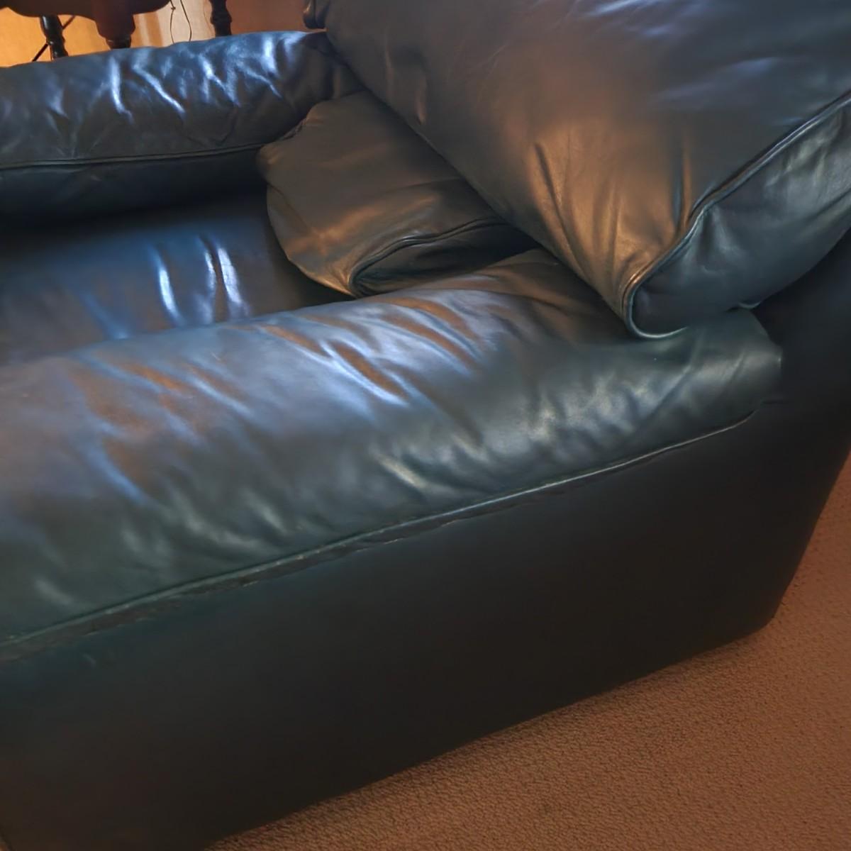 A leather chair and footstool by Old Hickory Tannery that has a teal color to it. The chair measures approximately 39" x 36" x 31.5" with a seat height of 16 5". The chair and footstool have some spots that need to be cleaned. Local pickup only. Winning bidder must bring assistance to help move and load this item due to its weight and/or size.