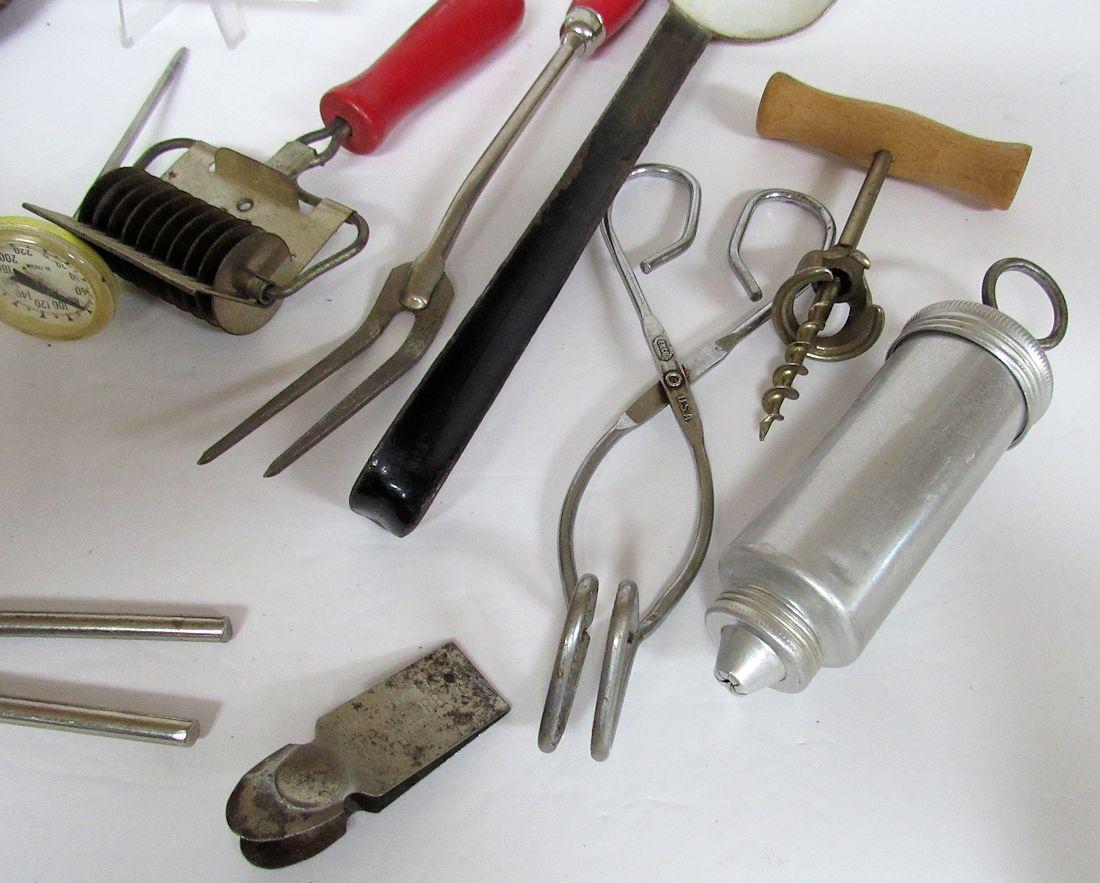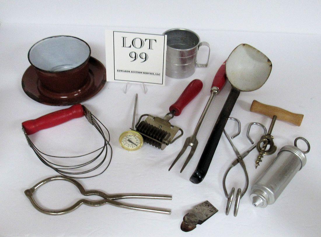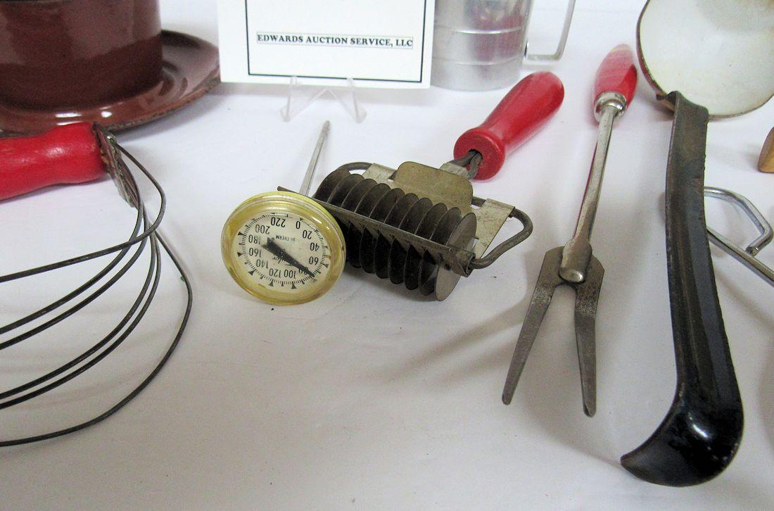Old Kitchen Utensils, Aluminum Measuring Cup, Enamelware Ladel and Bowl, Thermometer, Utensils