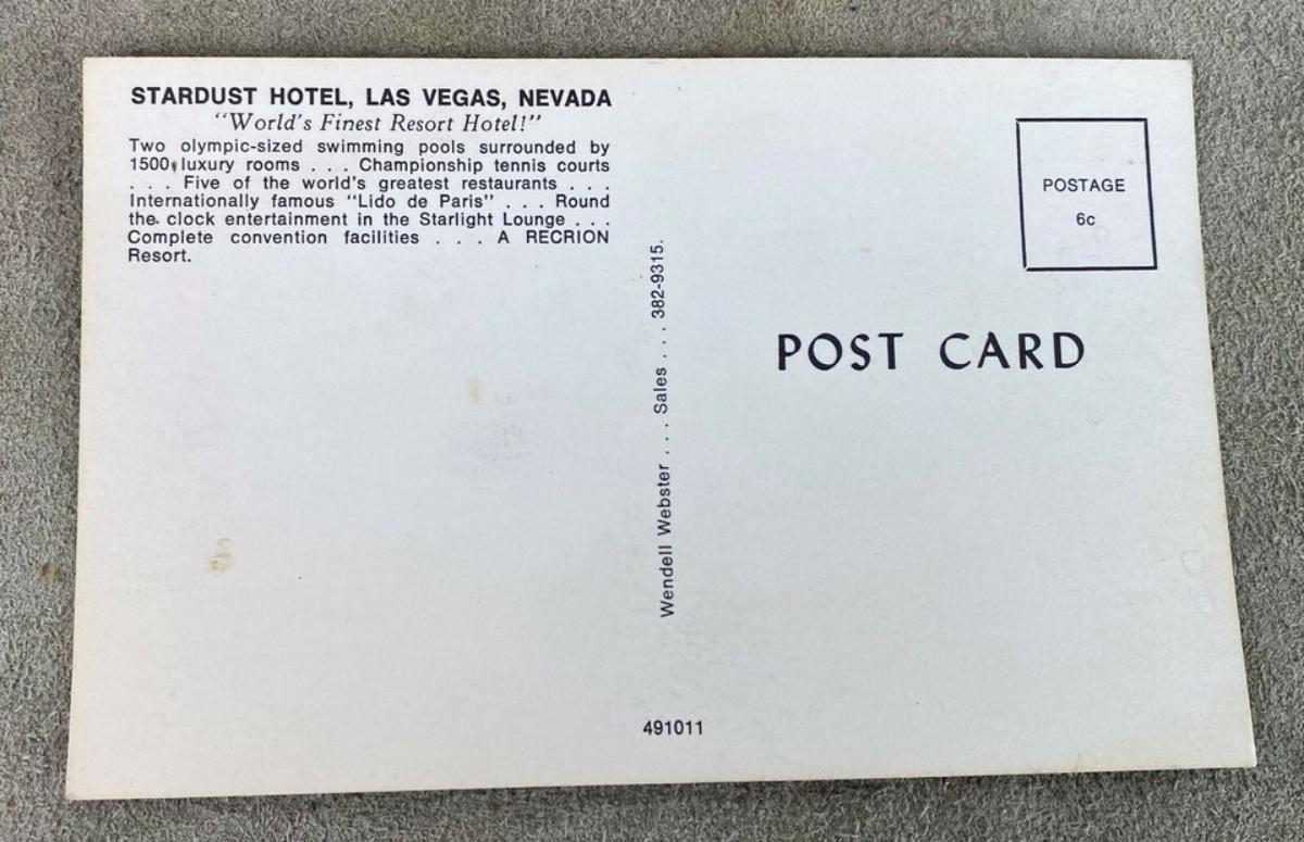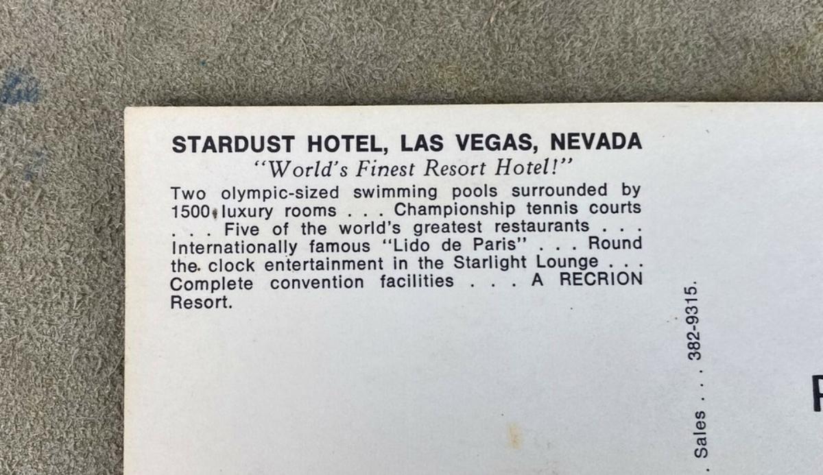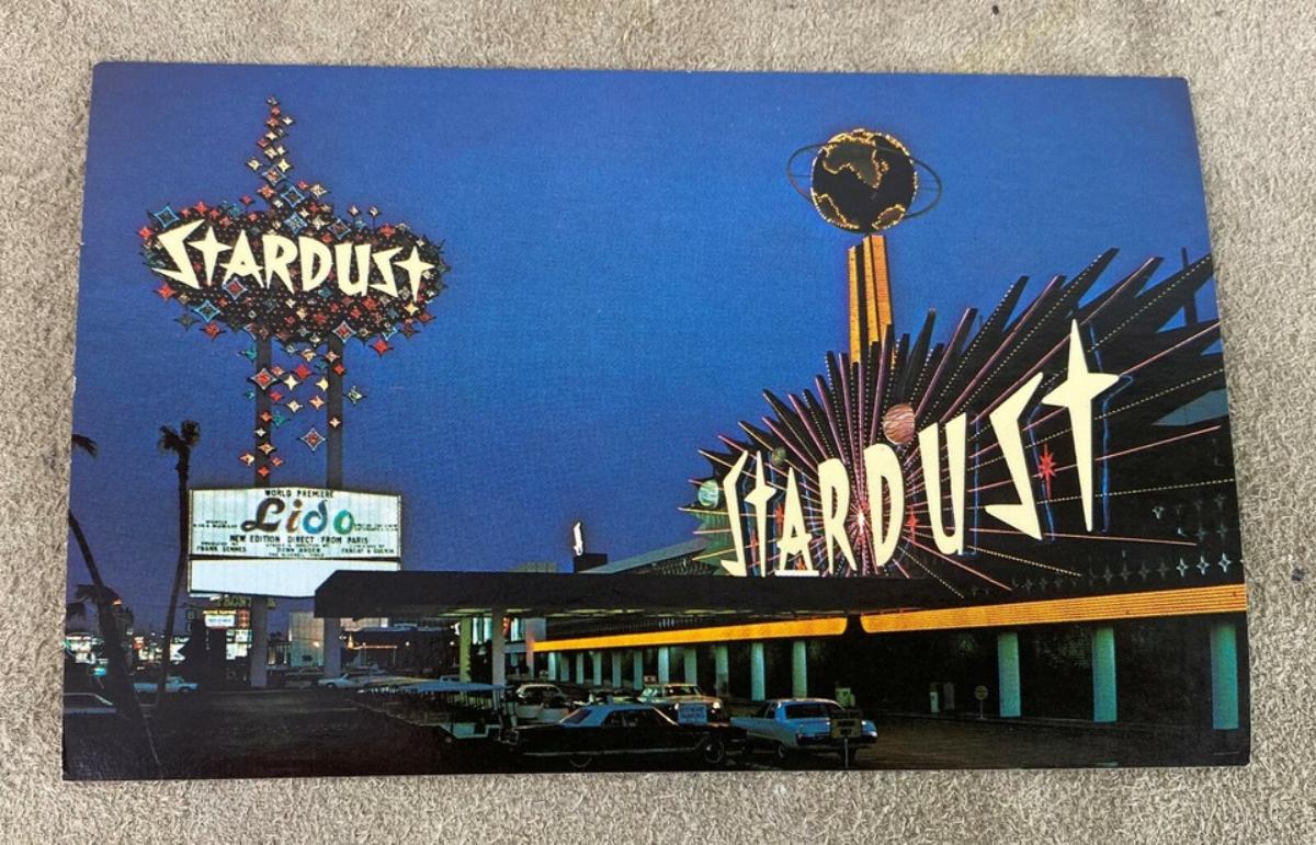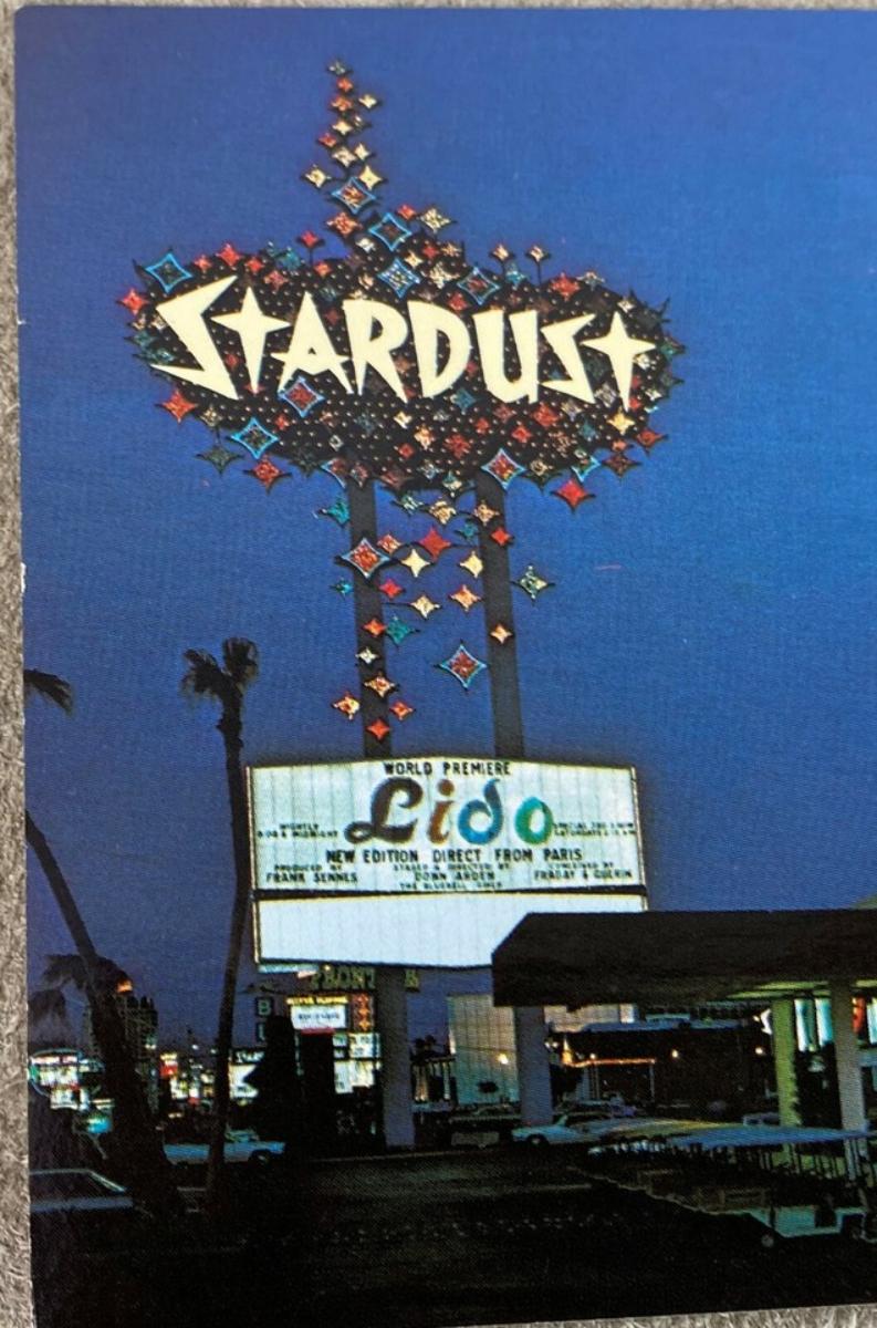 Conceived by Tony Cornero and opened in 1958 here are a pair of unused chrome postcards from the Stardust Hotel Casino on the strip in Las Vegas, Nevada...The Lido de Paris is on the marquee...circa 1960s-70's.