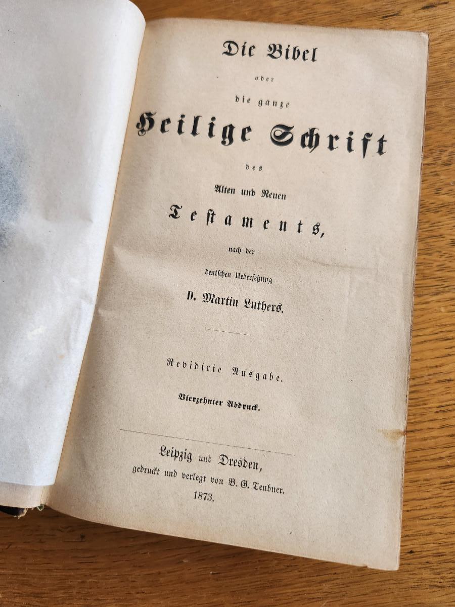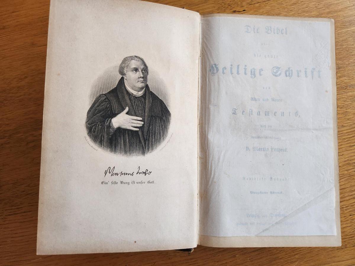 This auction lot is for an Old Lutheran Bible. This bible is dated 1873 and is printed in German. Has a great engraving of Martin Luther. Binding is rough and tumble but still somewhat solid.
