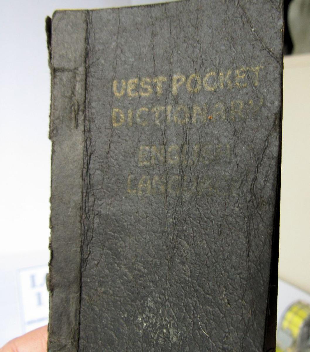The dictionary has wear but is very old. Discoloration on front of the purse, but intact and nice otherwise. Strap looks fine. Shipping is available on this lot with additional shipping and handling fees. Please see our terms for details.