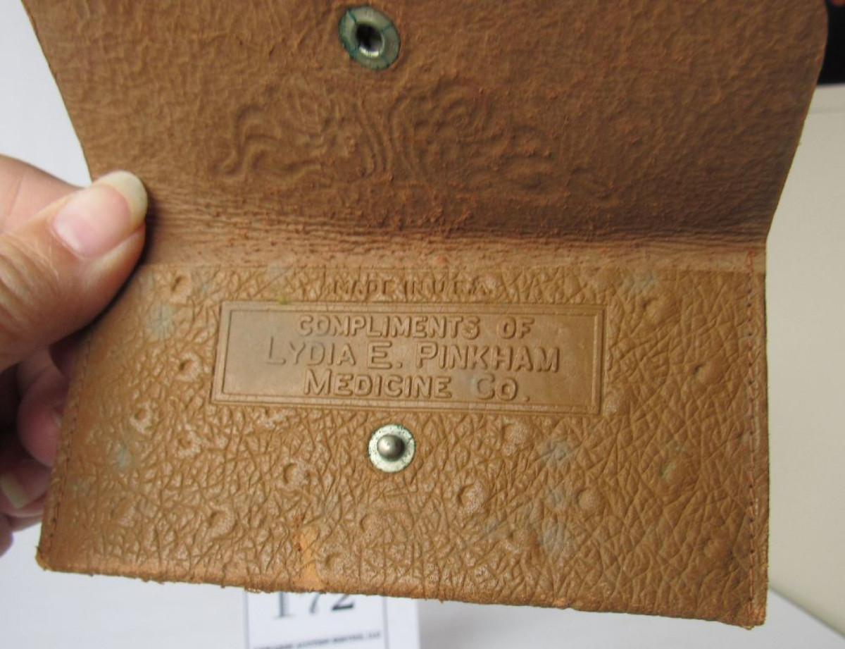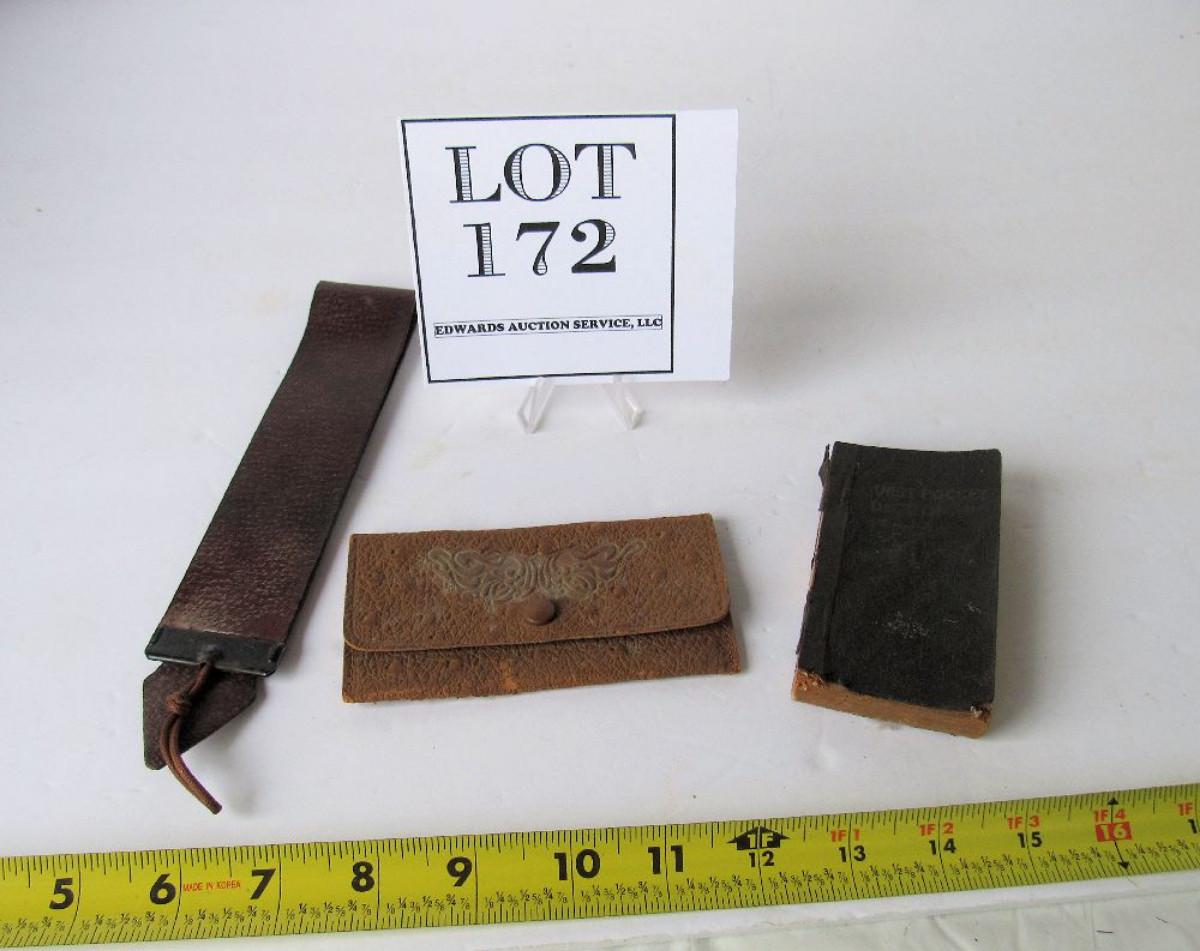 Old Lydia Pinkham Coin Purse, Valet Auto Strap Razor Shaving Strap, Antique Mini Webster Pocket Dictionary