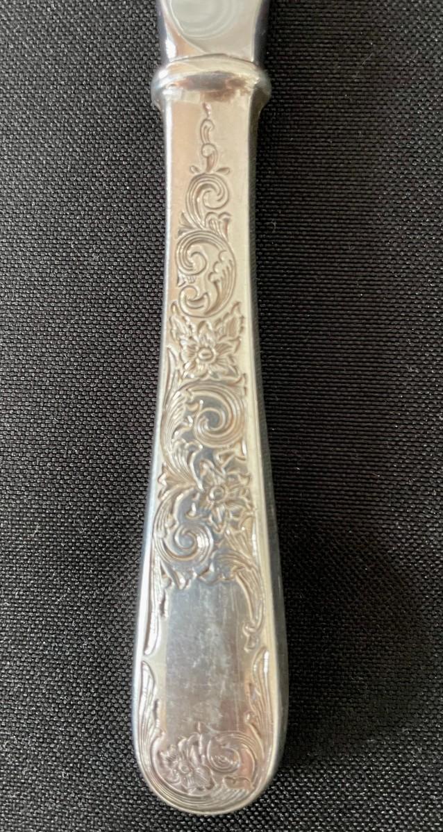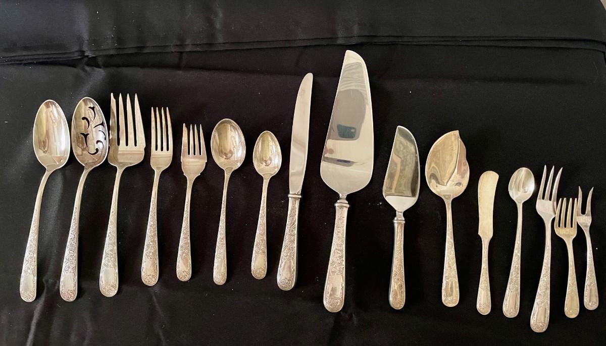 4 Dinner Knives, 8 Soup Spoons, 10 Tea Spoons, 4 Salad Forks, 6 Dinner Forks, 3 Servings Spoons with Slats, 2 Serving Spoons, 2 Serving Forks, 1 Cheese Knife, 5 Butter Spreaders, 1 Cake Server, 1 Small Pie Server, 1 Olive Fork, 1 Lemon Fork, 1 Oyster Fork, 1 Demitasse Spoon