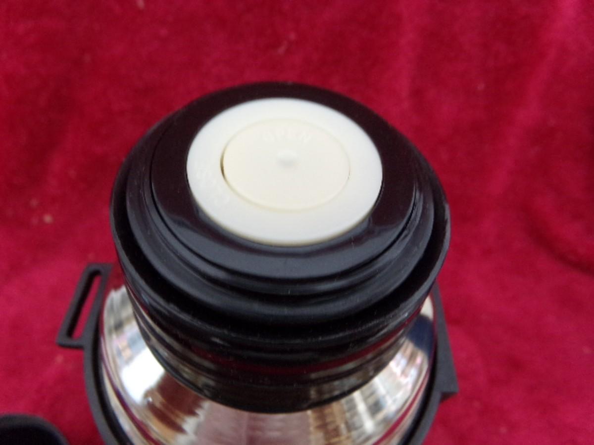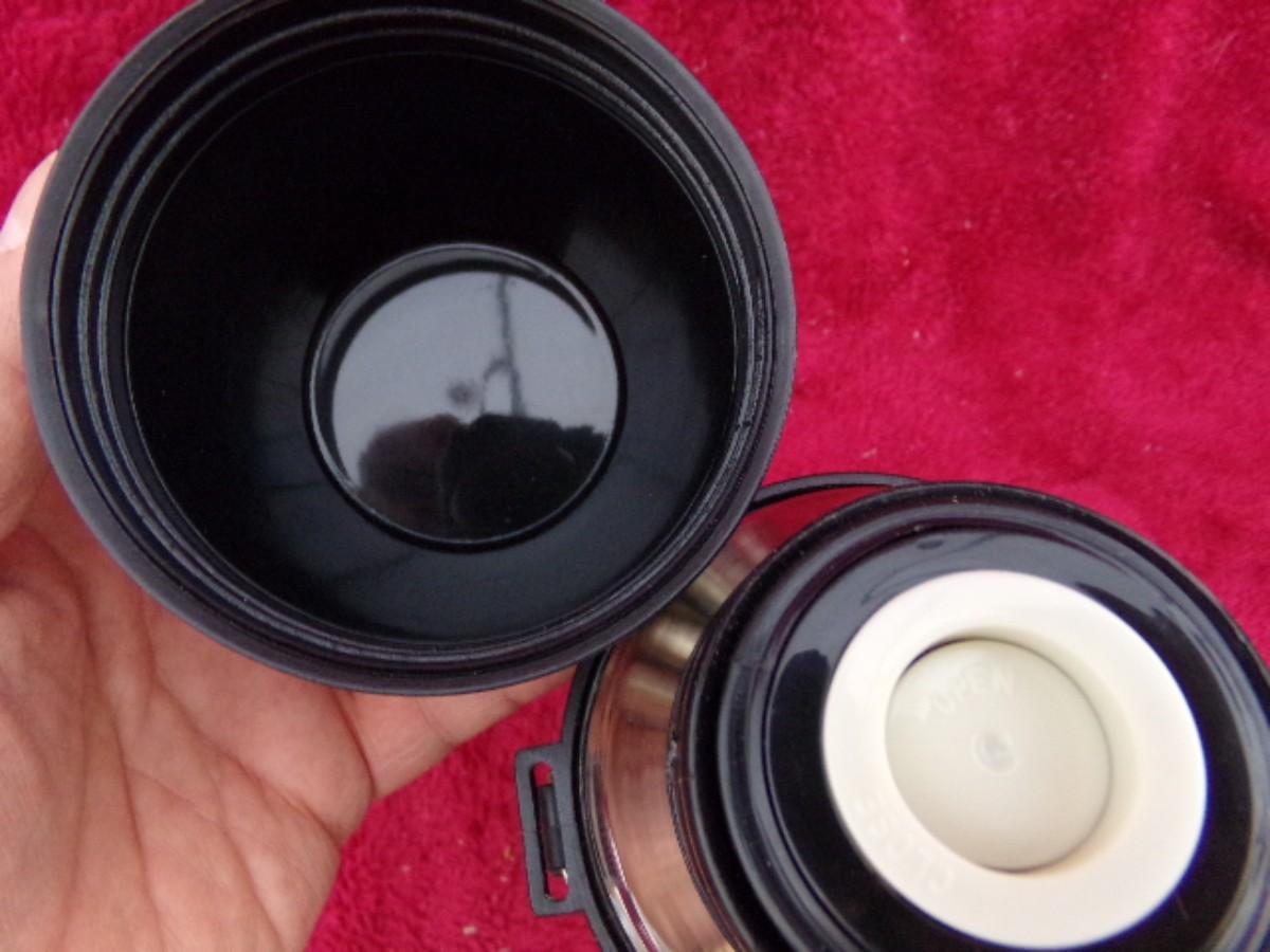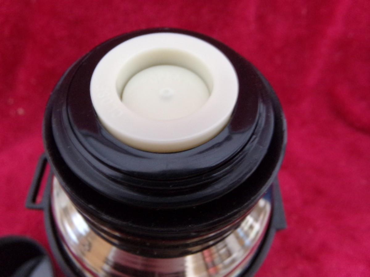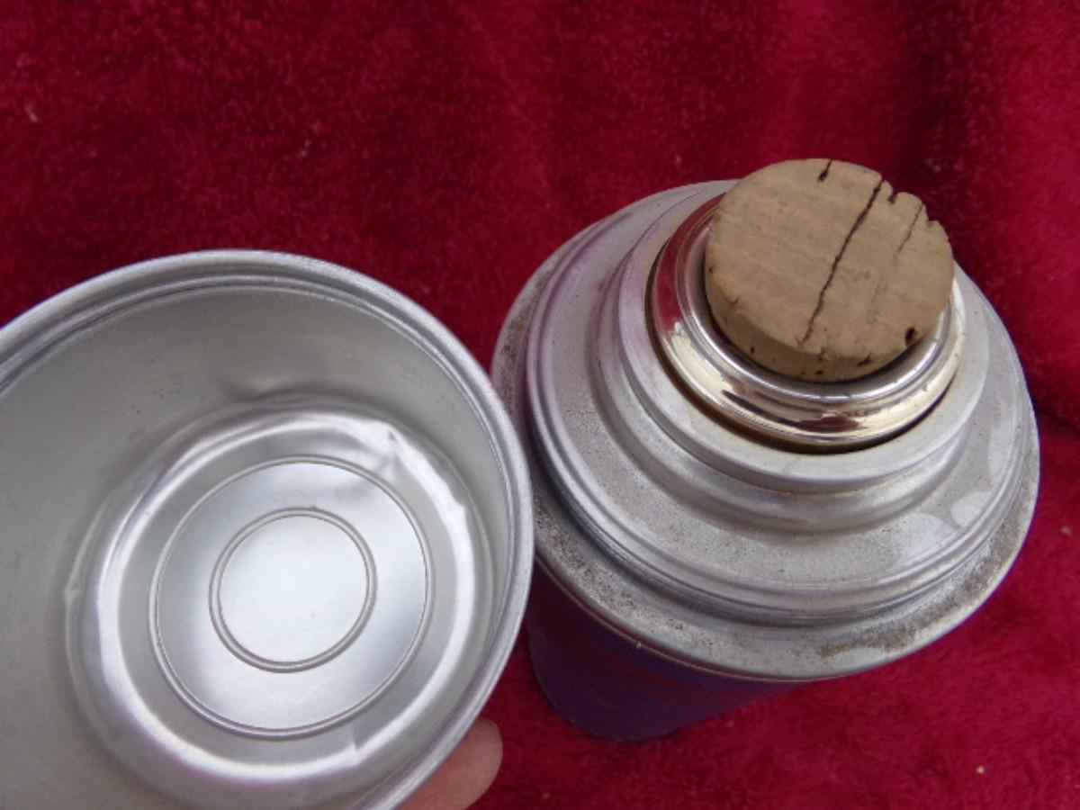 Old meets New thermoses. Old timer has glass liner, cork stopper and single wall cup. New guy is ALL stainless steel bottle w/pop-it easy pour stopper and insulated cup. A pair to draw to. What a contrast.