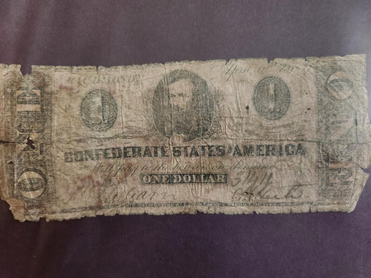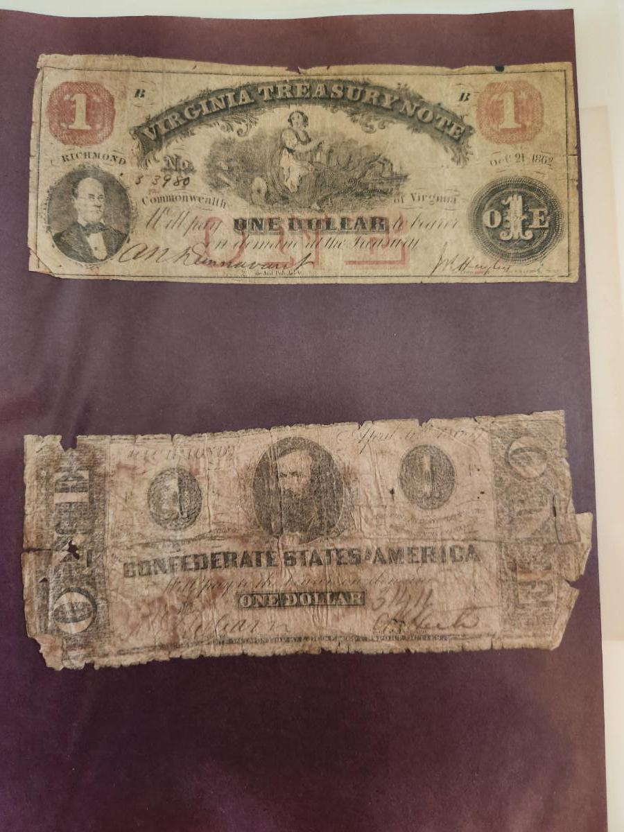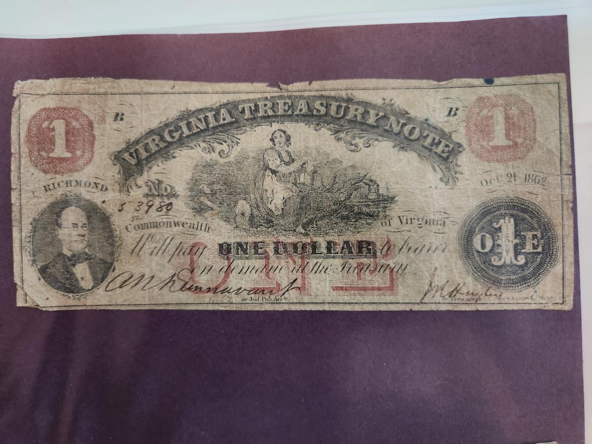 This auction lot is for two Old Money Notes. The first is a One Dollar Virginia Treasury Note. This note is hand numbered and appears to be authentically signed. Dated October 21, 1862. There is nothing printed or written on the verso. The second is a one Dollar Confederate States of America Note. It is rough but appears to have hand numbering and authentic signatures. There is nothing printed or written on the verso - however, there is a paper attached which seems to be holding the bill together - please see photo. Note: both these bills were found in the old German Family Bible which was sold in our last auction.