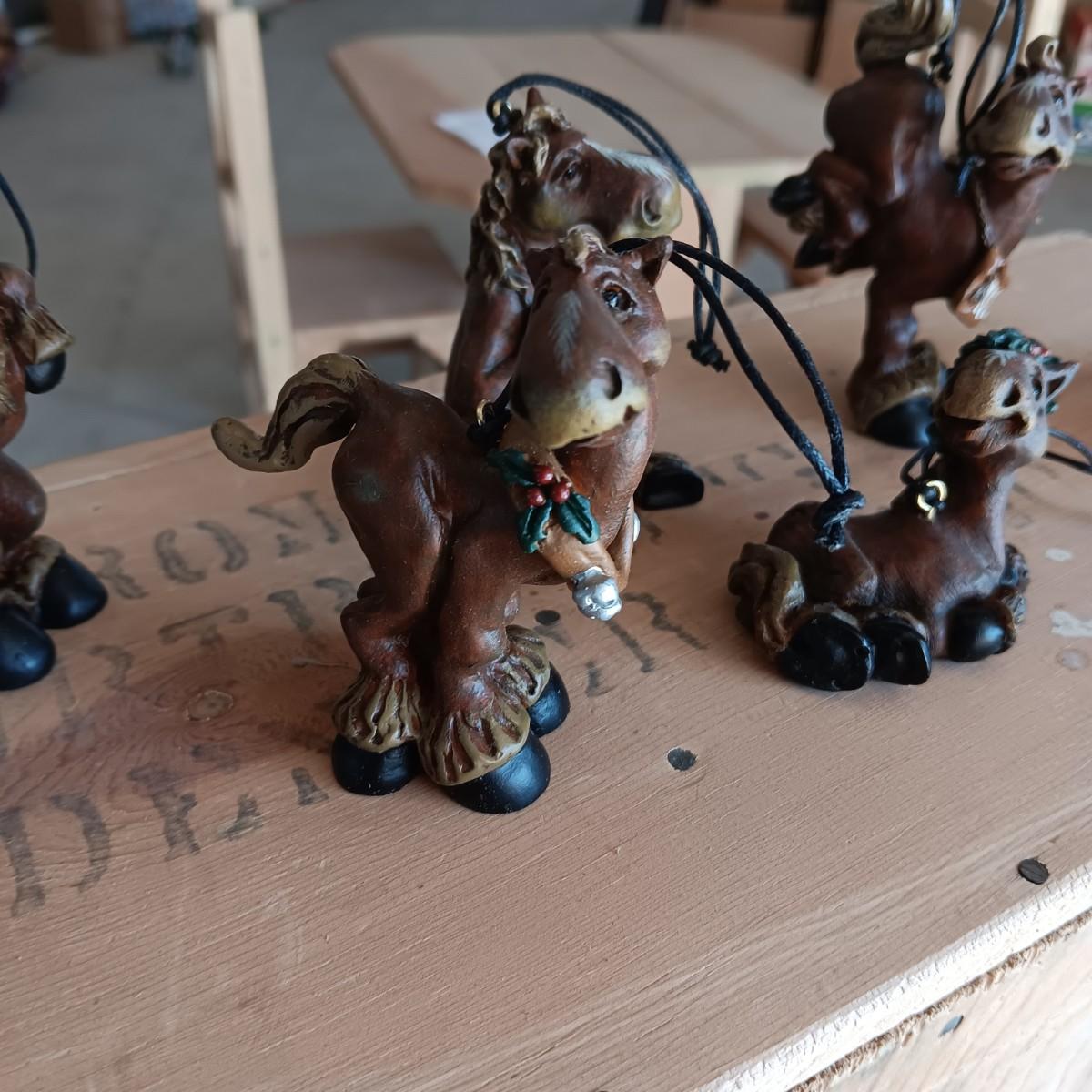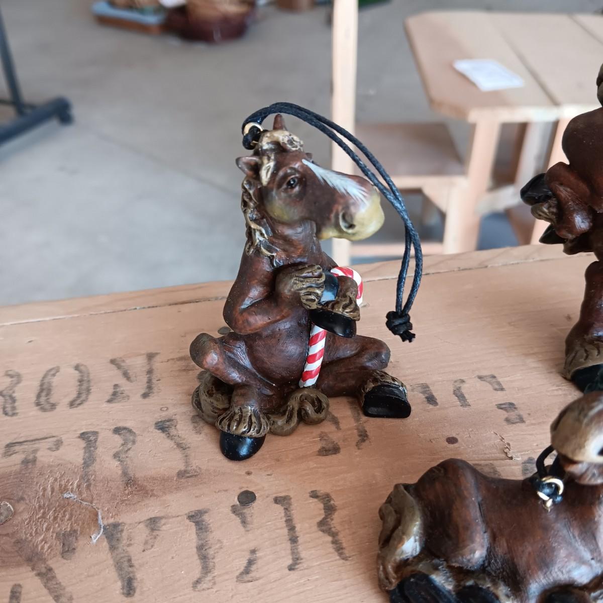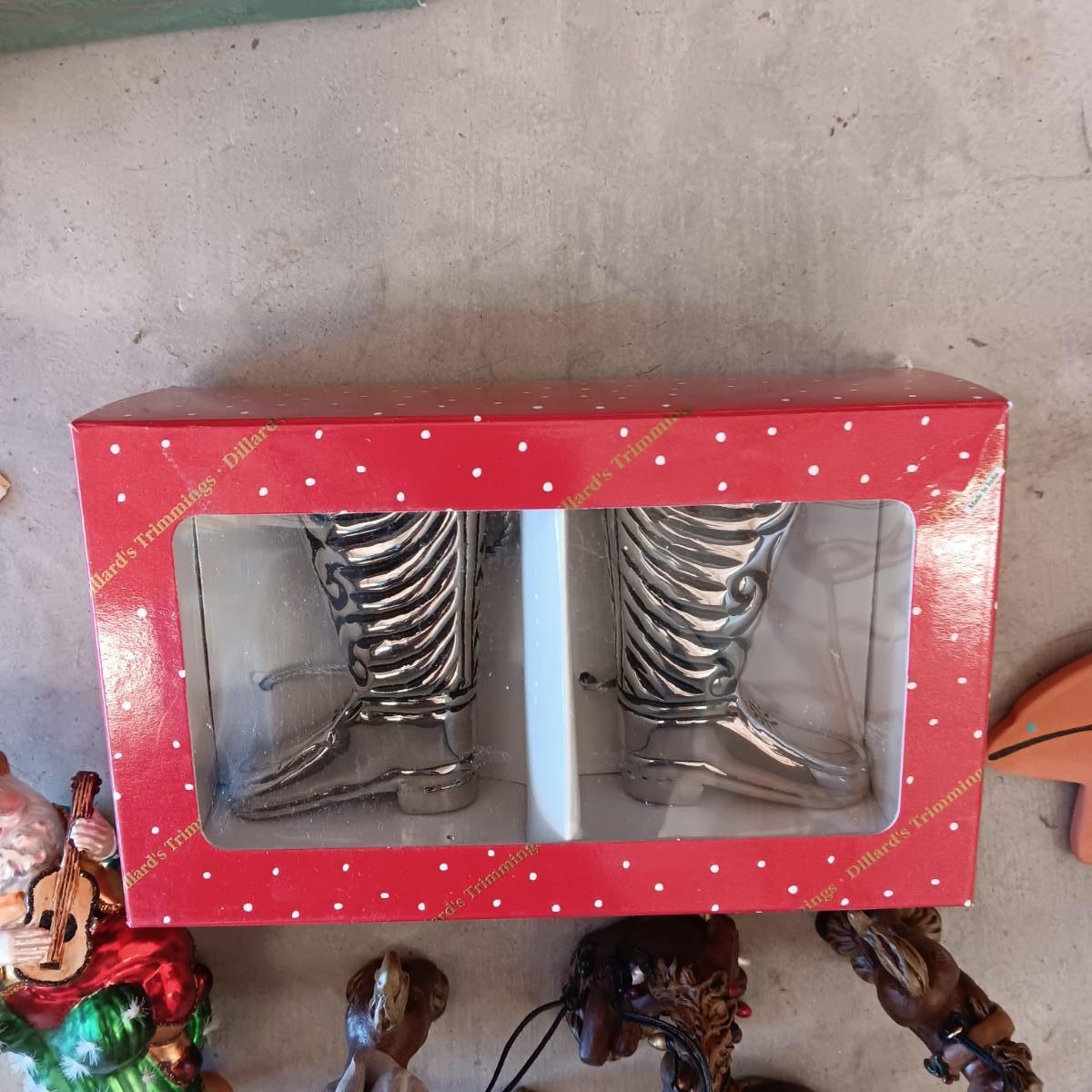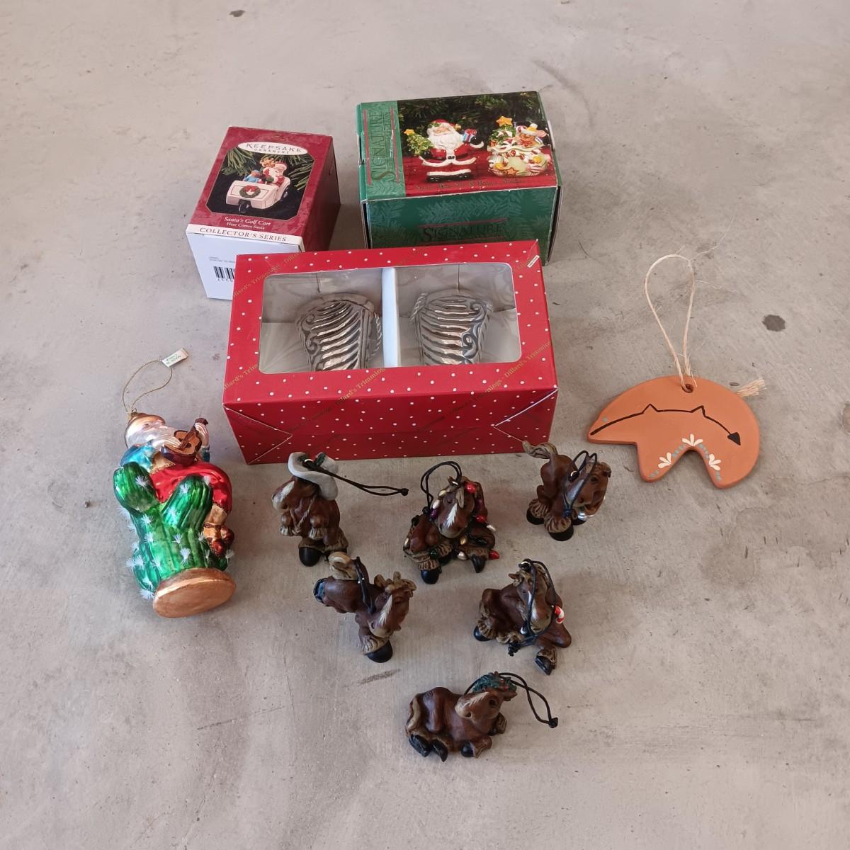 HALLMARK SANTA, DILLARD'S SANTA BOOTS & HANDCRAFTED GOOFY HORSE ORNAMENTS PLUS CHRISTMAS SHAKERS
