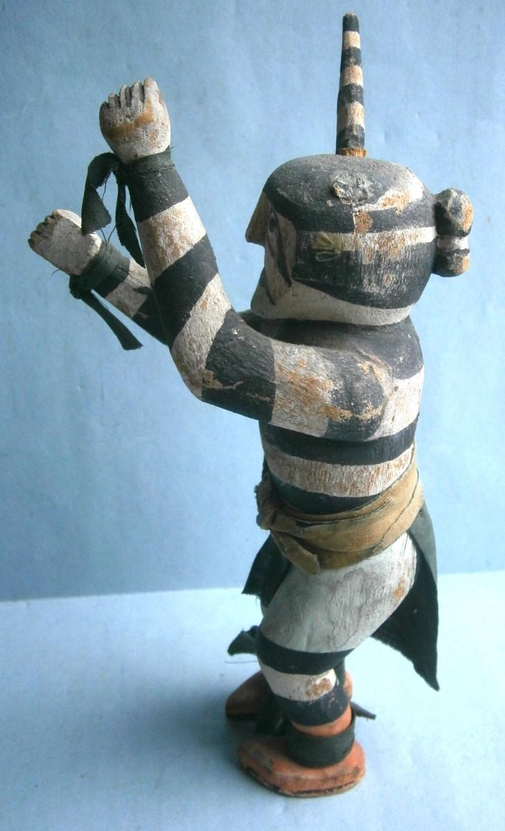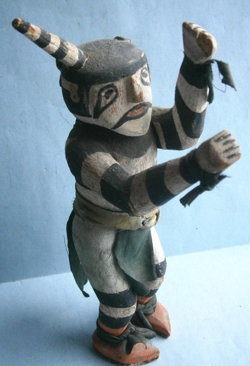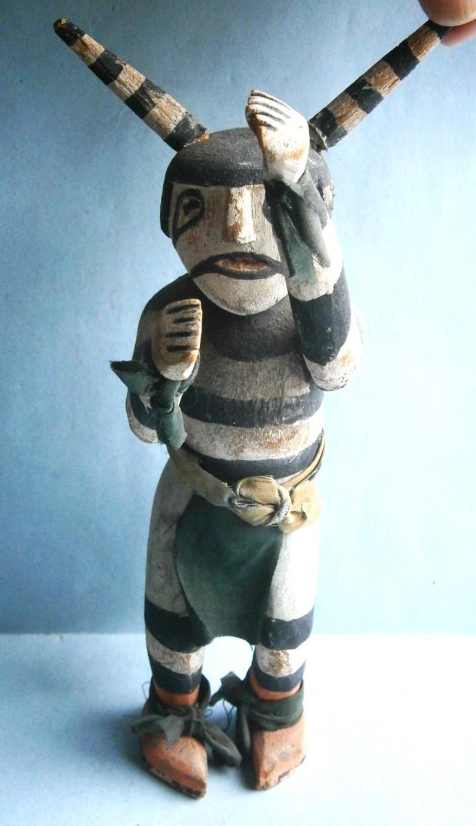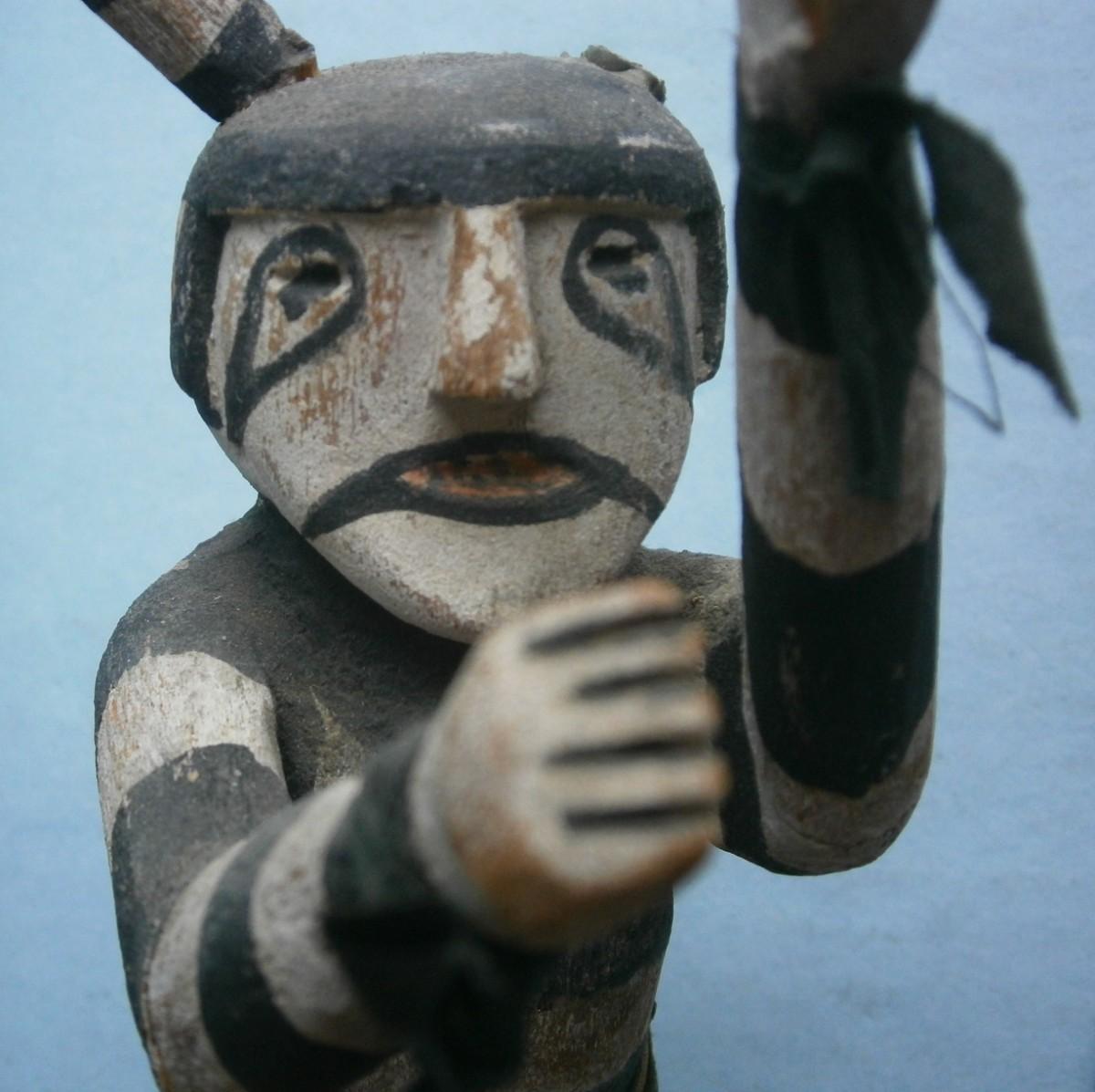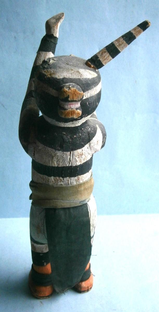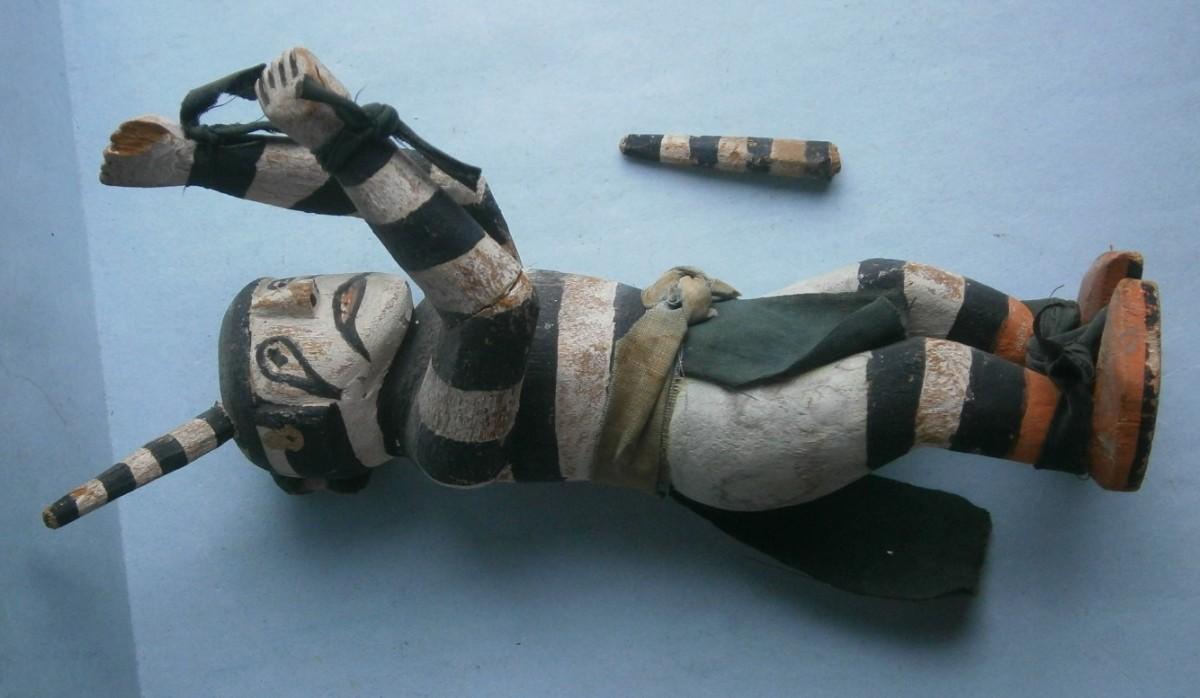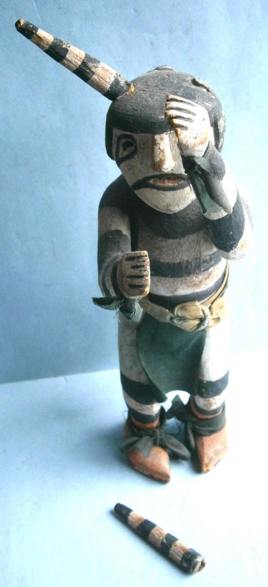 Old Native American Kachina Doll from the Early 1900's, 8 1/2 in. tall, painted wood with cloth, missing base (would have been inscribed on bottom with name of maker), one horn was repaired and is broken off again, sold as incomplete and damaged. A nice early example.