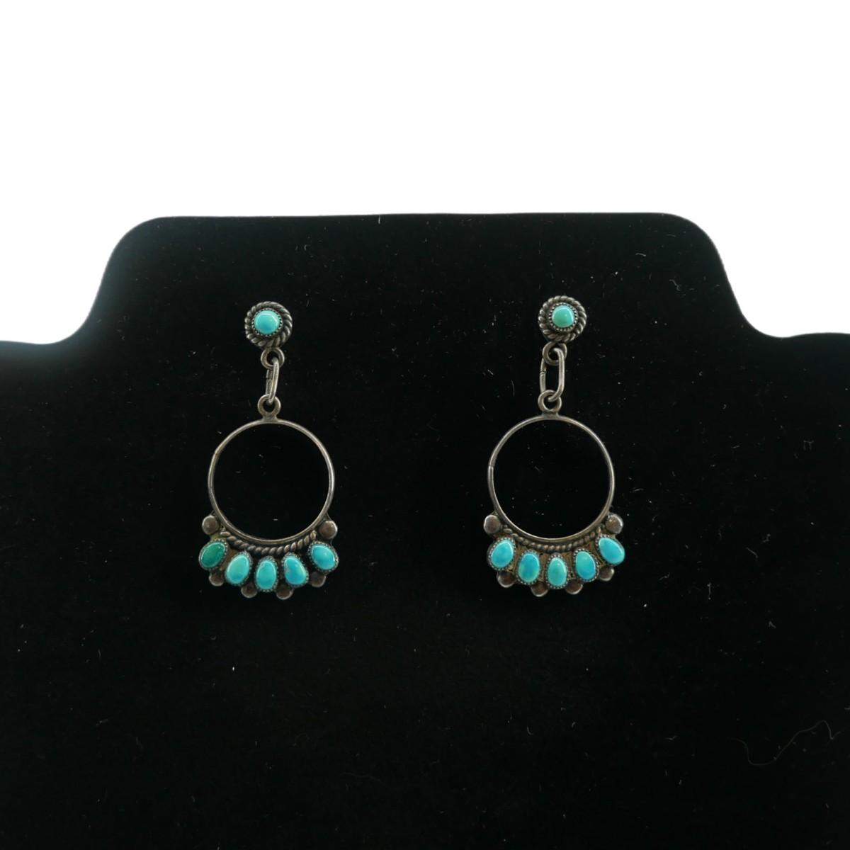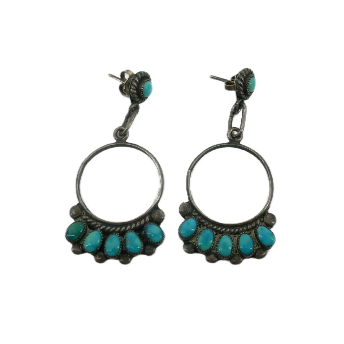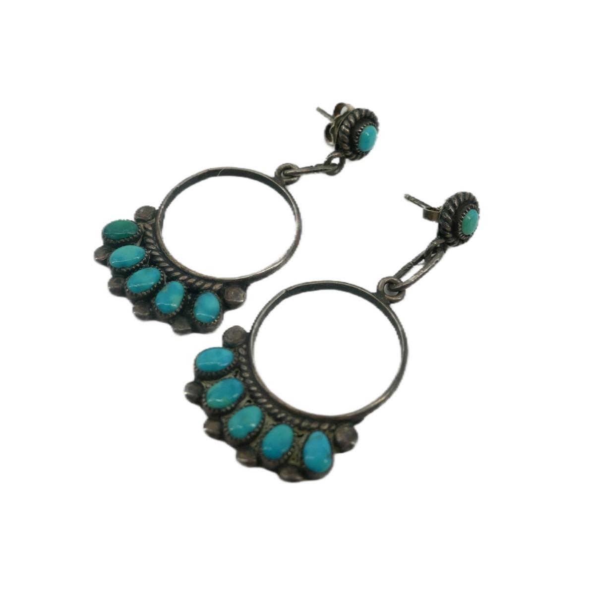 Gorgeous old pawn drop hoop earrings. Six pieces of turquoise on each earring, measures approximately 1" x 1.5", total weight of both is 8g.