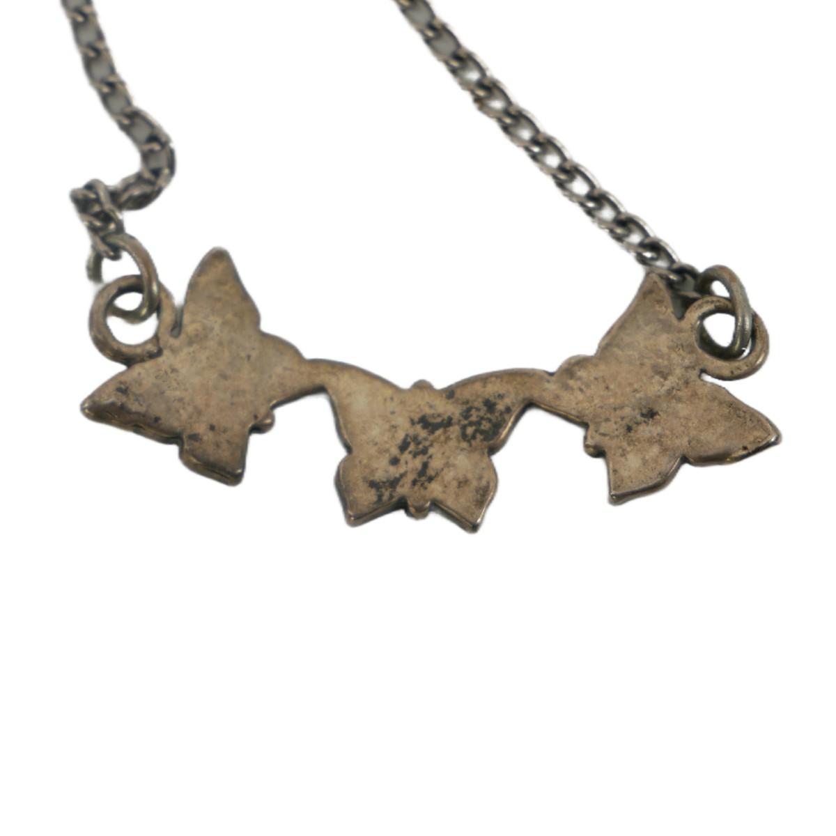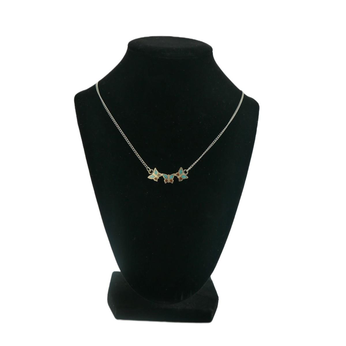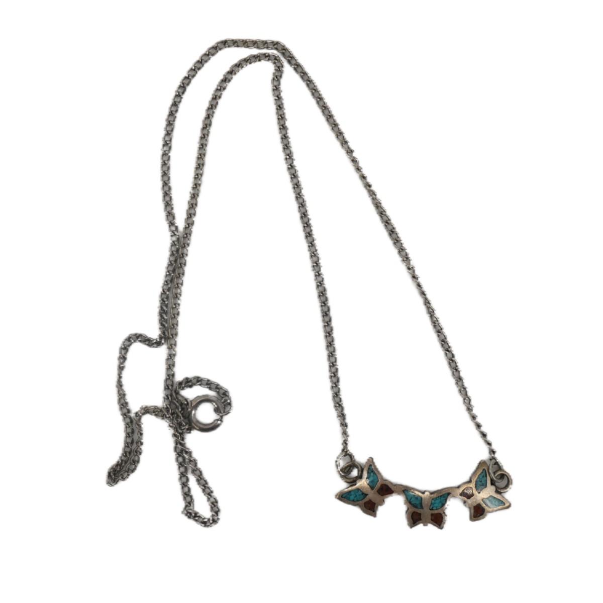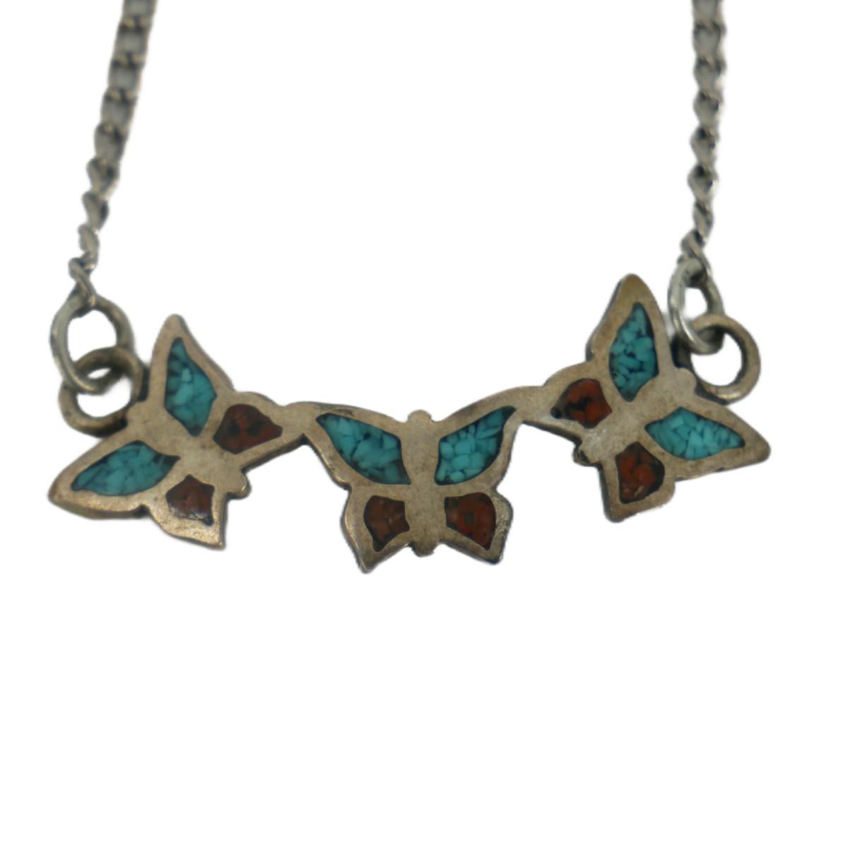 Old Pawn Native American Navajo turquoise and coral inlay necklace with three butterflies. Pendant is approximately 1.5" x 0.5", chain is approximately 18", total weight is 3g.