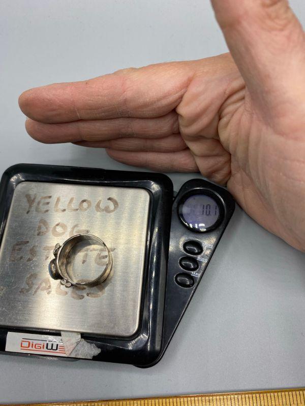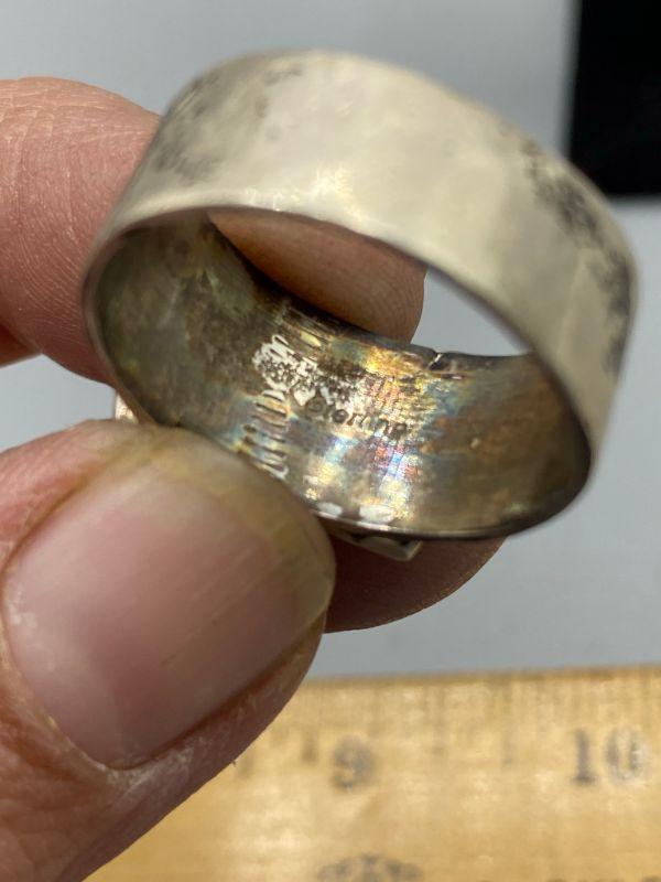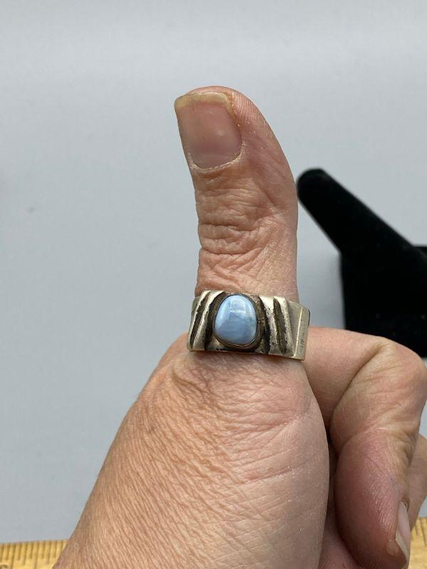 Men's old pawn sterling silver ring. Has a polished pale blue opal stone. Need to be cleaned. Large size, big on my thumb. Stone is really neat, milky pale blue with firey pink flashes when examined in the light. Stamped sterling inside.