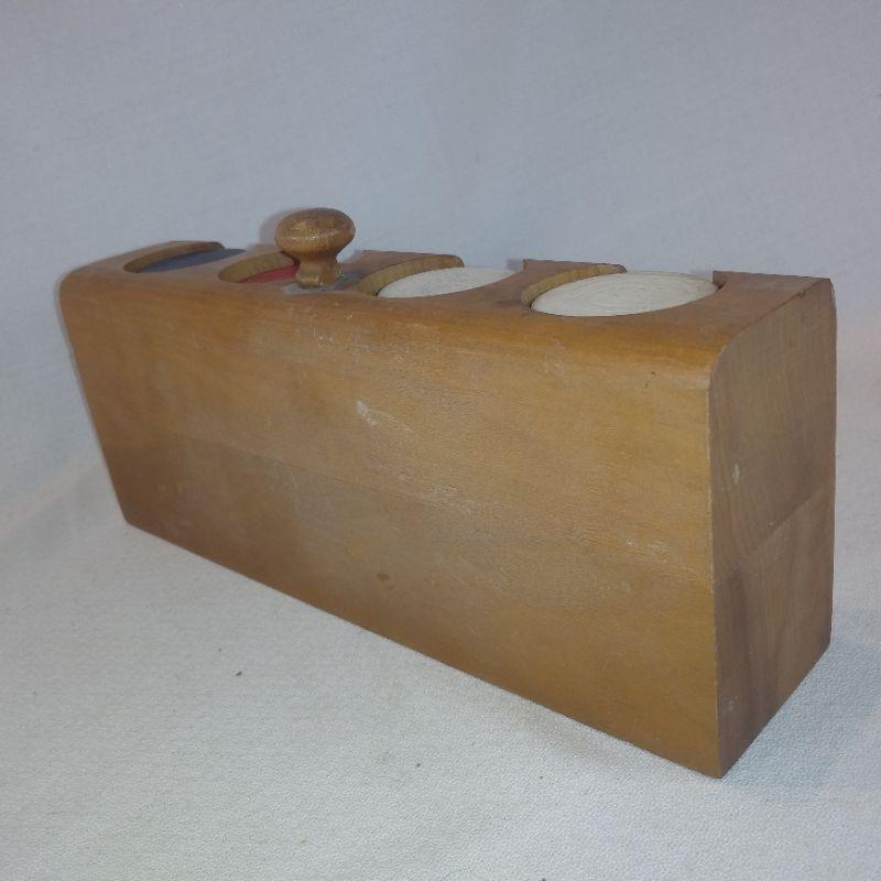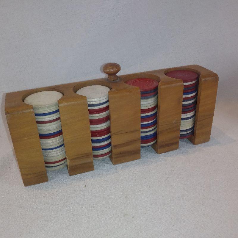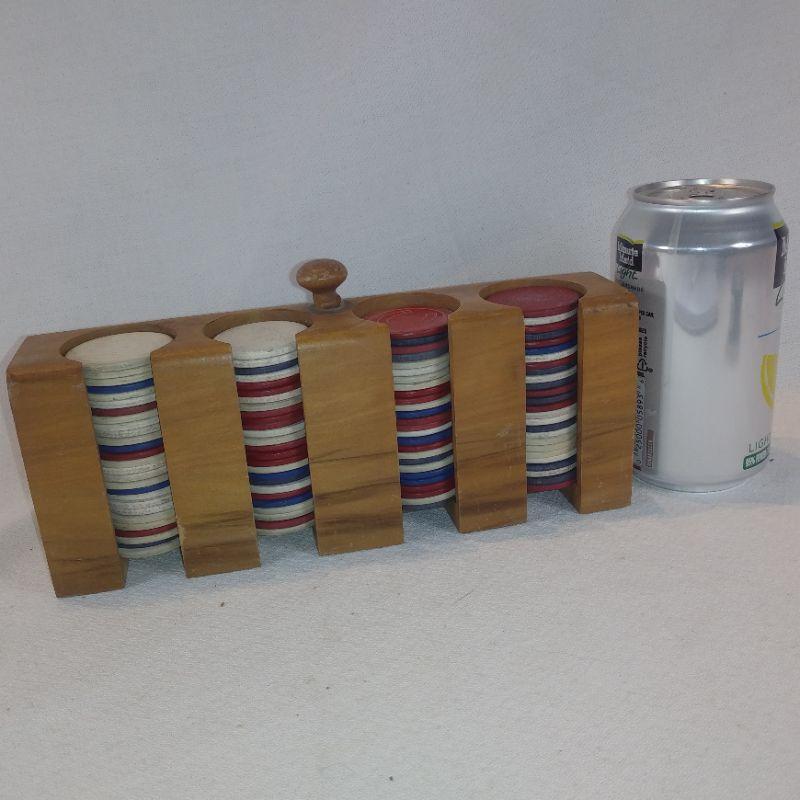 This is an unusual Poker Chip Carrier filled with Vintage Chips. The carrier is wood and the chips are mixed wood, clay and cardboard? Carrier measures 9-inches long X 3 1/2-inches tall X 2 1/8-inches deep. Very different and quite unique. Starting Bid/Reserve is $10.