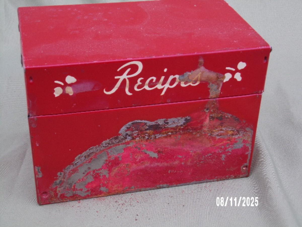 OLD recipe box, metal, filled with hand written cards and clipped-out recipes. A treasure trove. There are two more recipe boxes elsewhere in this sale.