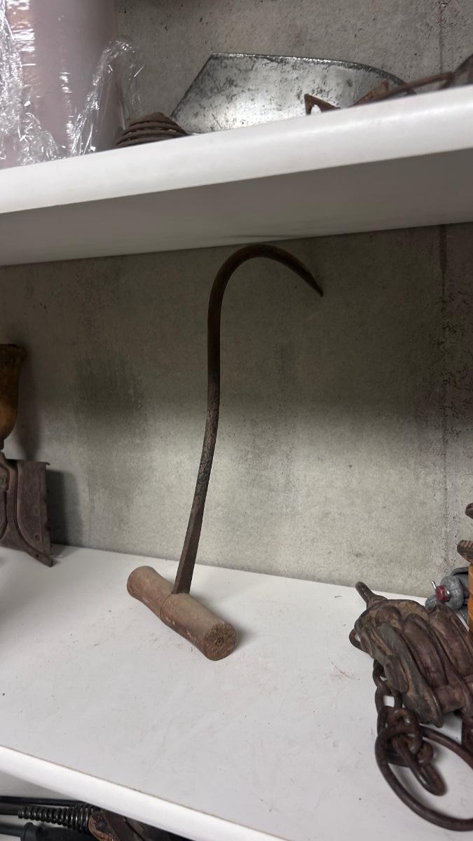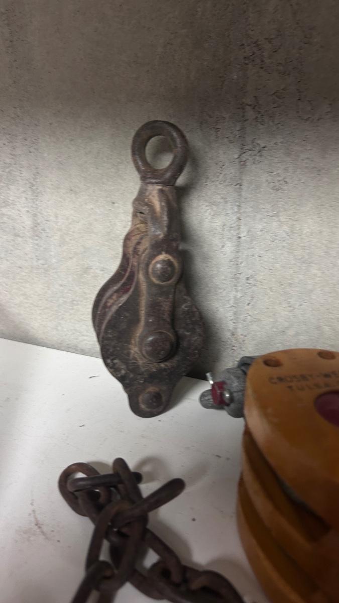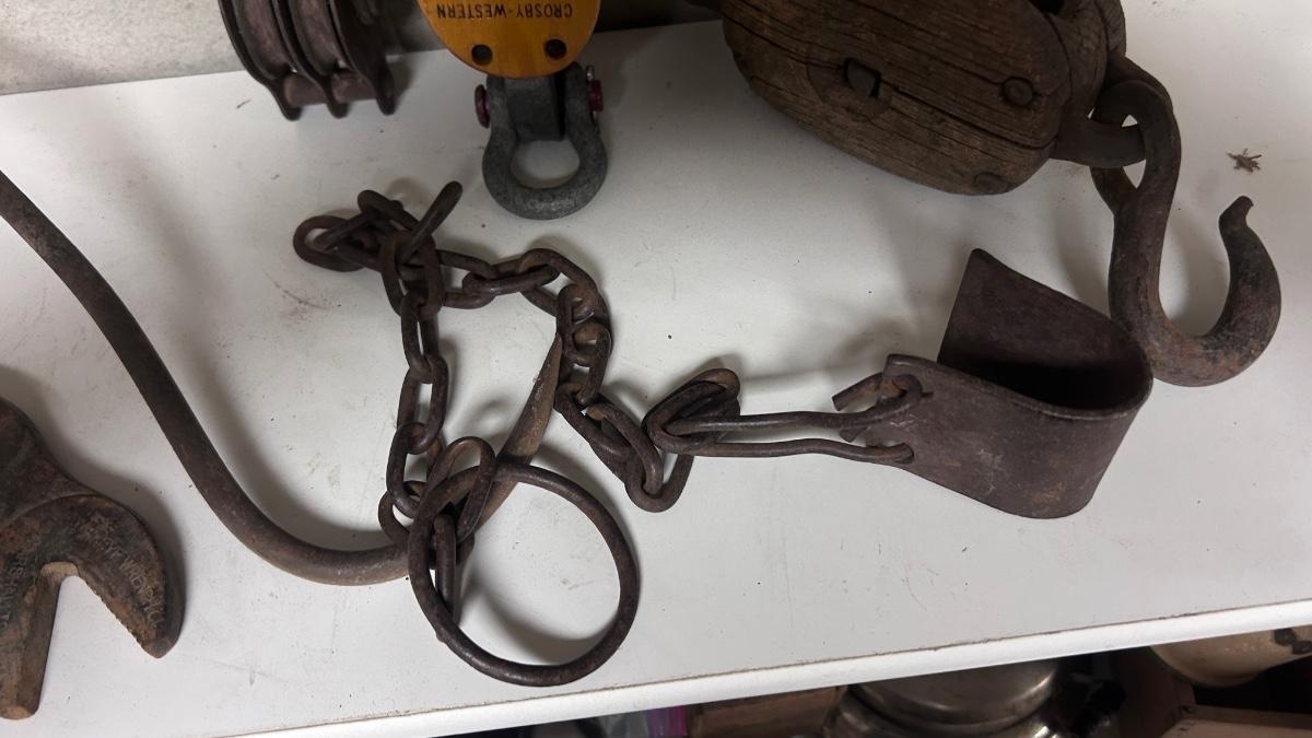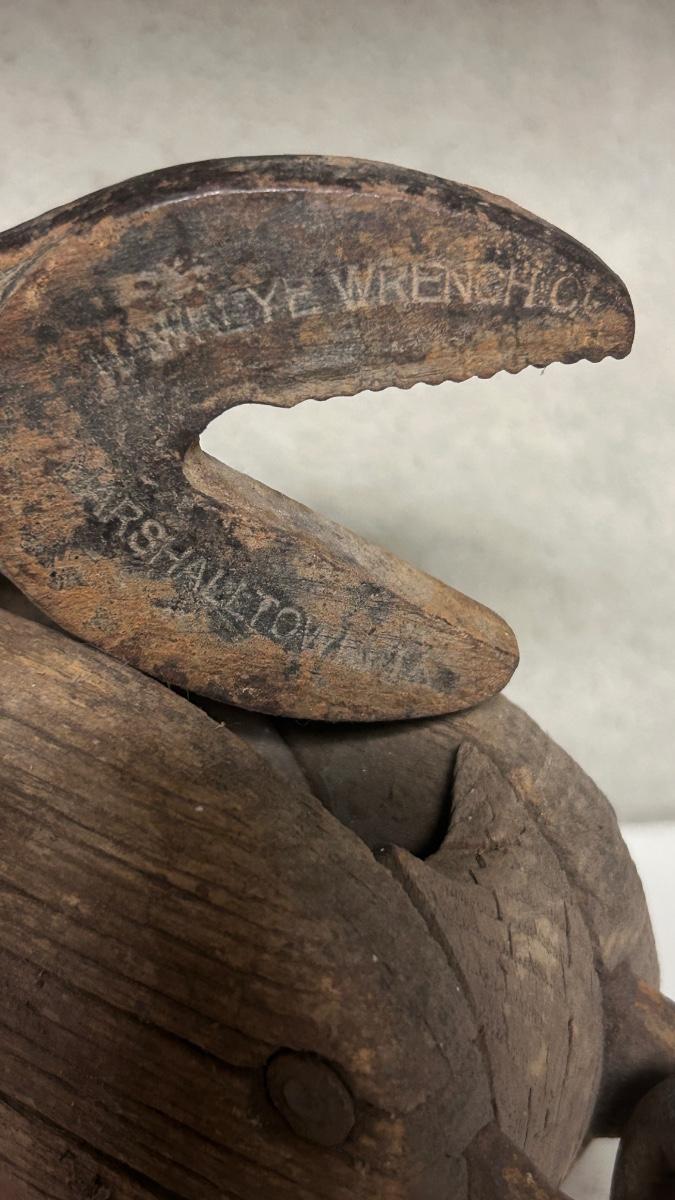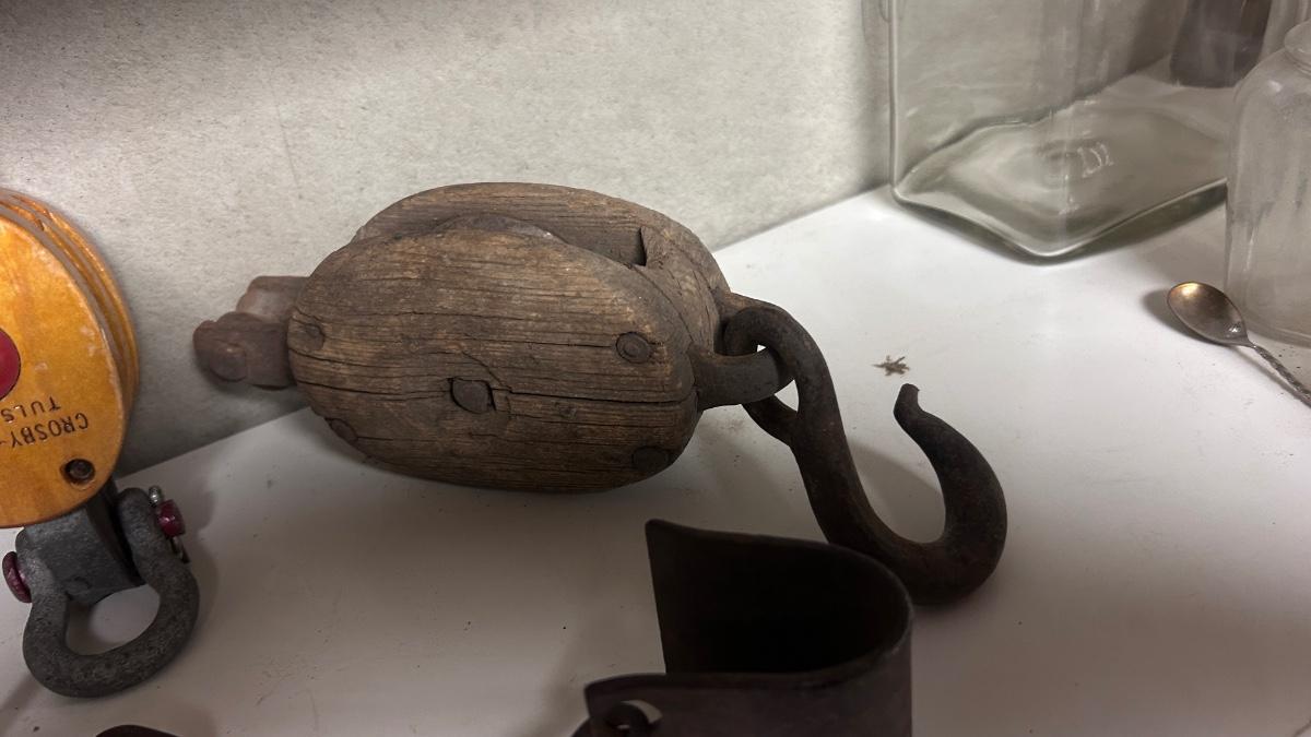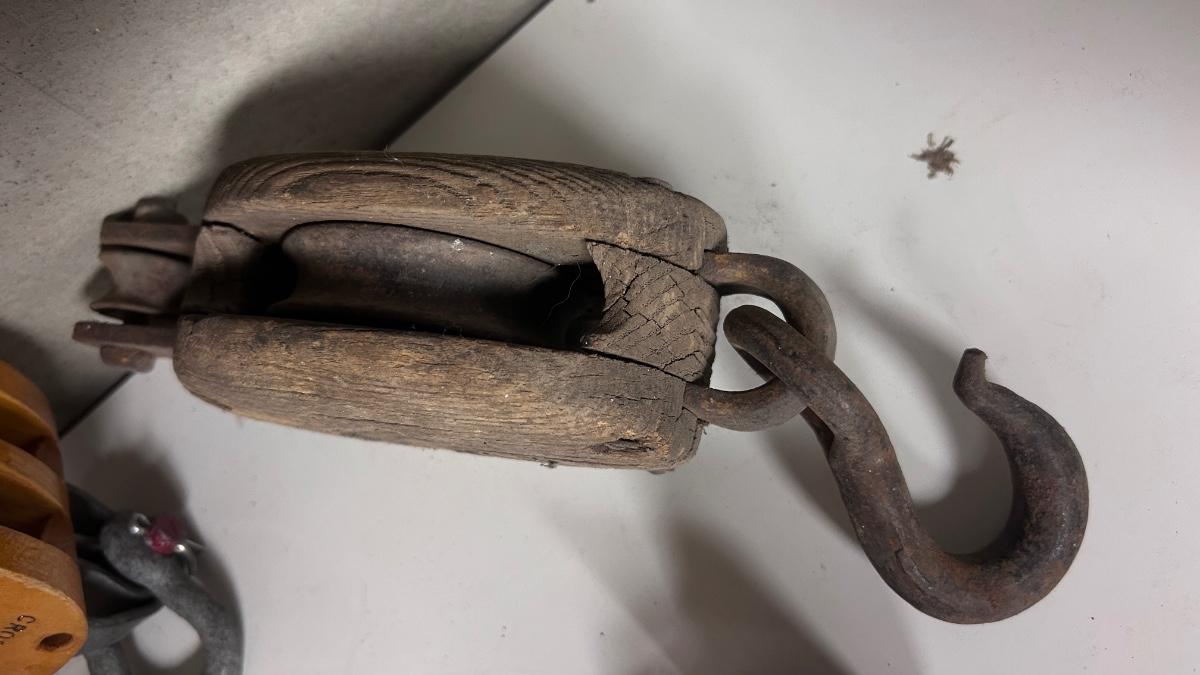 OLD RIGGING PULLEYS, HAY HOOK, HAWKEYE WRENCH