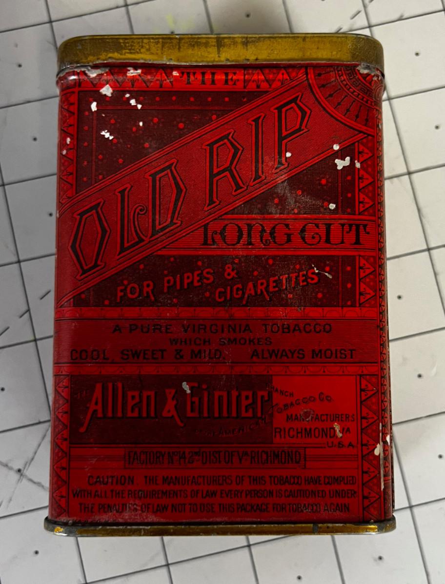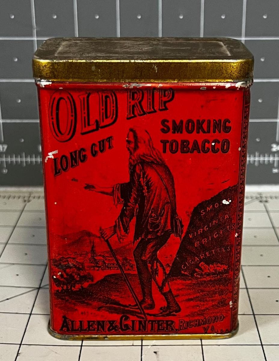 Old Rip, Long Cut Smoking Tobacco Tin says  "Cool, Sweet & Mild"