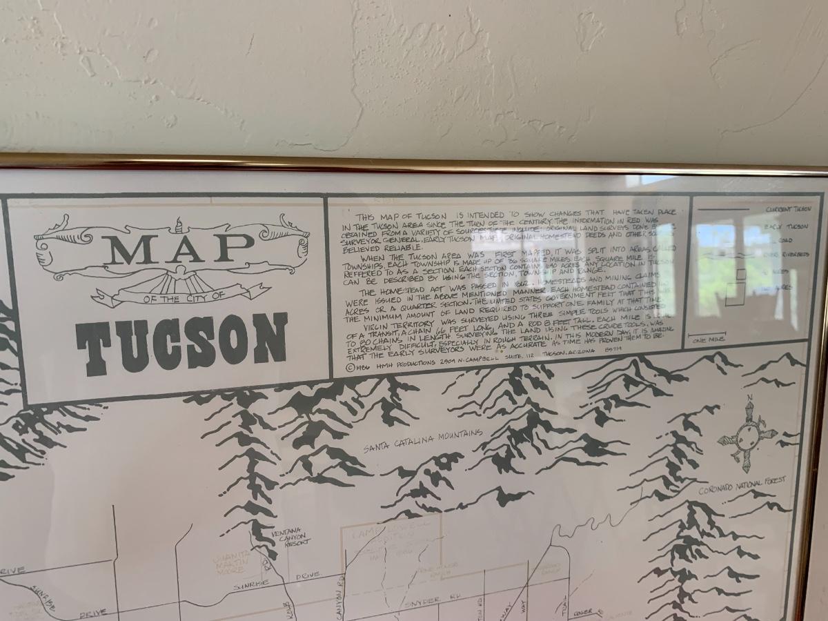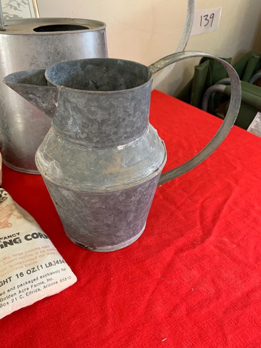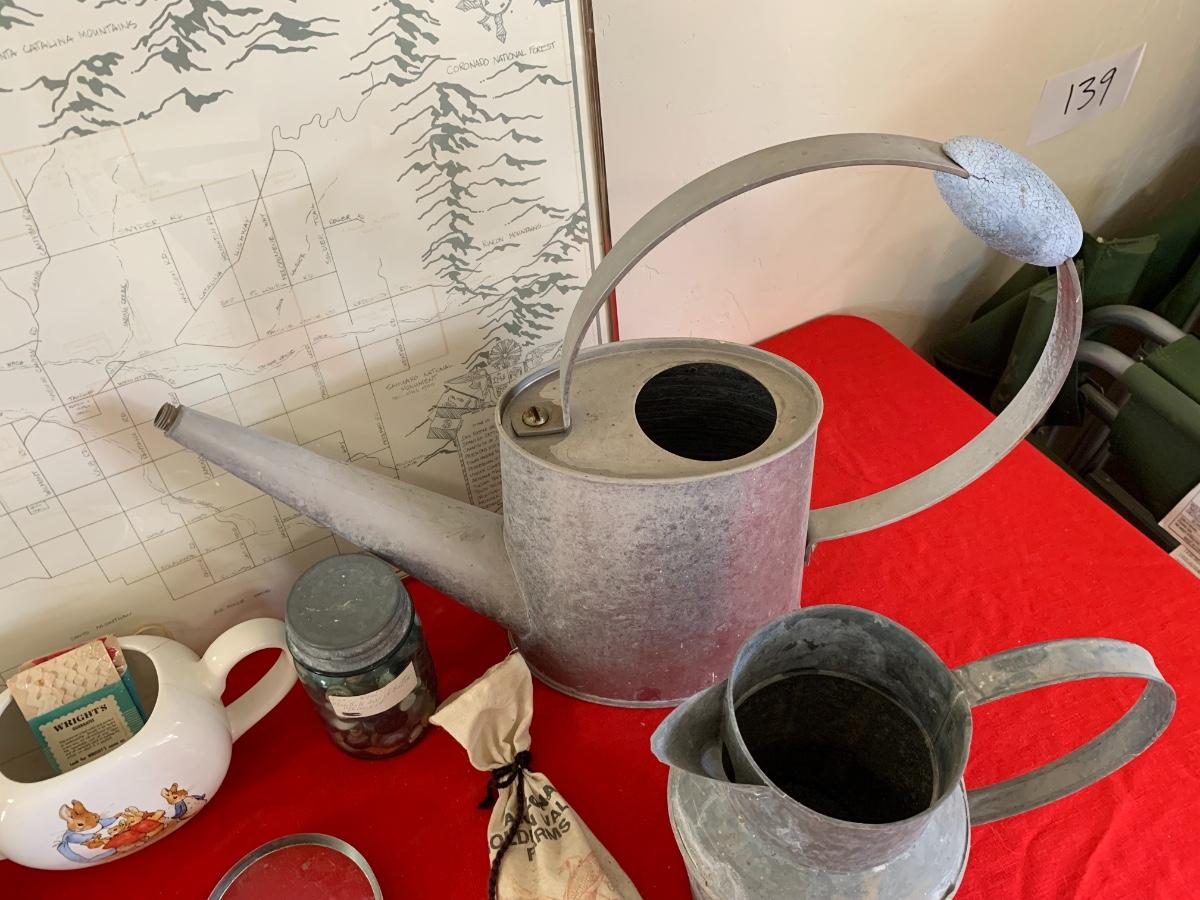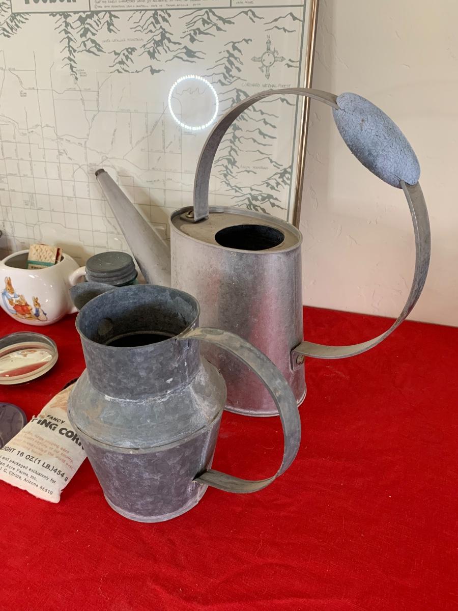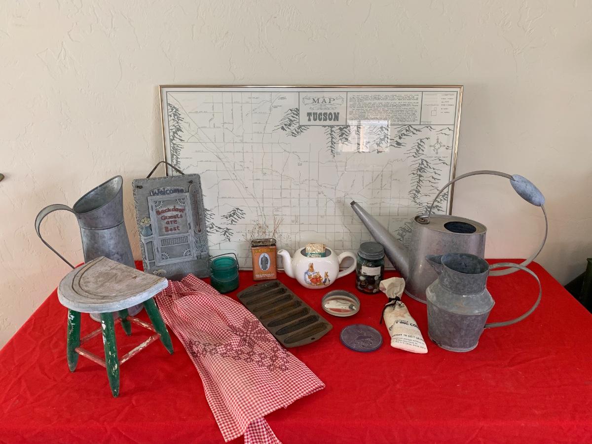 Includes a 1986 framed map of Tucson, a vintage watering can, two metal decor pitchers, an old Peter Rabbit creamer that was broken and repairs, a cast iron corn bread pan and more! Map 34” x 22”