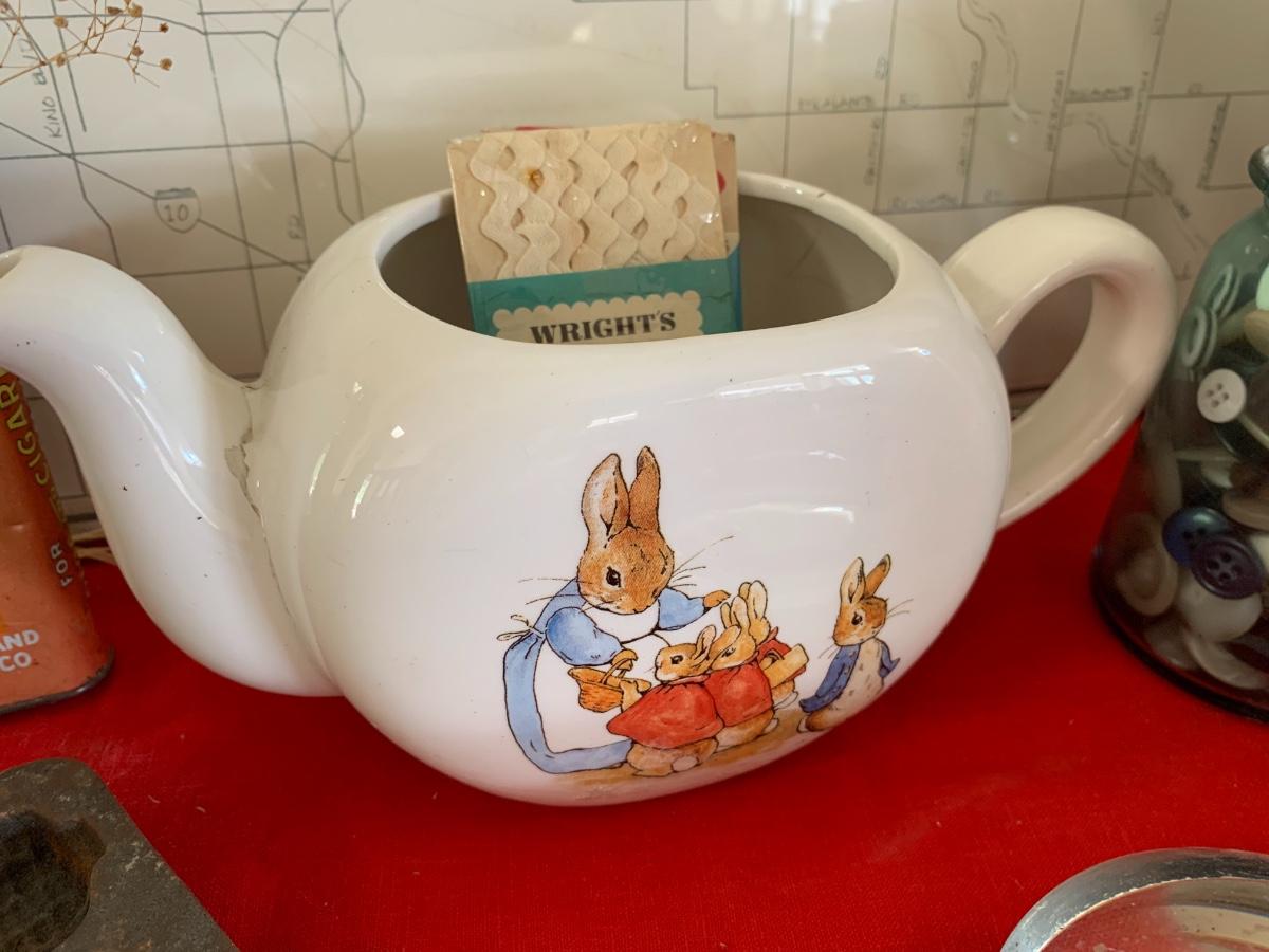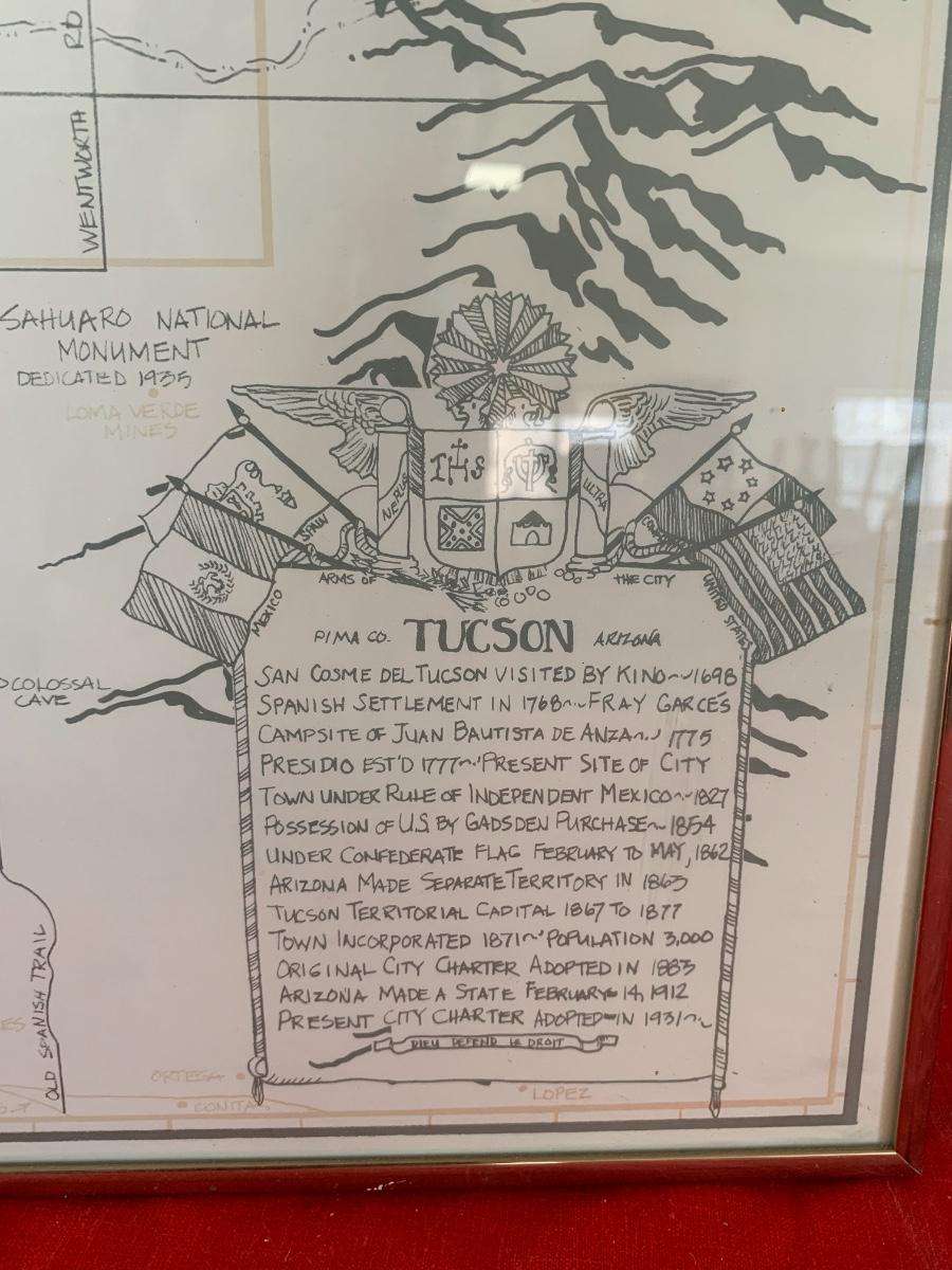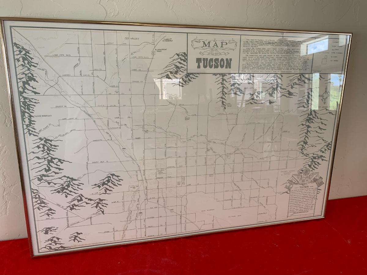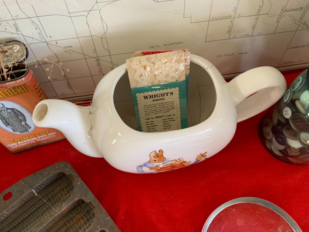 Includes a 1986 framed map of Tucson, a vintage watering can, two metal decor pitchers, an old Peter Rabbit creamer that was broken and repairs, a cast iron corn bread pan and more! Map 34” x 22”