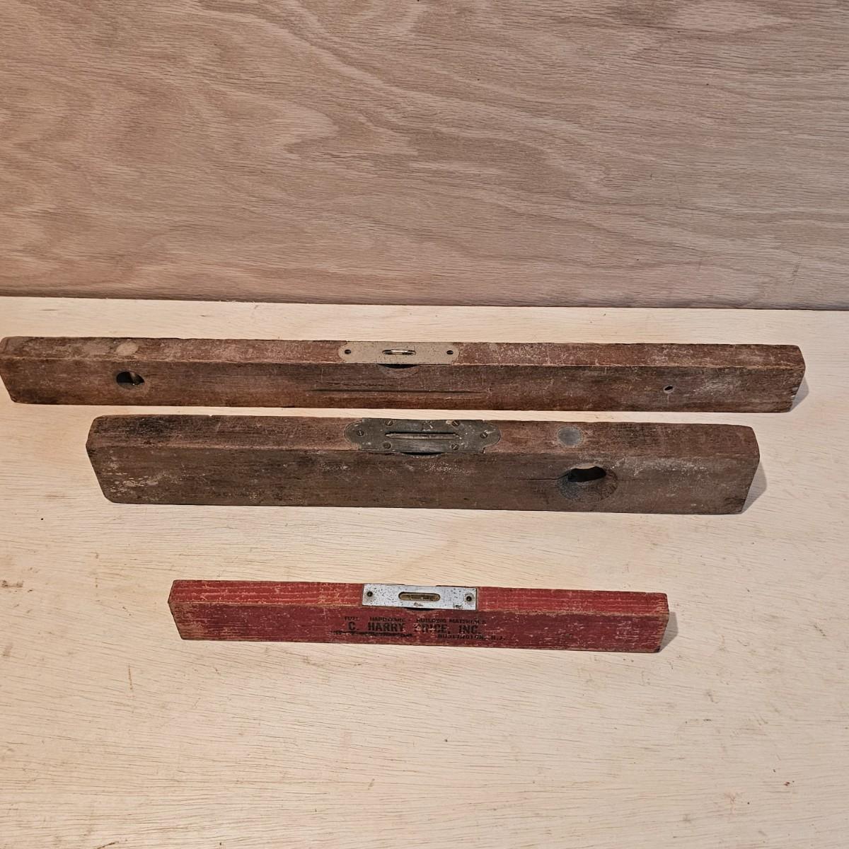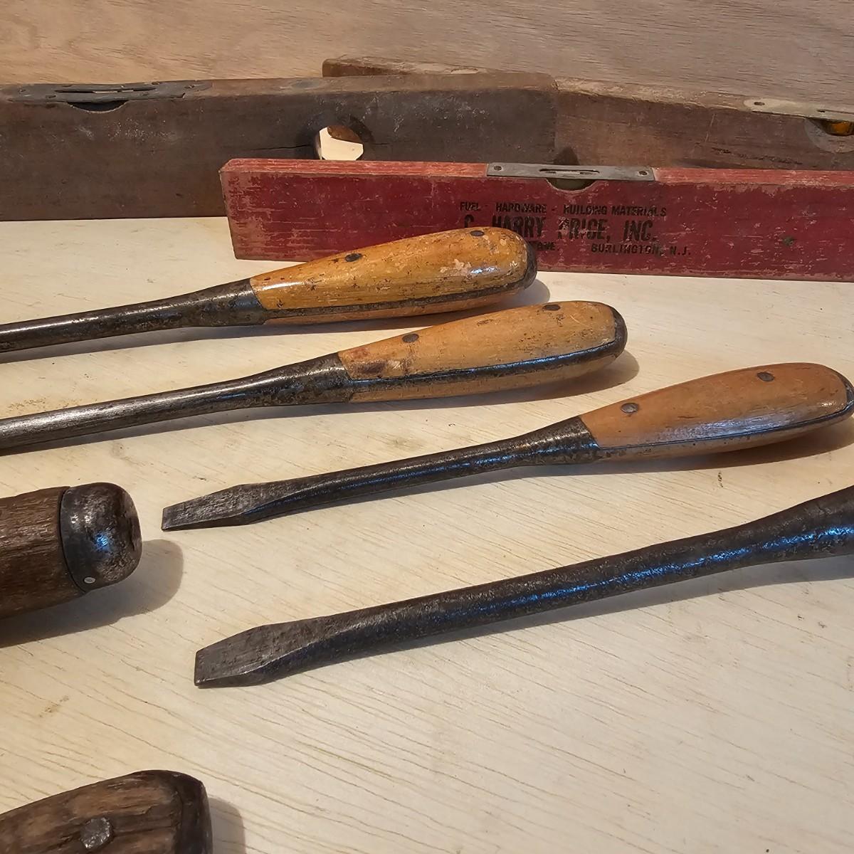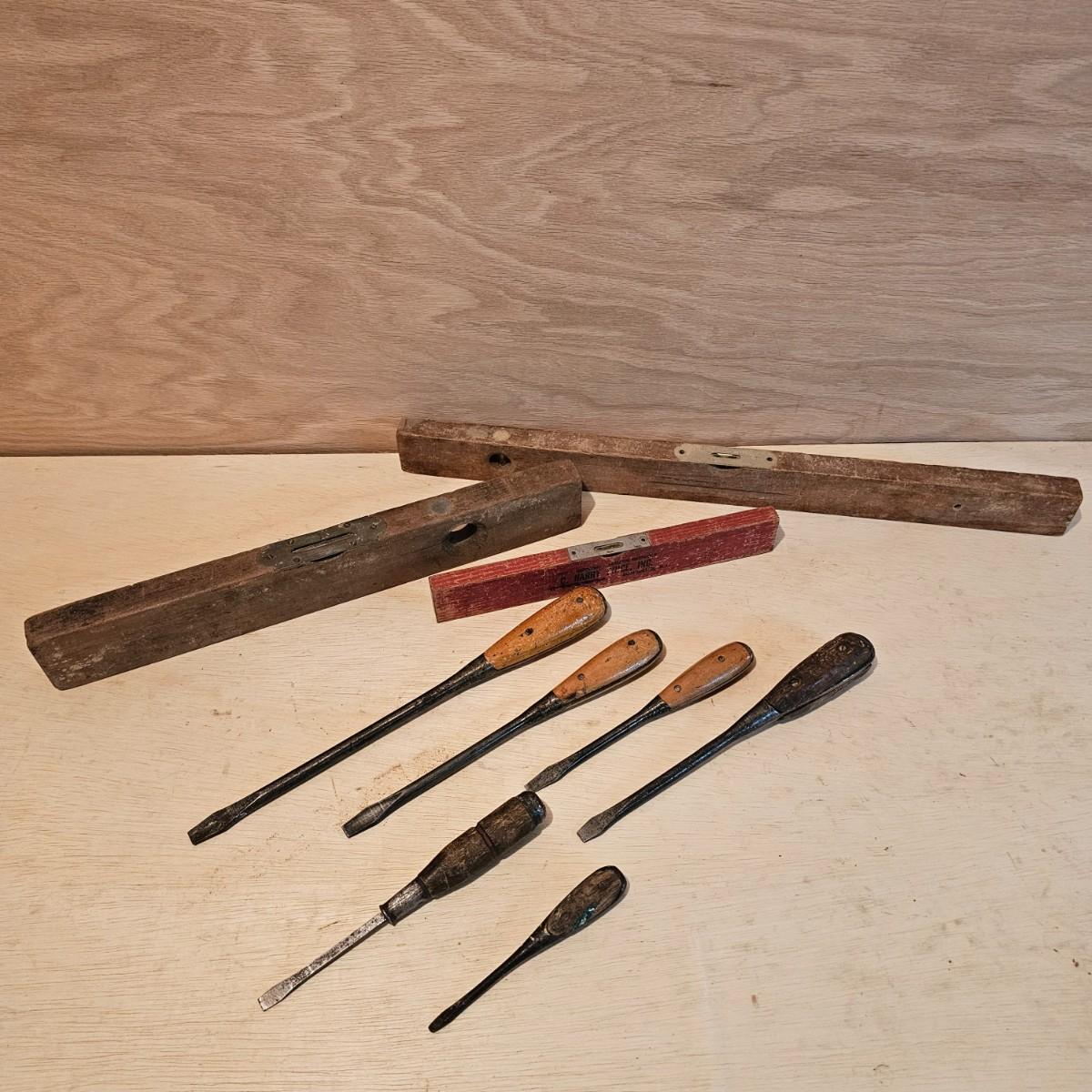 Older wood handle flat head screwdrivers and three wooden levels. Three matching screwdrivers are marked Irwin. Lengths vary from 6" to 14". Wood levels are 12", 18" and 24". Smallest and largest have all their bubbles, middle size only one. See photos for details. Shipping available.