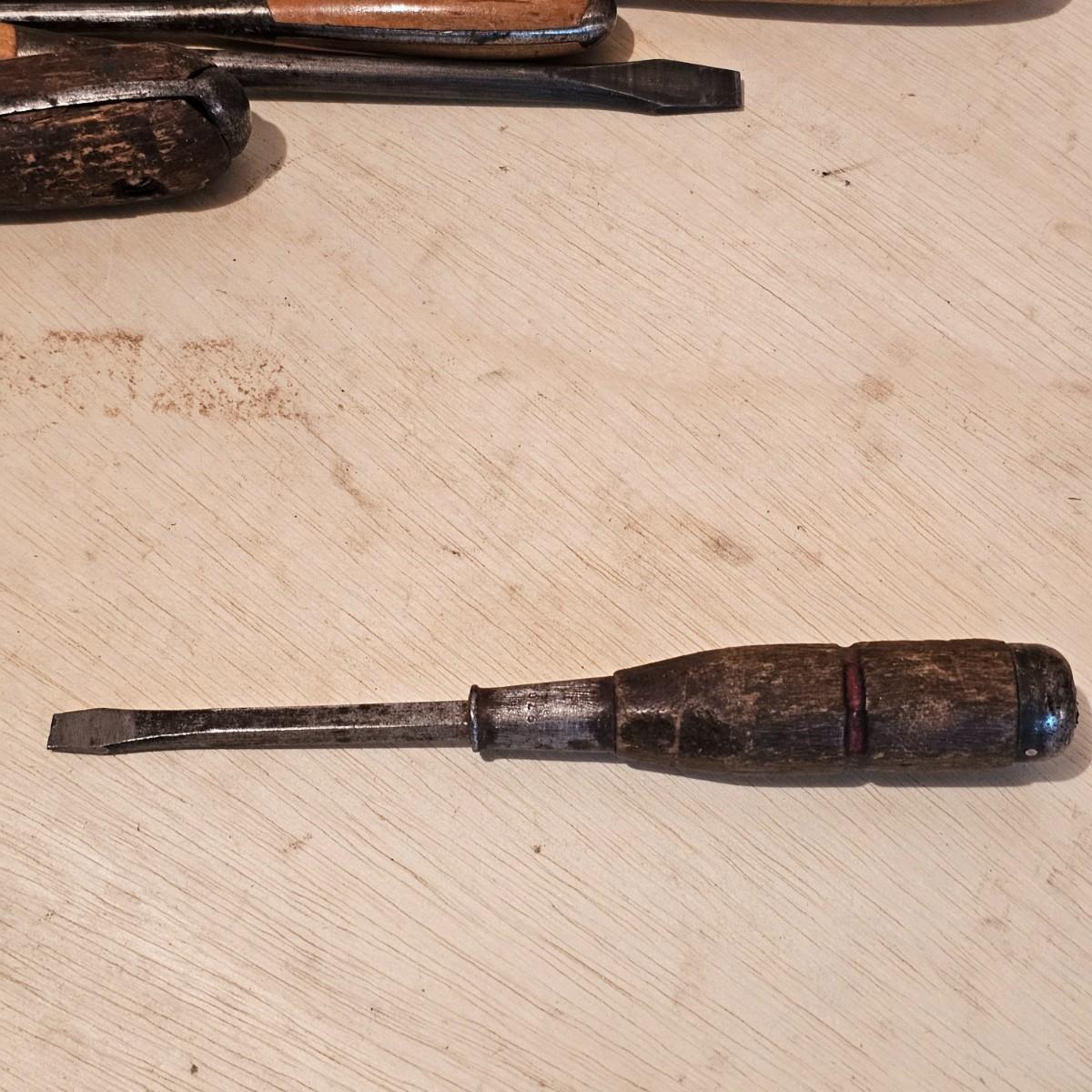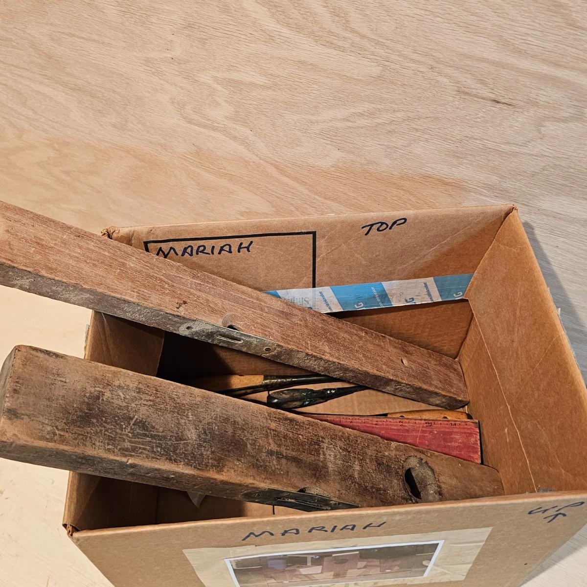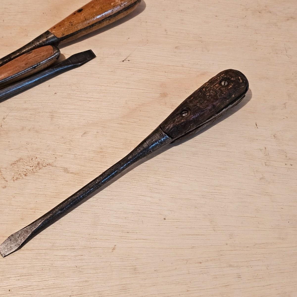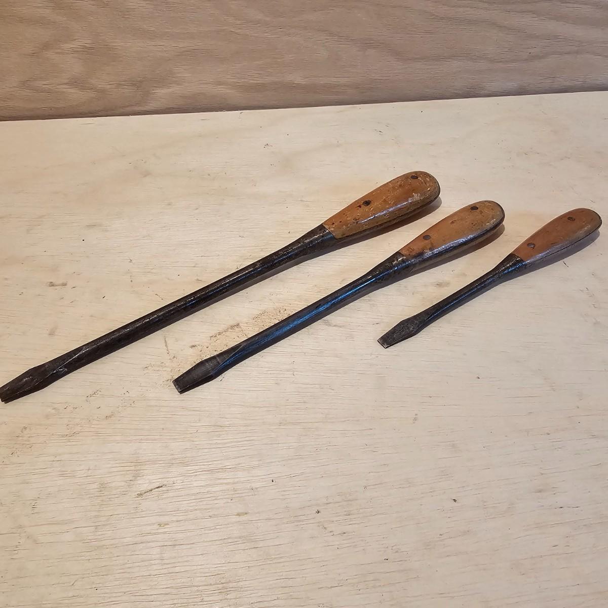 Older wood handle flat head screwdrivers and three wooden levels. Three matching screwdrivers are marked Irwin. Lengths vary from 6" to 14". Wood levels are 12", 18" and 24". Smallest and largest have all their bubbles, middle size only one. See photos for details. Shipping available.