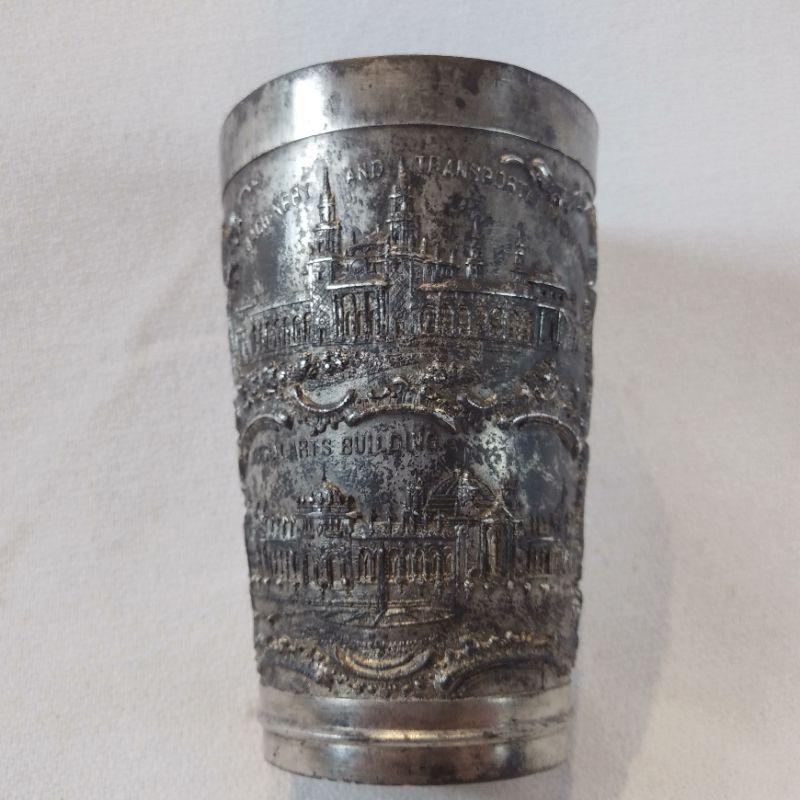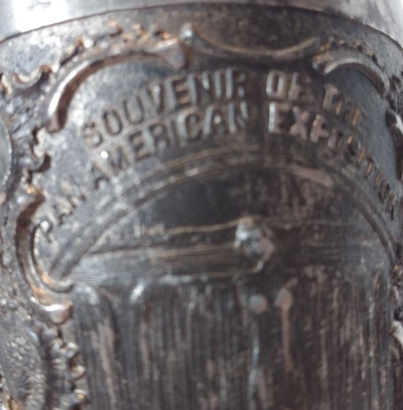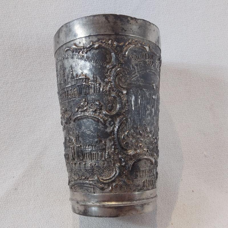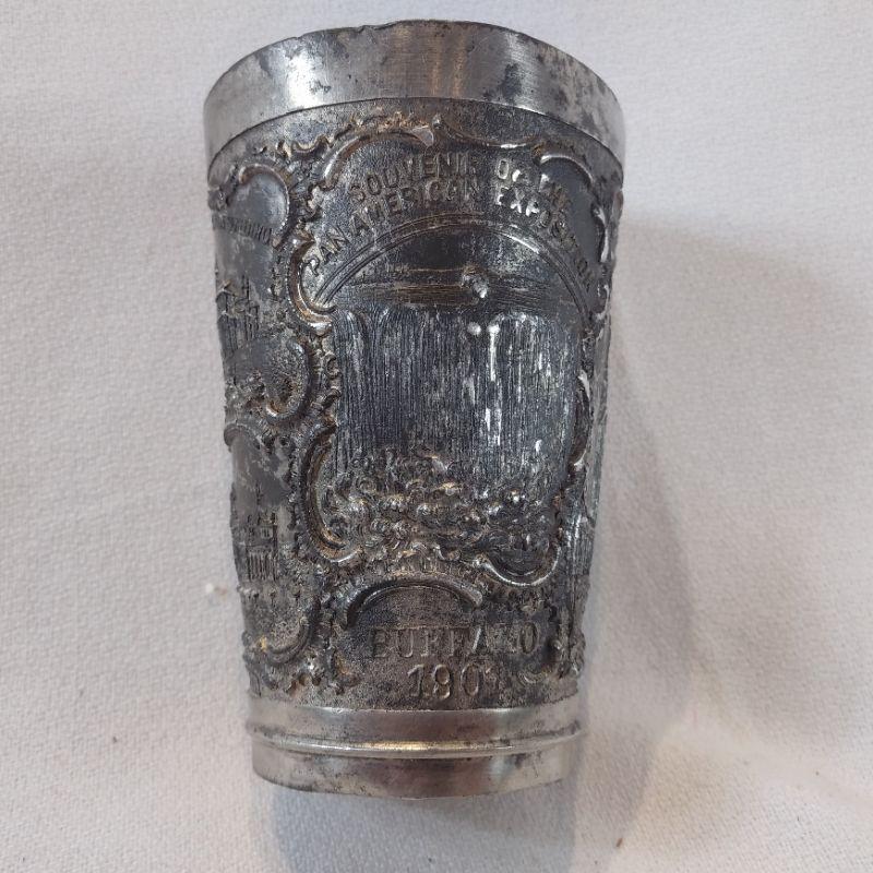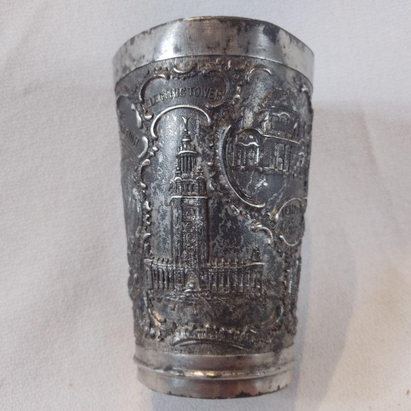 This is an old silver plate/metal souvenir cup from the 1901 Pan-American Exposition in Buffalo, NY. It is embossed with scenes of the expo; Temple of Music, Liberal Arts Building, Machine & Transportation Building and the Electric Tower. Several Dents and Tarnish but pretty good for a 118 year old metal cup, Marked T & E Dickinson & Co. - Buffalo, NY. Great item for a World's Fair collector.