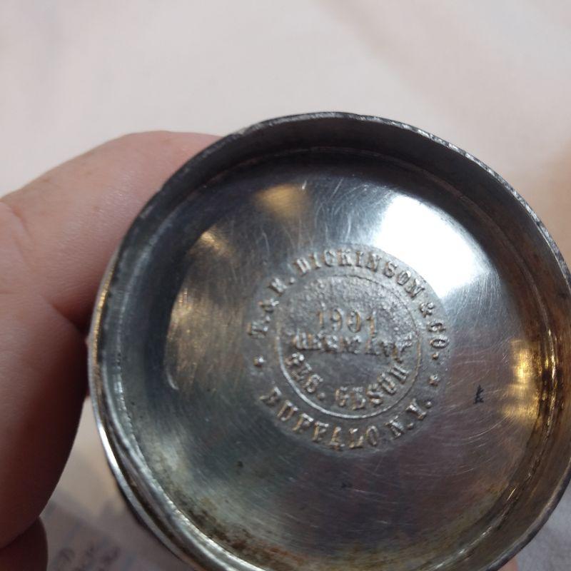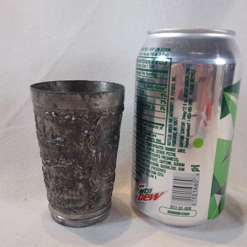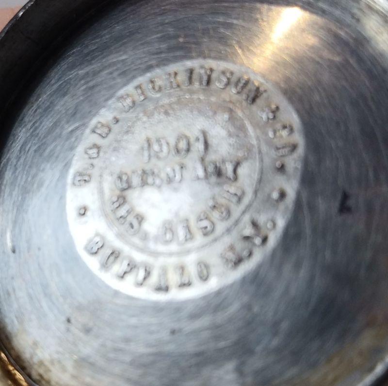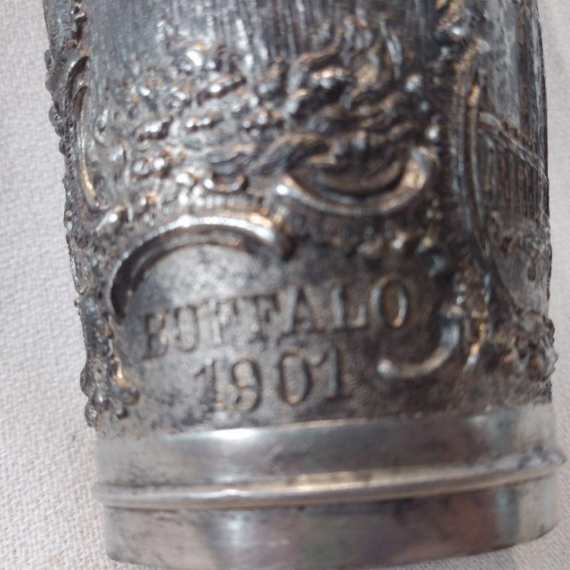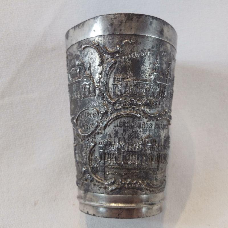This is an old silver plate/metal souvenir cup from the 1901 Pan-American Exposition in Buffalo, NY. It is embossed with scenes of the expo; Temple of Music, Liberal Arts Building, Machine & Transportation Building and the Electric Tower. Several Dents and Tarnish but pretty good for a 118 year old metal cup, Marked T & E Dickinson & Co. - Buffalo, NY. Great item for a World's Fair collector.