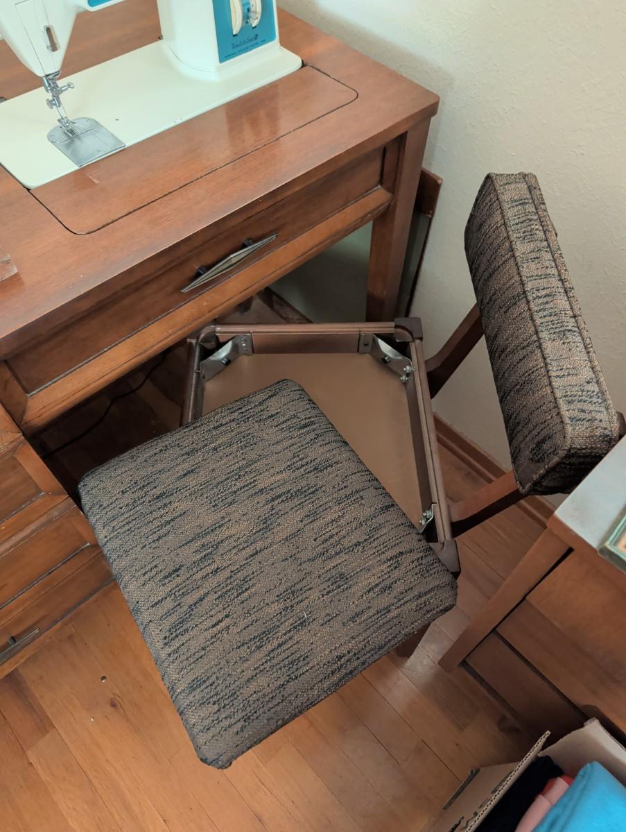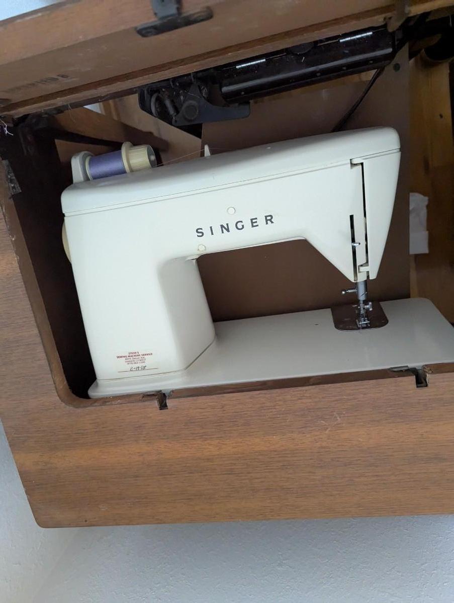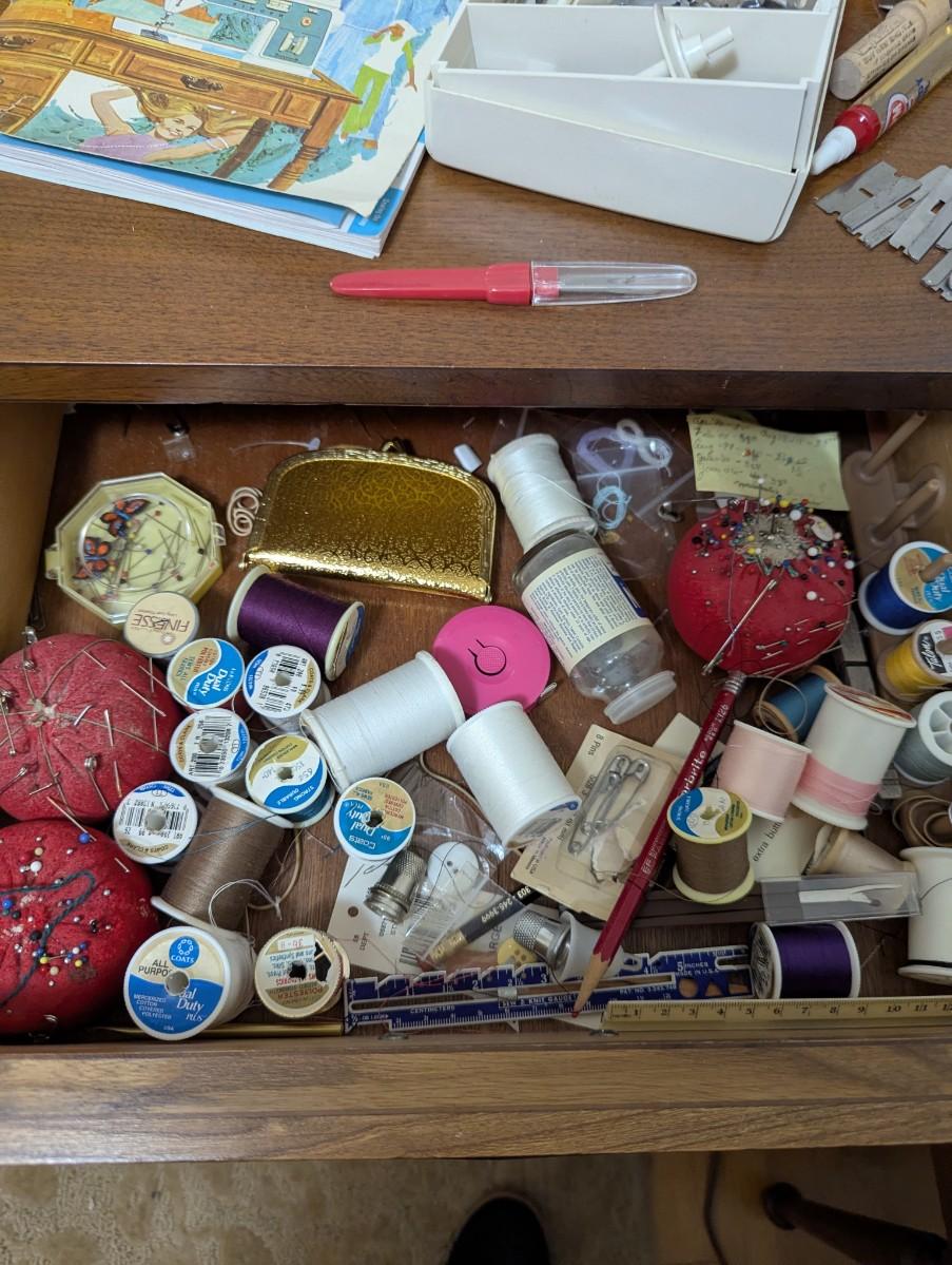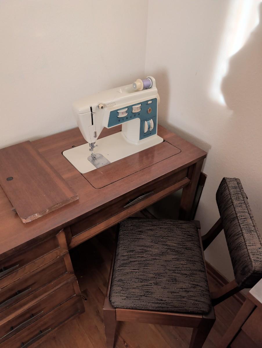 Old singer sewing machine with chair. Full of all kinds of sewing supplies.