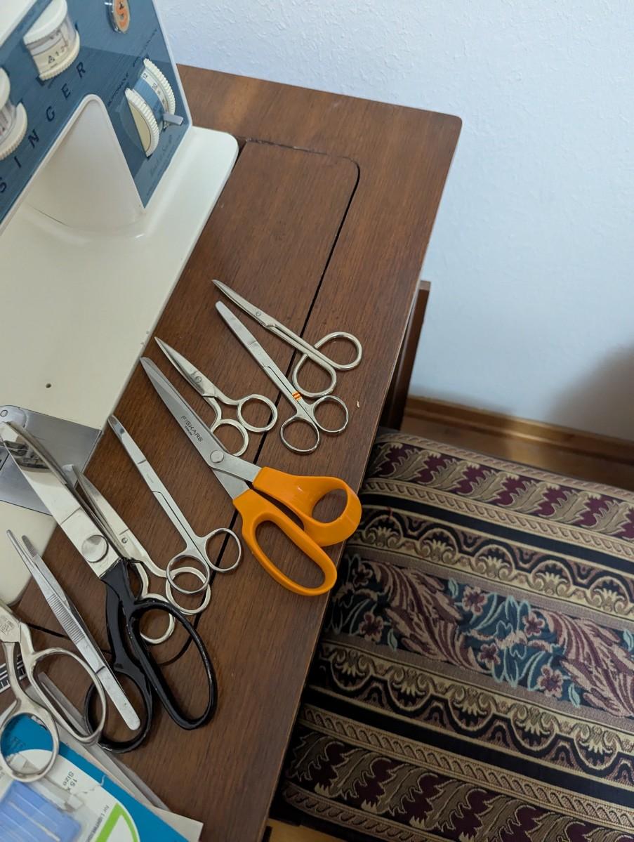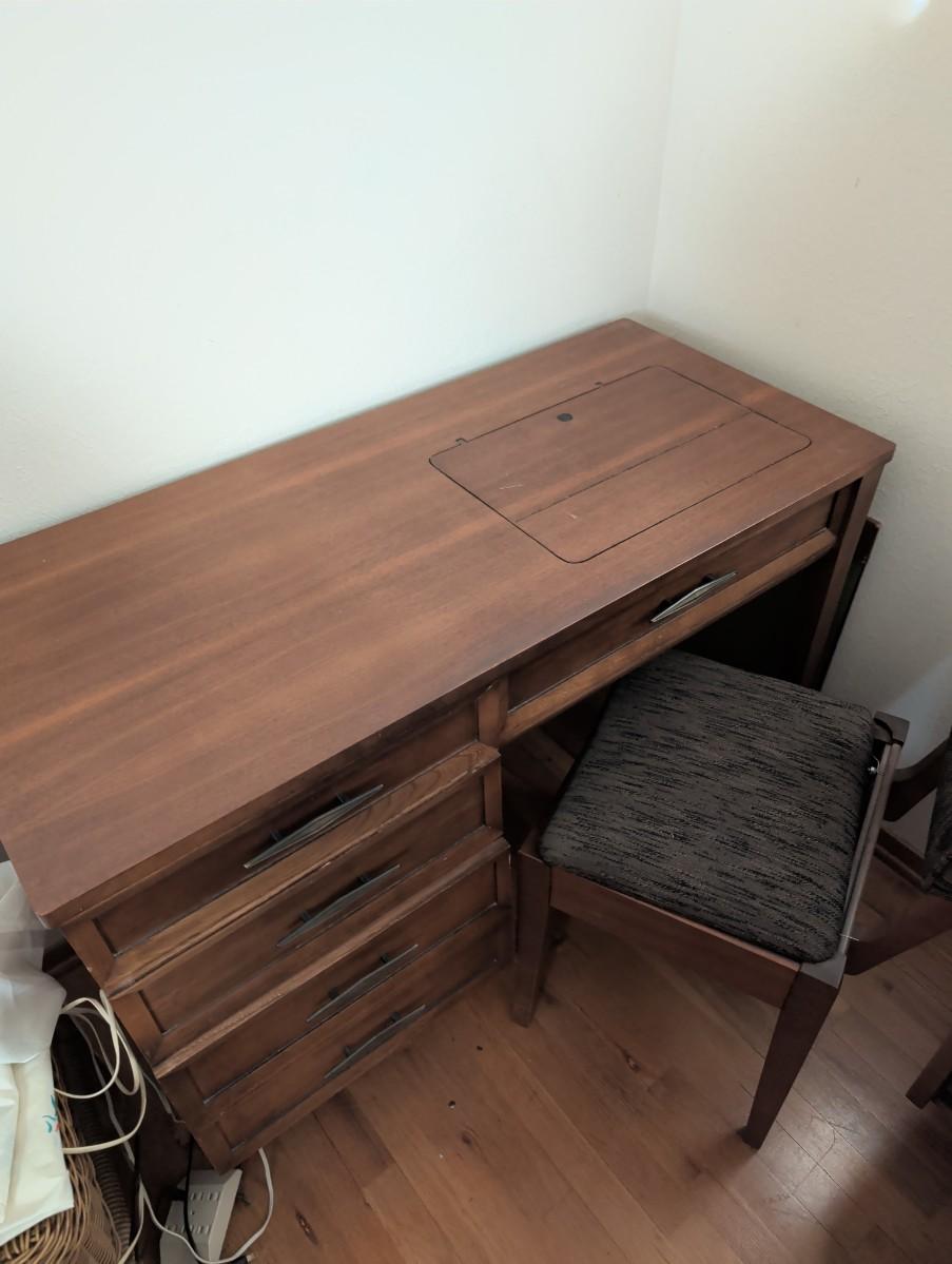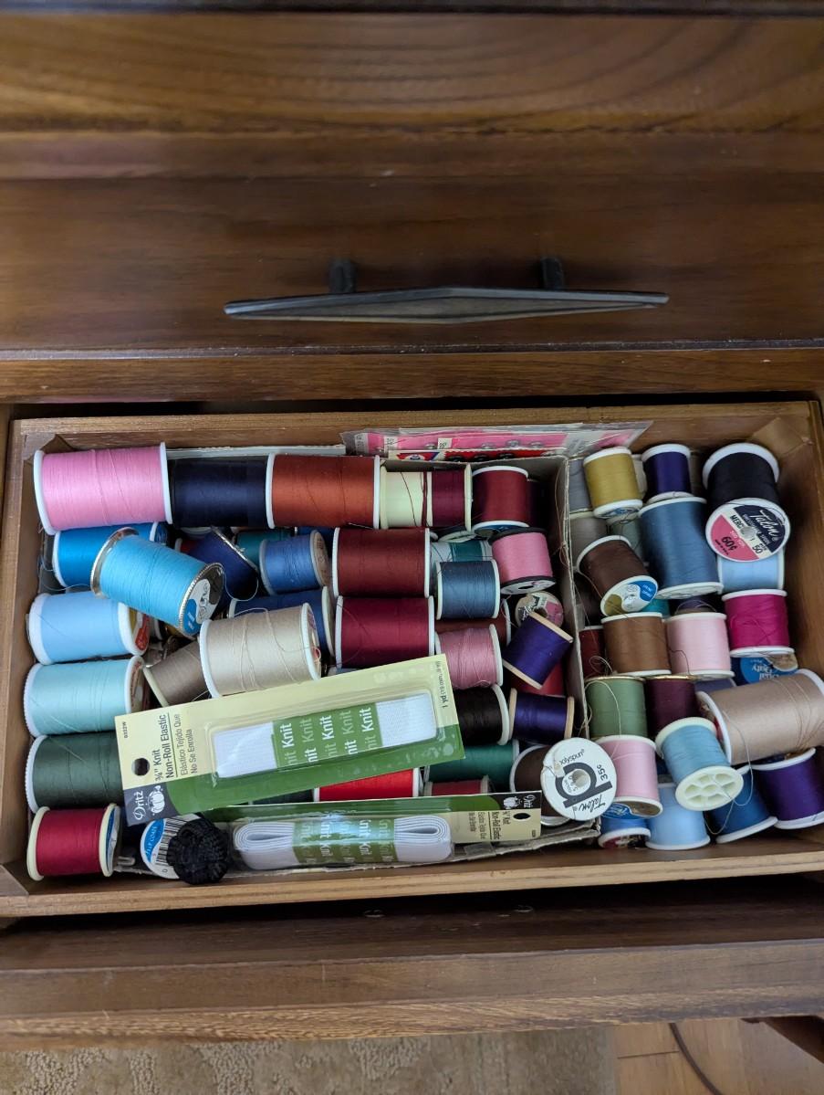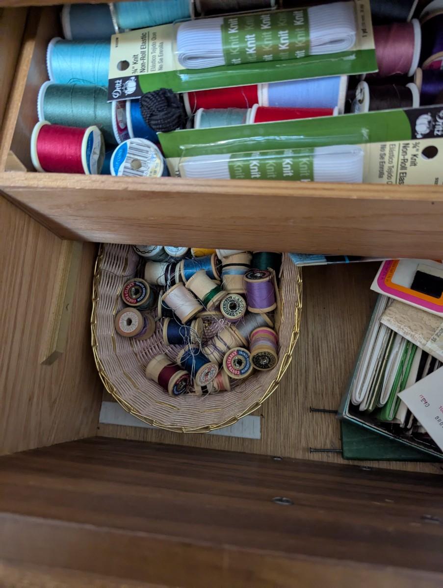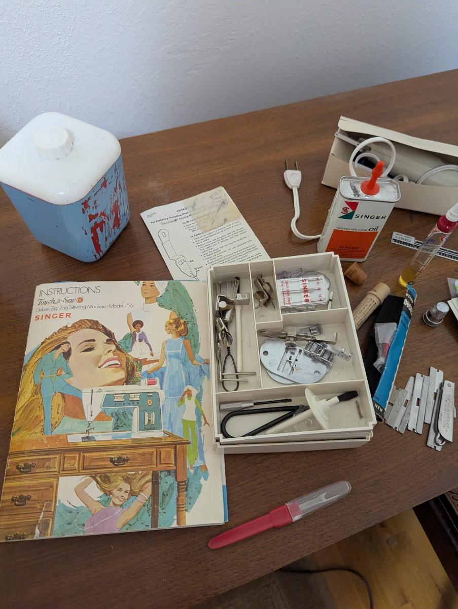Old singer sewing machine with chair. Full of all kinds of sewing supplies.