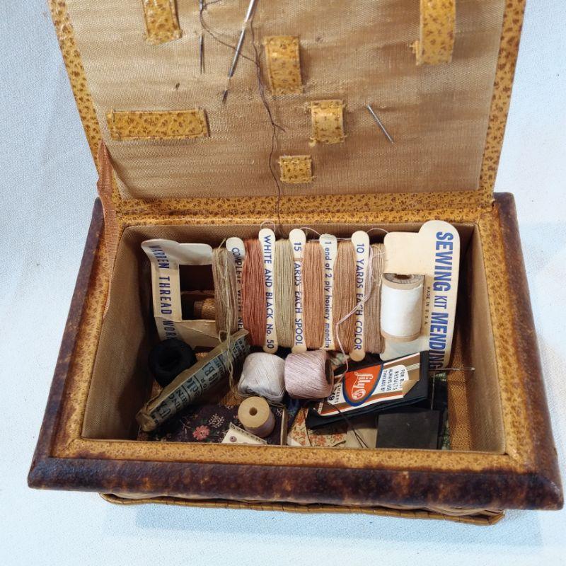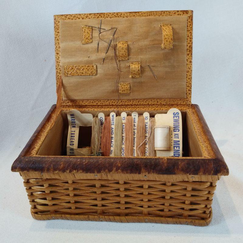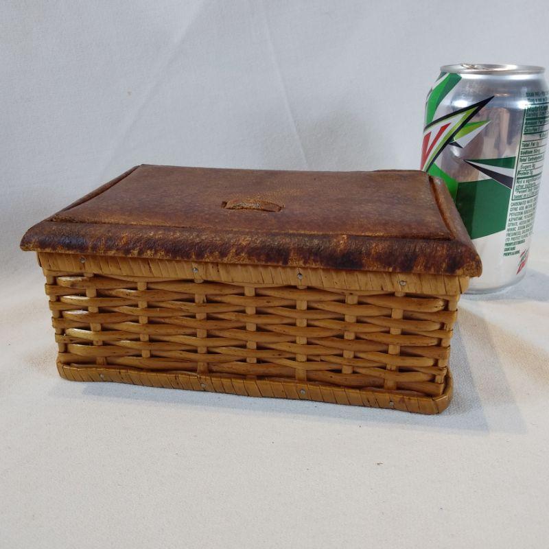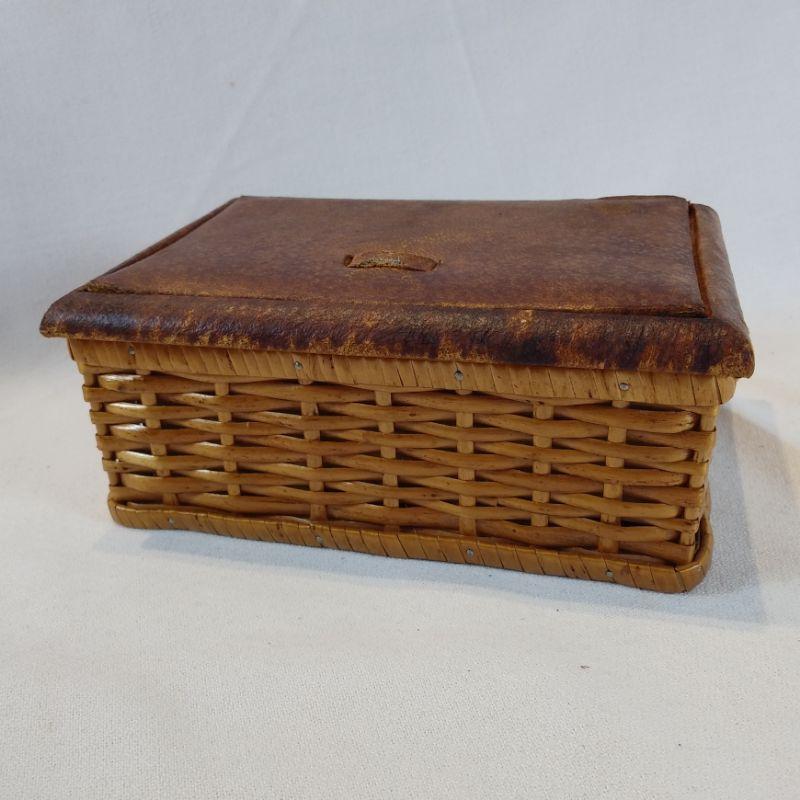 This is an old sewing box with a leather top and wicker box. It's on the small size but still holds a lot. Perfect for keeping by your chair for those last minute mends. Comes with contents Box shows some wear but consistent with age and use - overall in very good condition. The box is 7-inches wide X 5-inches deed X 3-inches tall.