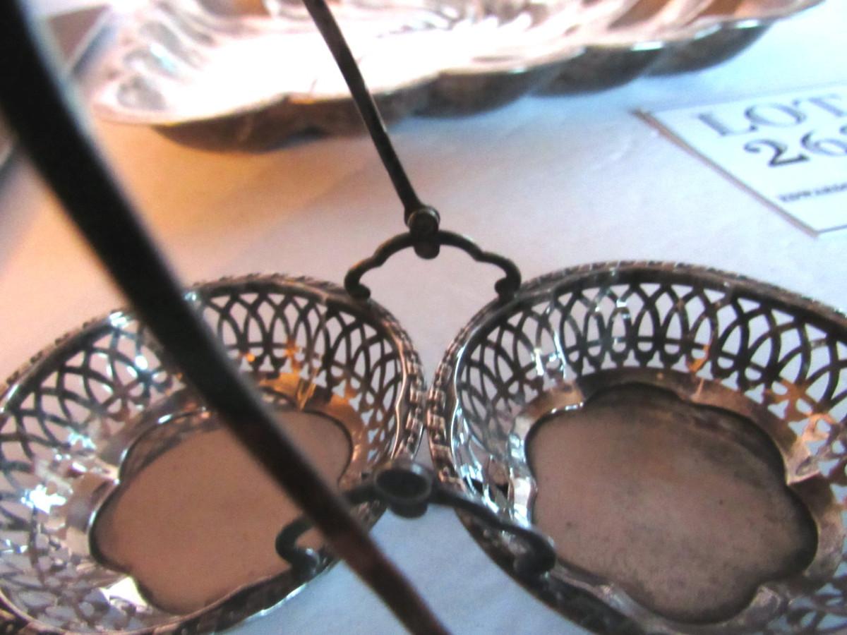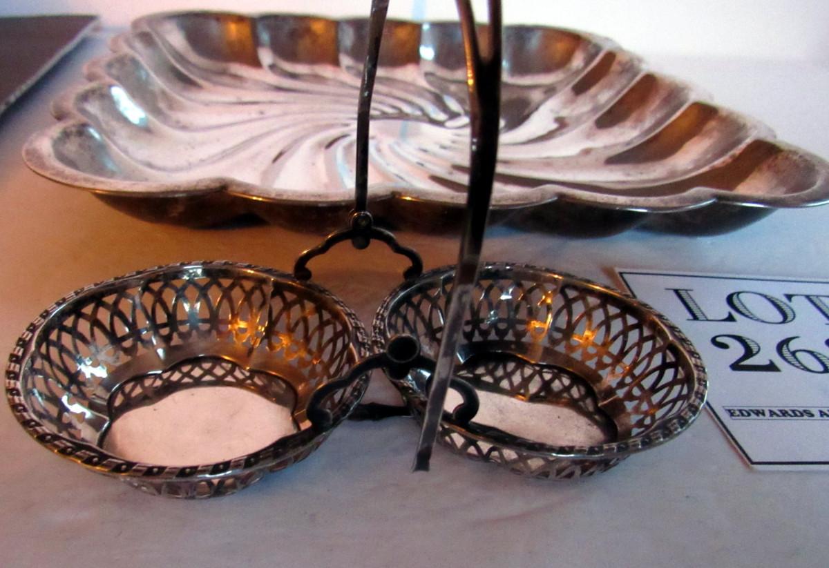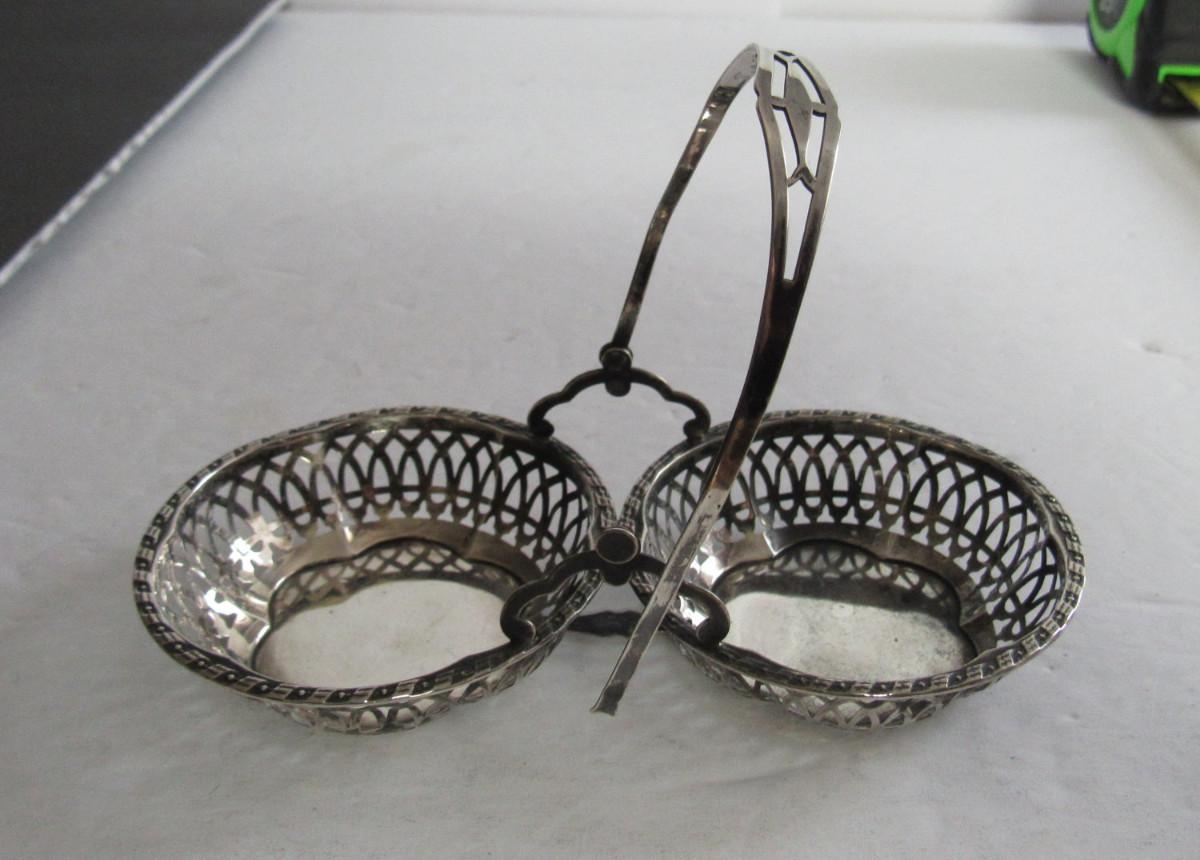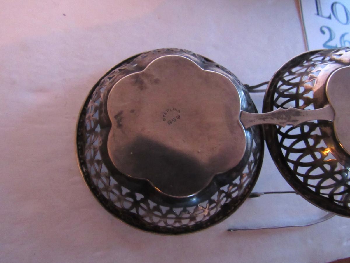 The tray has wear and a lot of dark spots and pitting. The sterling basket has a broken handle that needs to be re-soldered. It is nice otherwise and marked on bottom. Shipping available at actual cost plus $5.00 handling/supply fee per box. See our terms for details. All sales final.