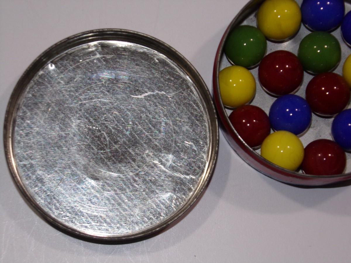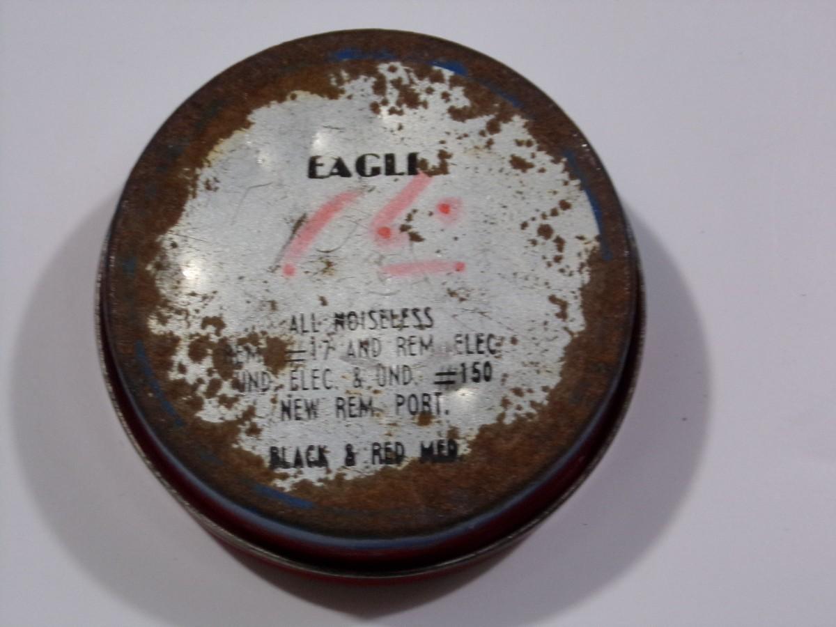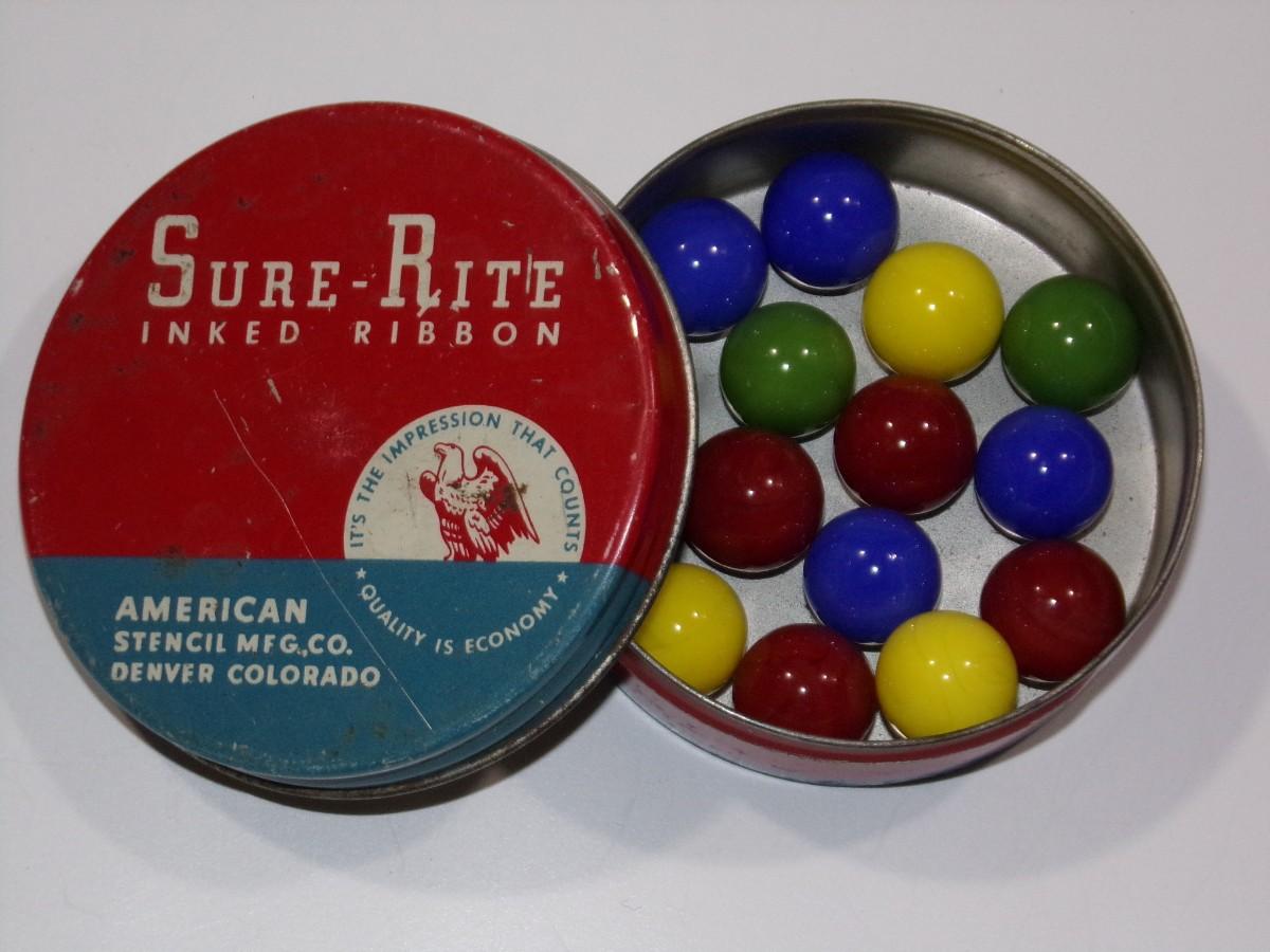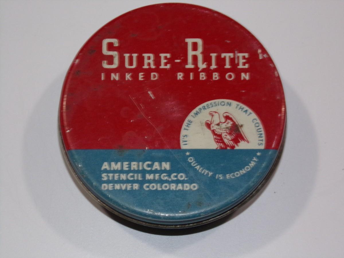 OLD Sure-Rite typewriter ribbon metal canister from American Stencil Mfg. Co. Denver CO. Tinned steel is shiny bright inside. Screw on lid & a few marbles inside. You wondered where those went didn't you?