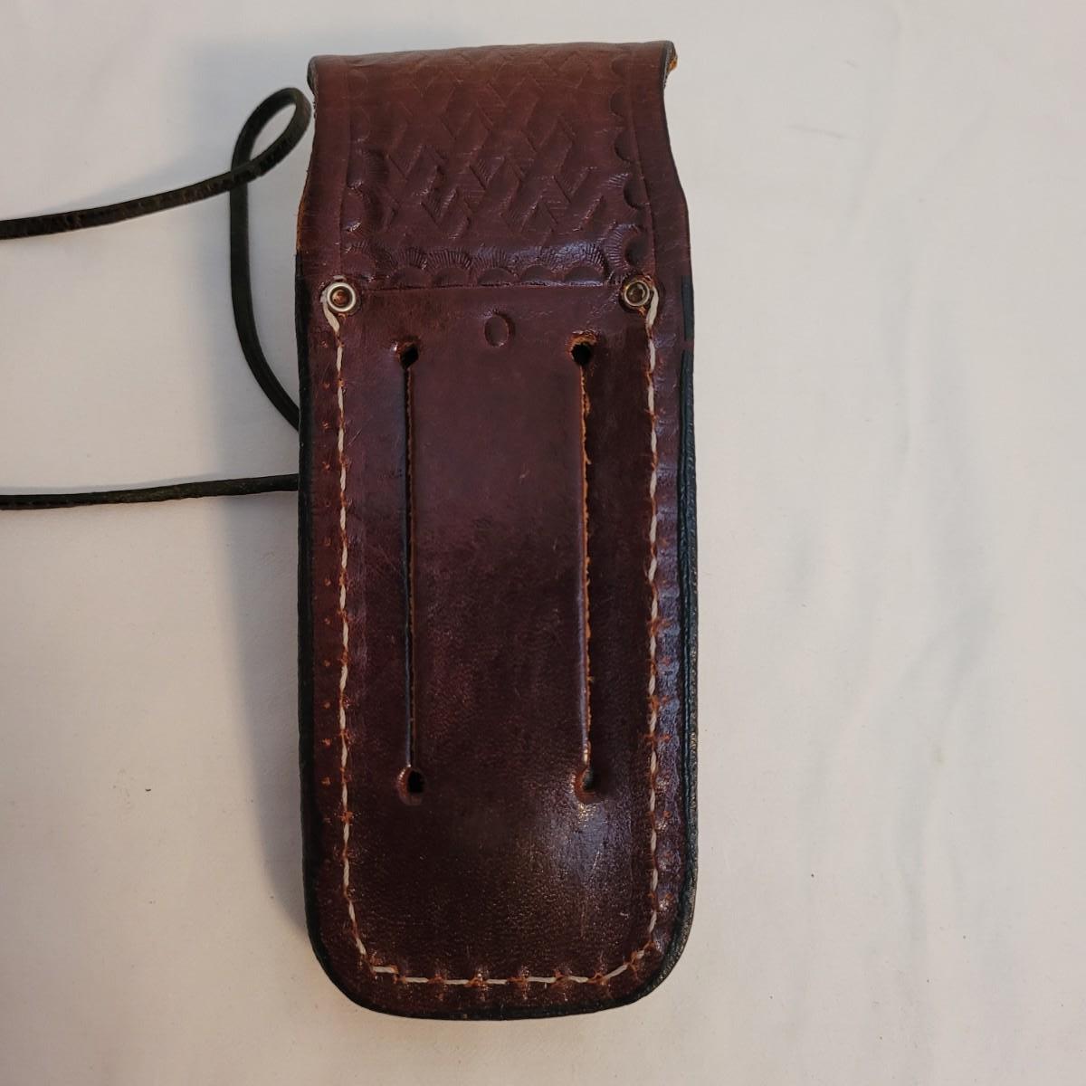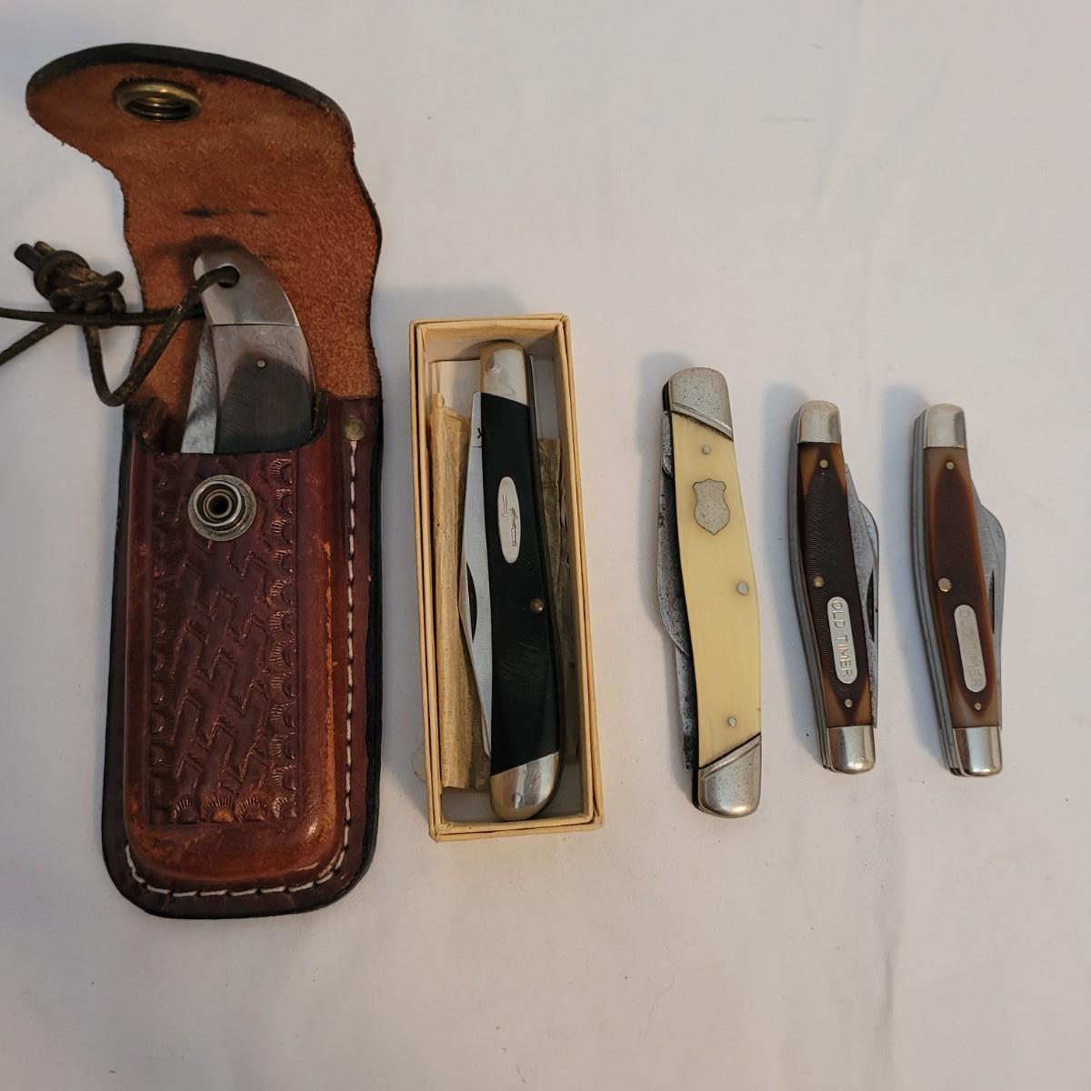 This lot includes five vintage folding knives and one leather belt holster. Three of these knives are Old Timer brand, one of which, is the larger knife in the leather case. Also included is a vintage Buck knife in its original box with paperwork.The largest knife measures 5.5" in length and the sortest measures 3.5" in length.