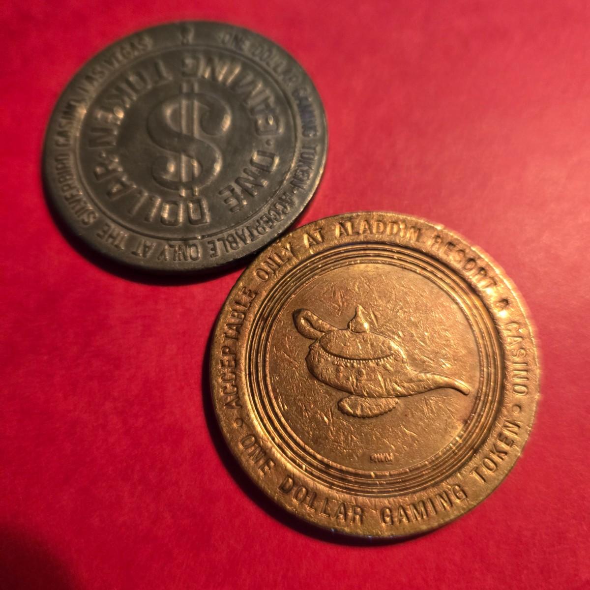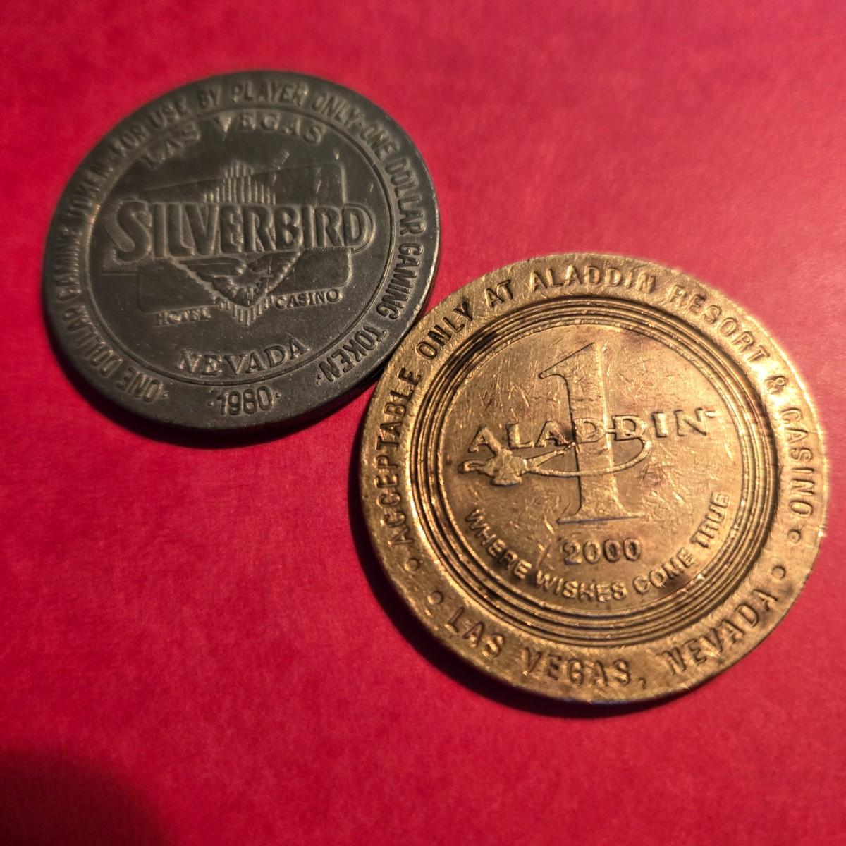 This is a lot for Old Vegas Gaming Tokens. These 2 Tokens are from closed Casinos. They are $1 gaming tokens from the new Aladdin Casino that was opened in 2000 but closed in 2007. The Silverbird Casino closed in 1981. The Aladdin token is dated 2000 and the Silverbird token is dated 1980. They are both 1.5-inches in diameter and are in used condition.