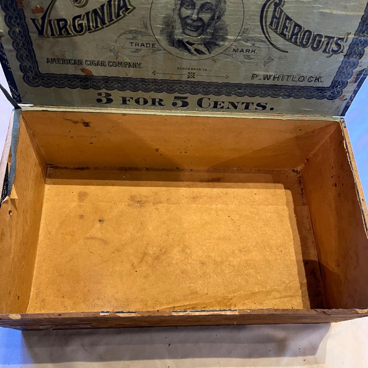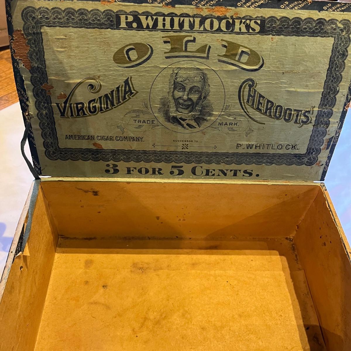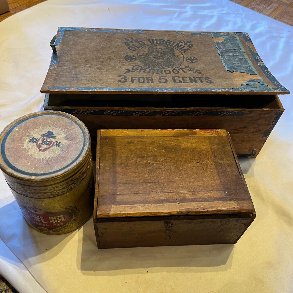 Lot includes a CHS wooden cigar box and a P. Whitlocks Old Virginia Cheroots wooden cigar box. Also includes a circular cardboard container With Asian lettering. Largest box measures 7.25” x 12” x 5”.