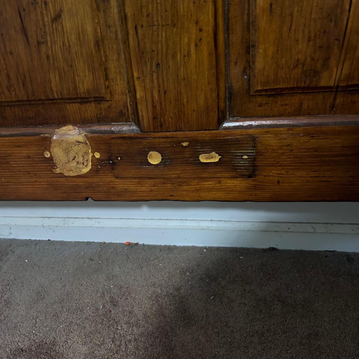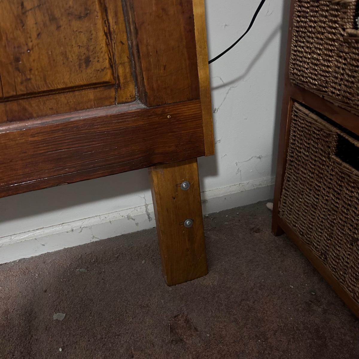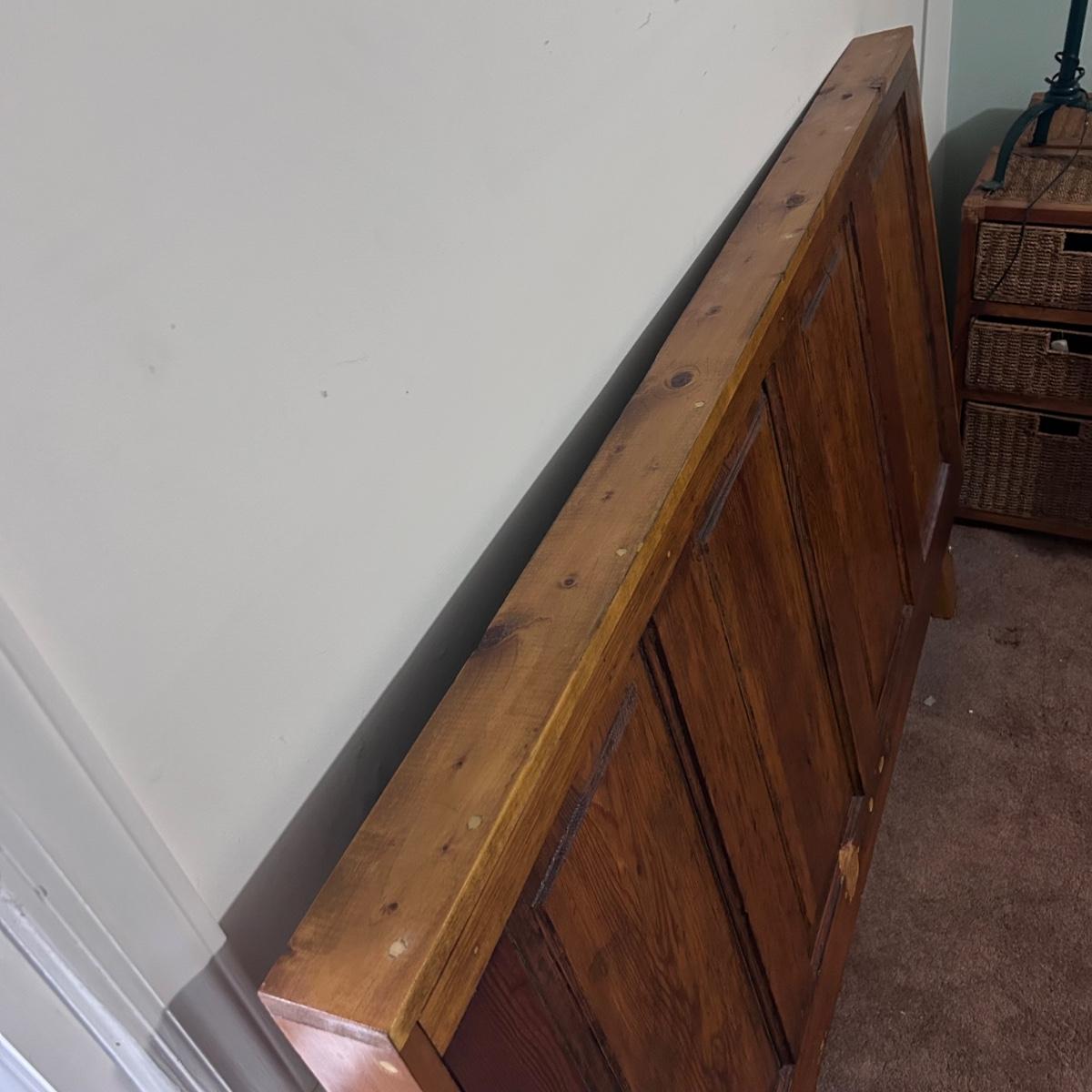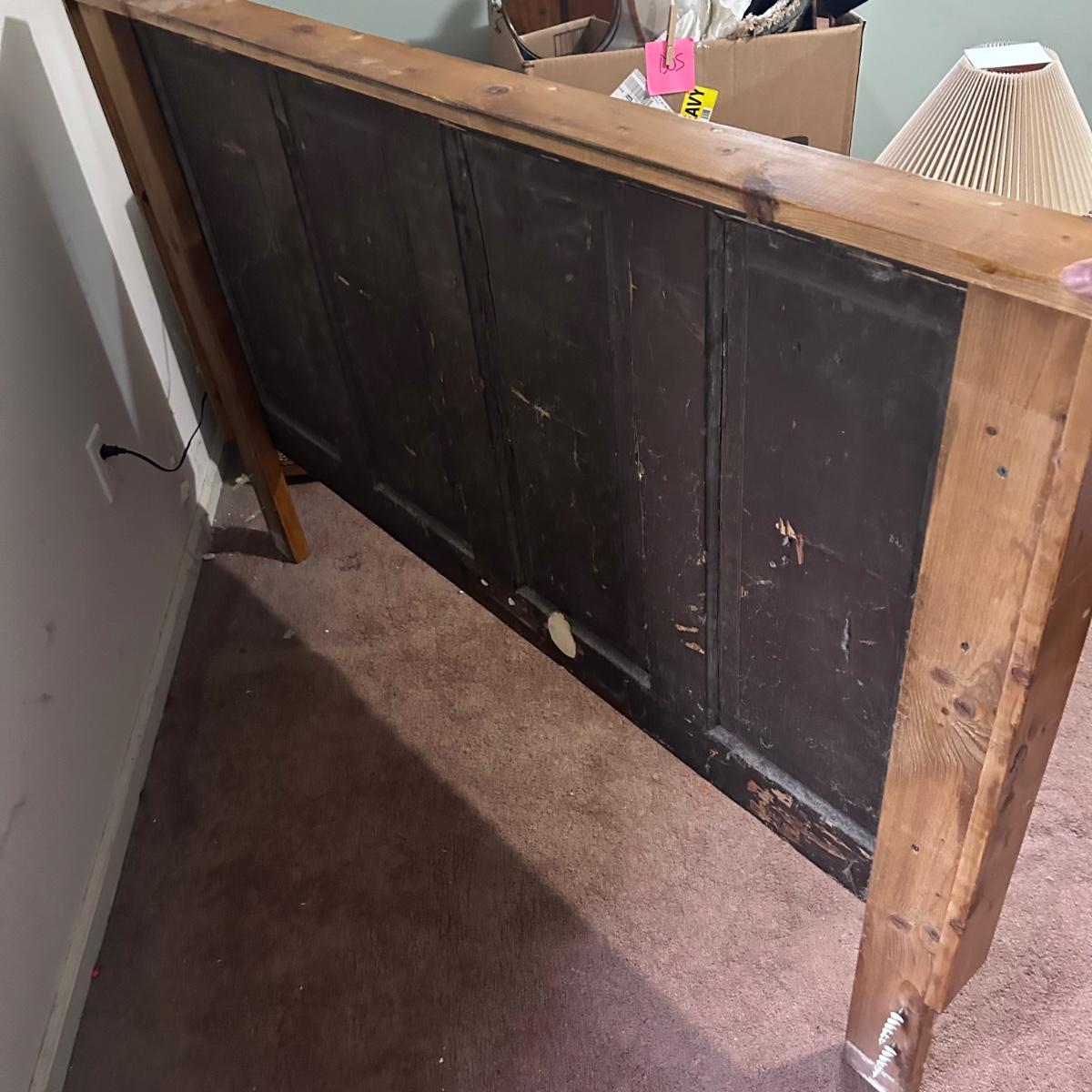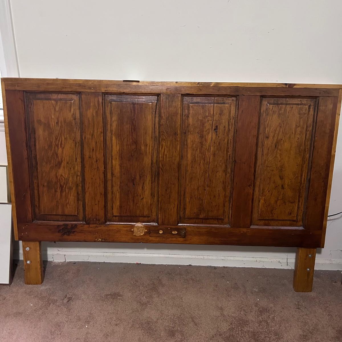 This old solid wood door has been framed and converted to a queen sized headboard. There is a lot of wood filler used but the facing panels are a rich wood grain that is a little rustic and also quite nice. Piece measures 62.5”x43”x3.5”. Local pick up only.