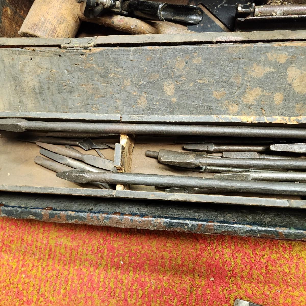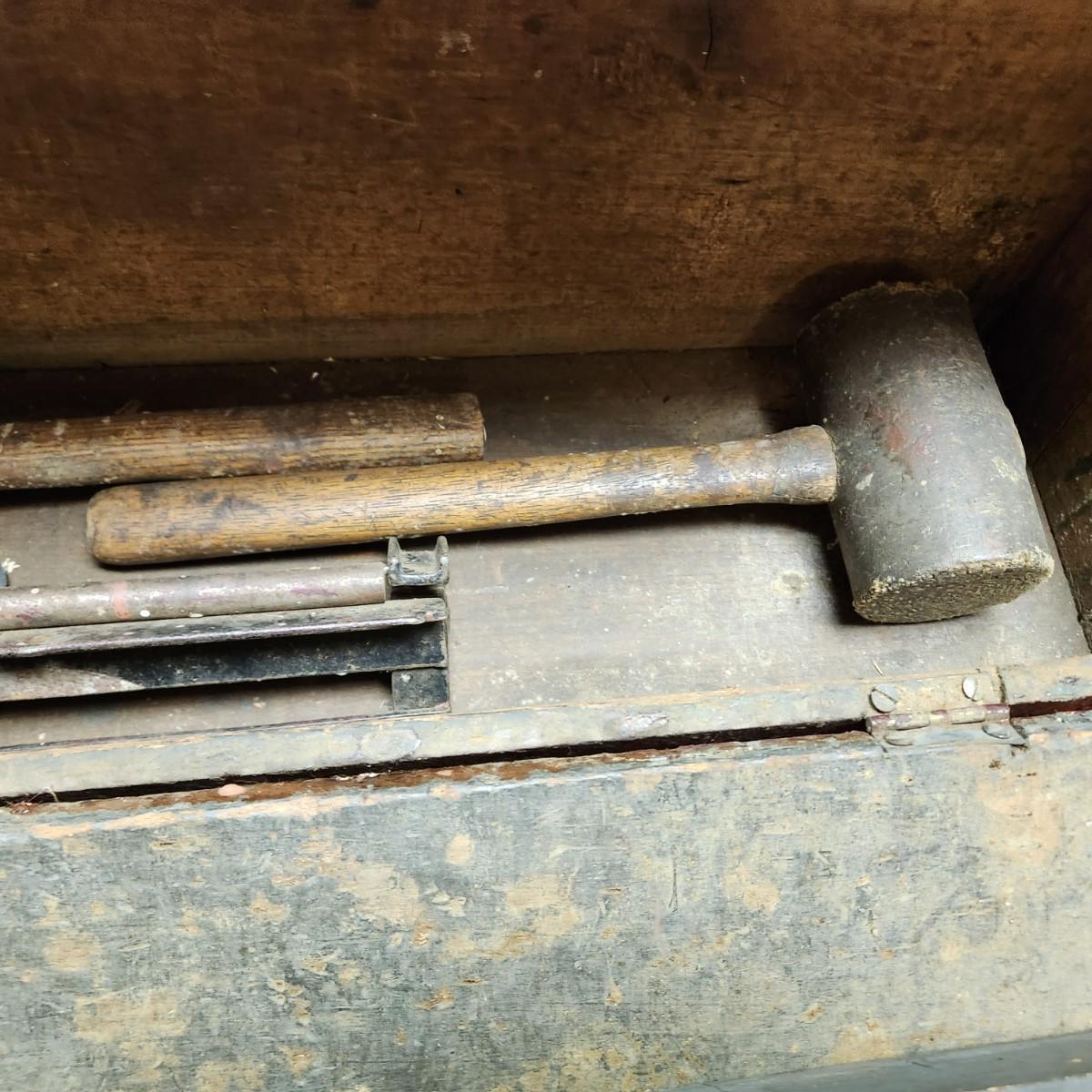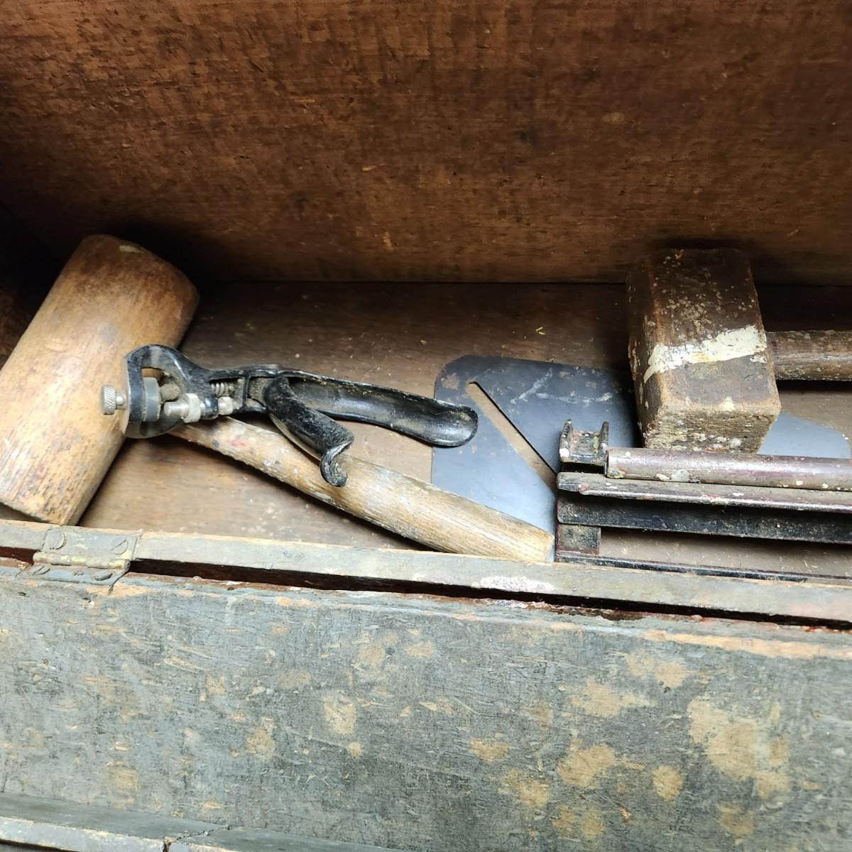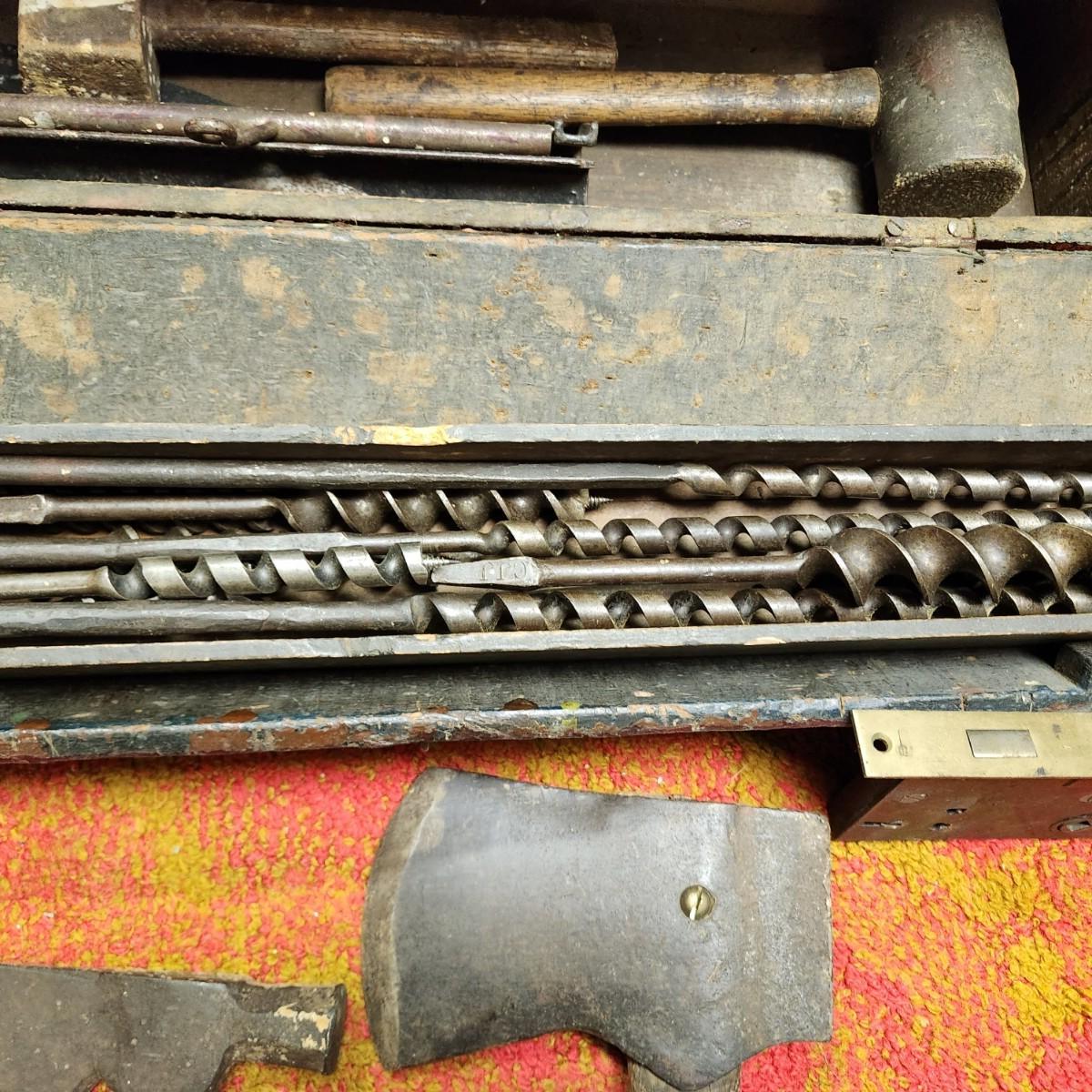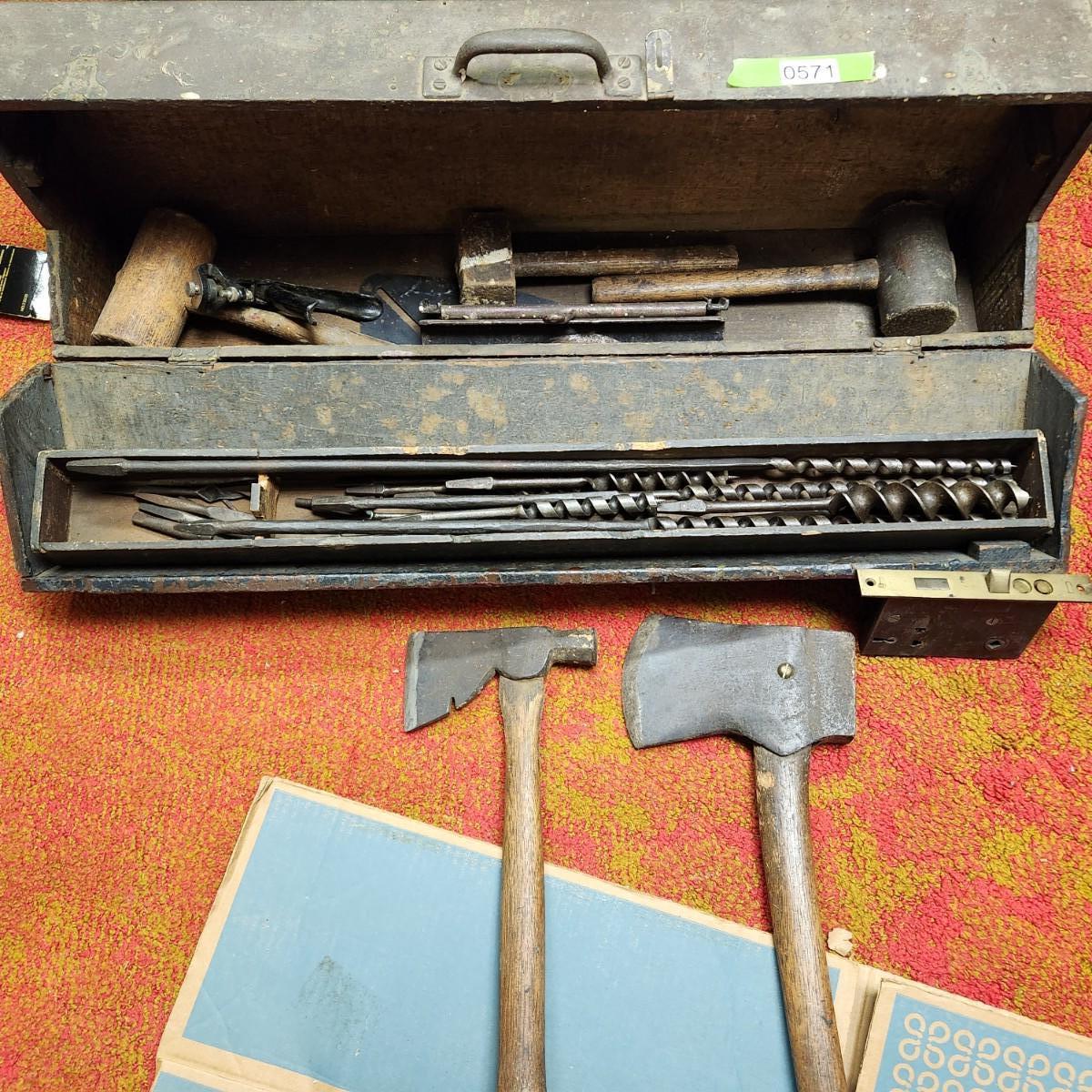 Old Wood Tool Box with Tools Drill Bits   lot 571