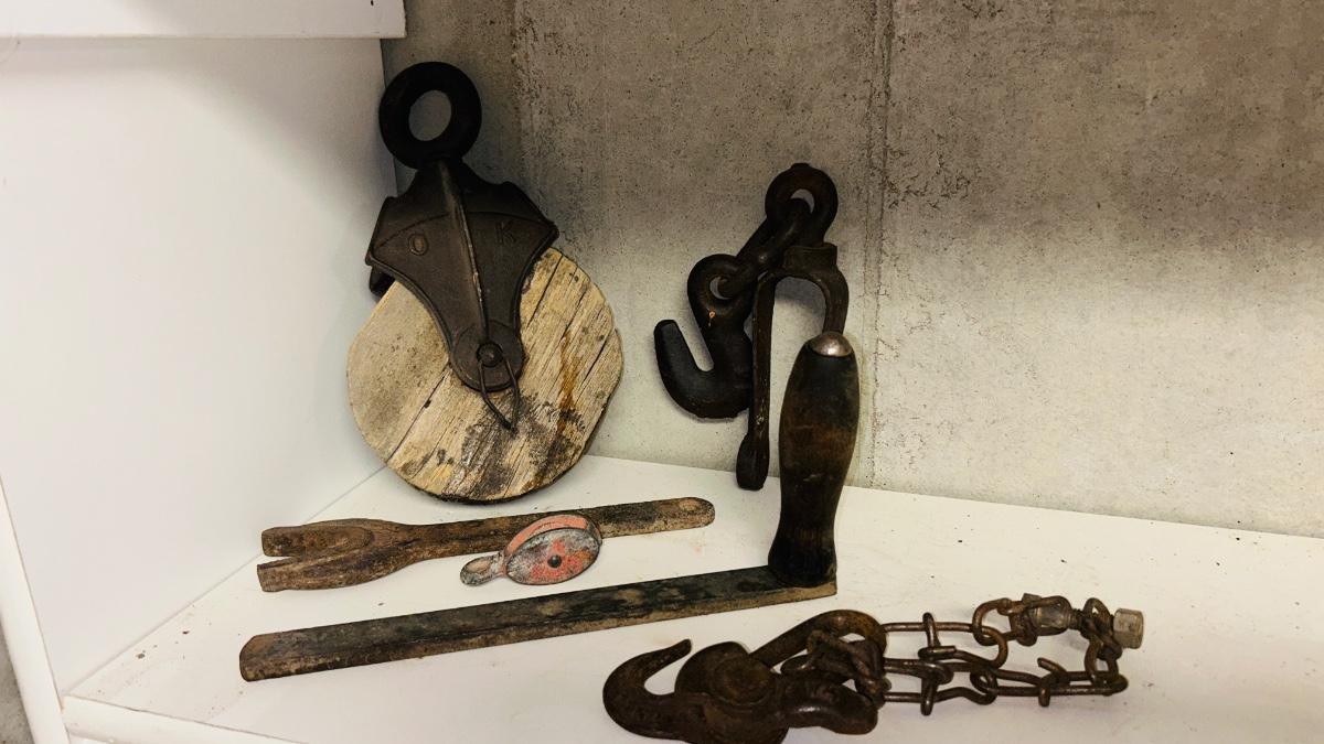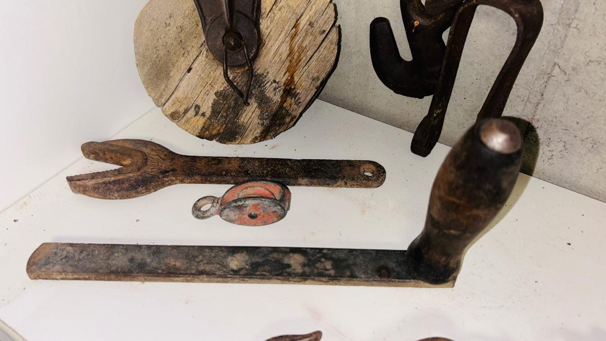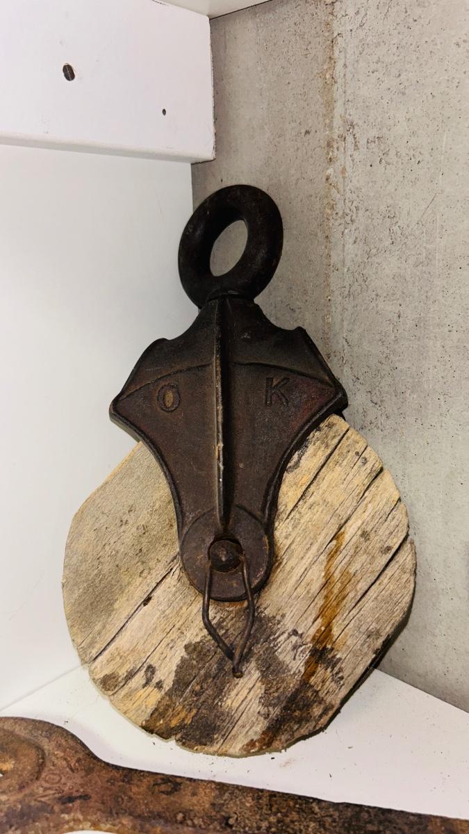 OLD WOODEN PULLEY, CLEVIS AND HOOK AND OTHER TIE DOWNS