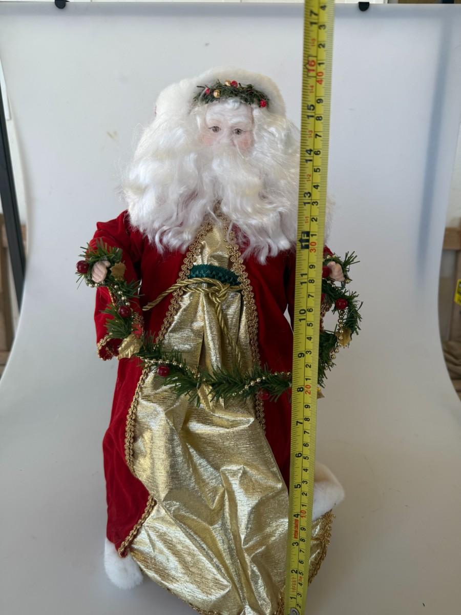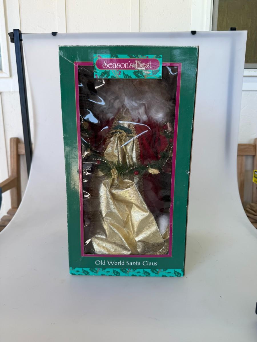 Classic boxed Christmas decor. Old World-style Santa in red and gold robe, perfect for vintage holiday collections