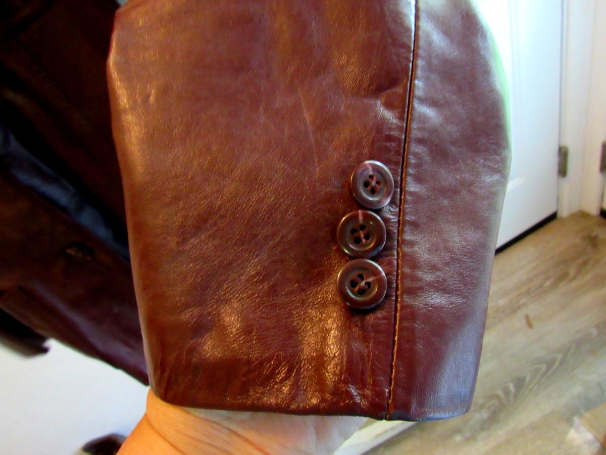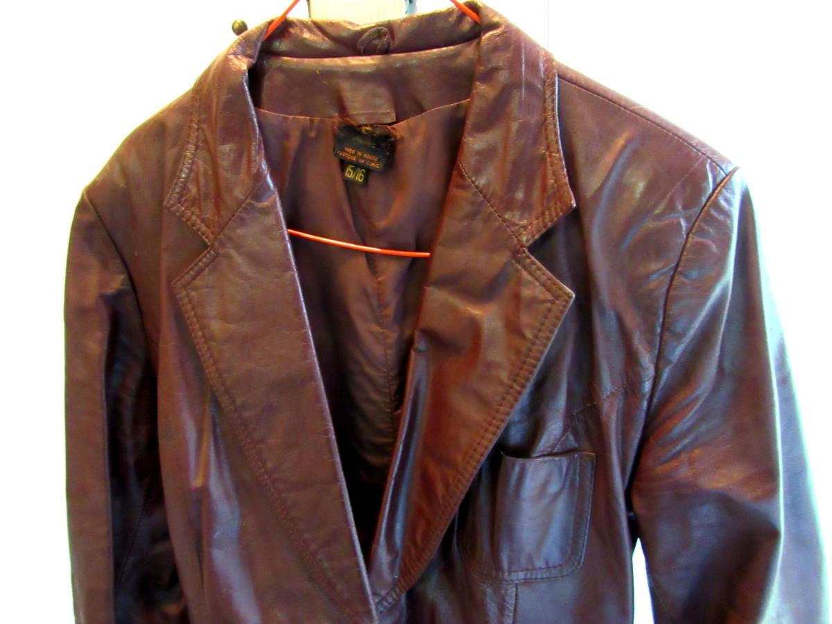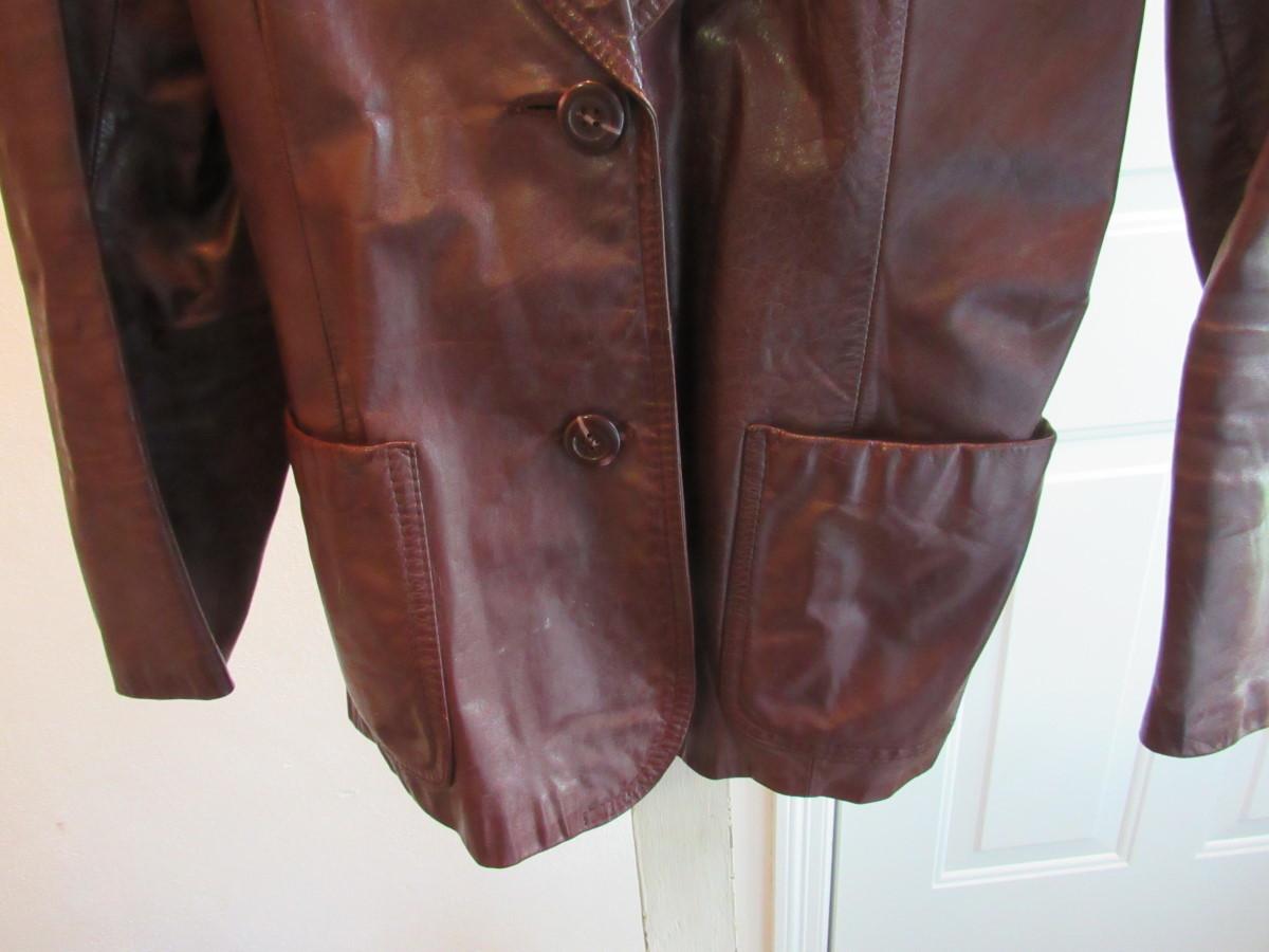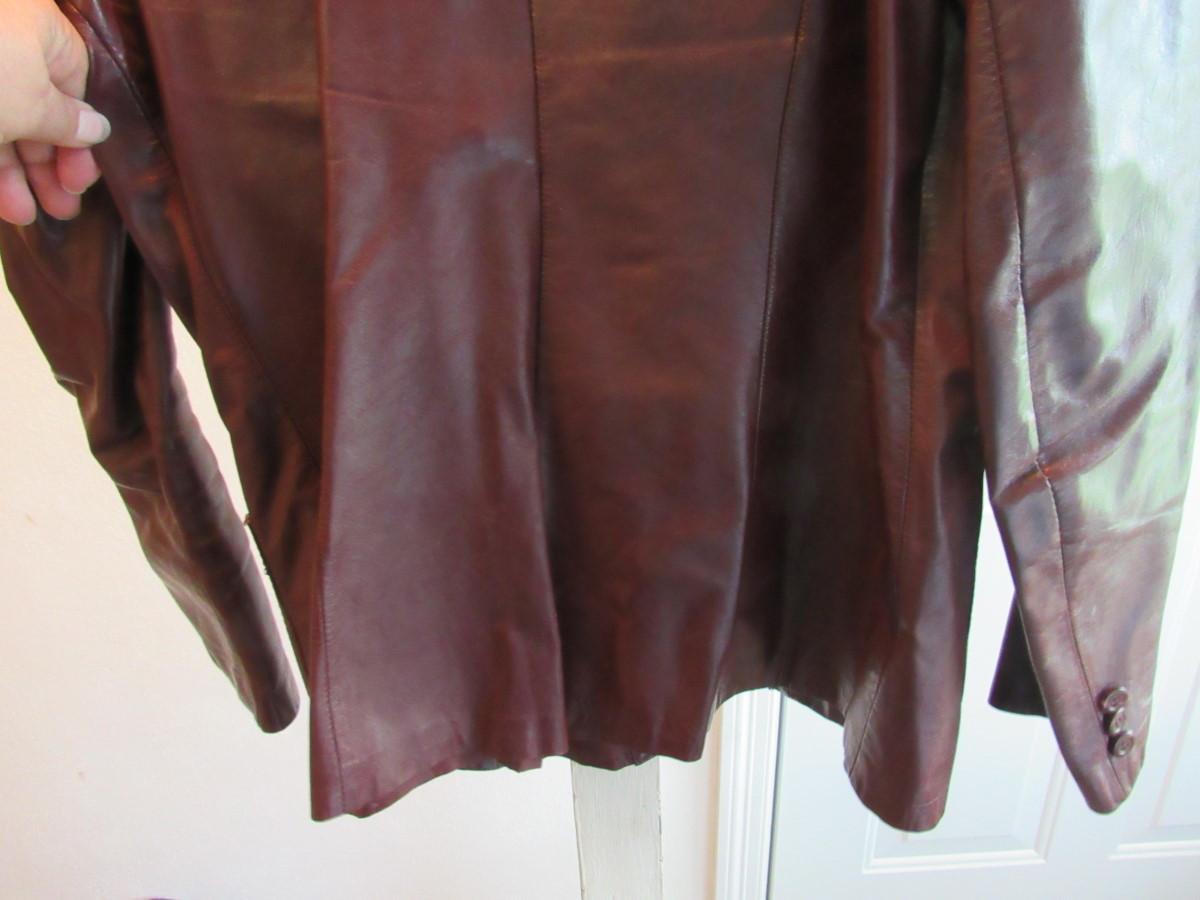 Nice Ladies size 15/16 leather jacket. Like a dark mauve-ish/brown color. 2 button front closure. Two front pockets. 100% leather shell, 100% nylon lining. Appears to be in great shape. Except for where the label is attached to the neckline, someone tried to tear it off, needs to be reattached. Shipping is available at actual shipping cost plus $5.00 handling fee per box for supplies/labor. See our terms for details. All sales are final. Condition notes may not be all inclusive, we may miss some issues as most vintage items are not in mint condition and have some degree of wear, paint loss, etc, but we always try to note obvious damage.