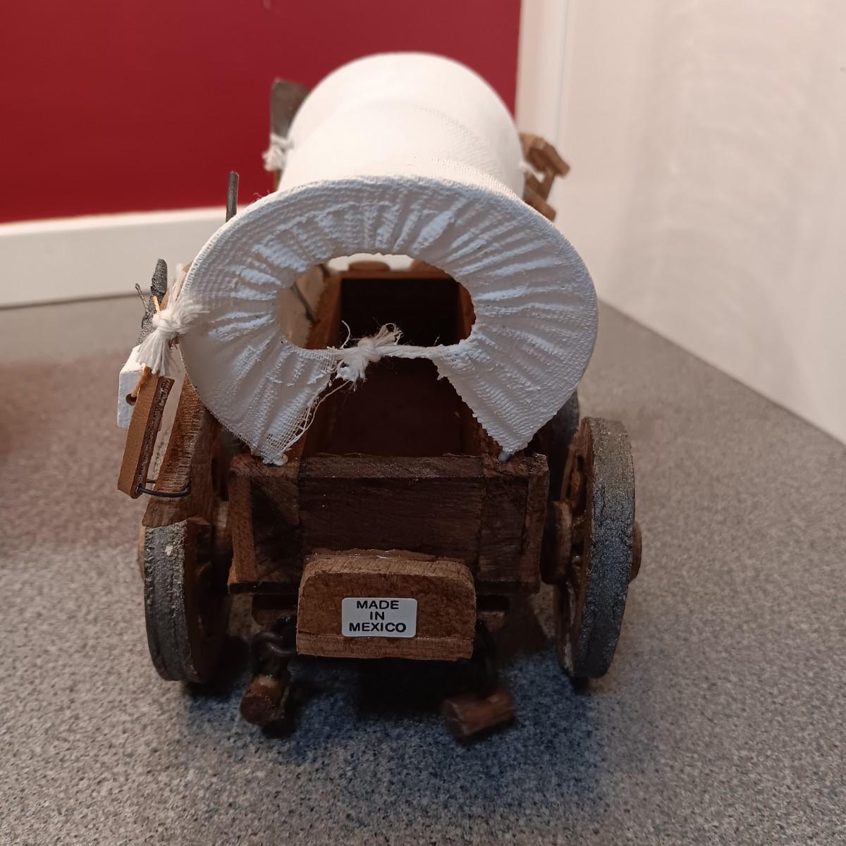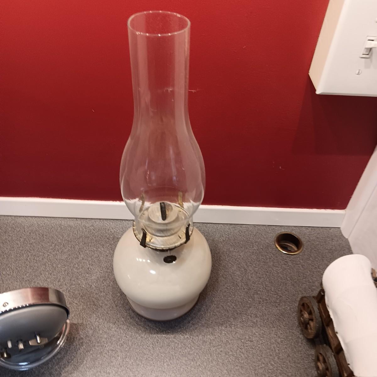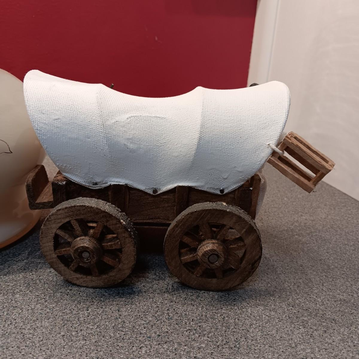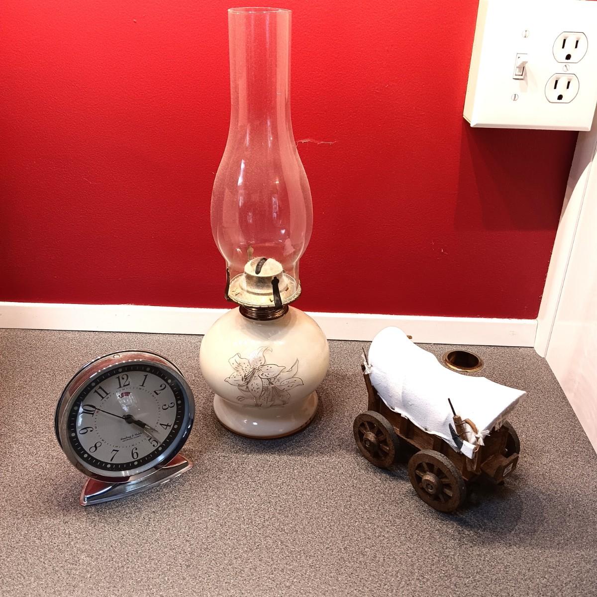 OLDER GLASS OIL LAMP, DETAILED MODEL WAGON AND A STERLING AND NOBLE ALARM CLOCK