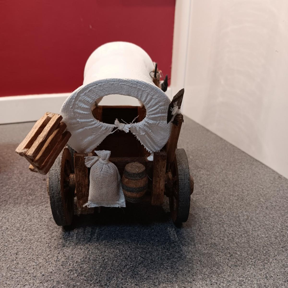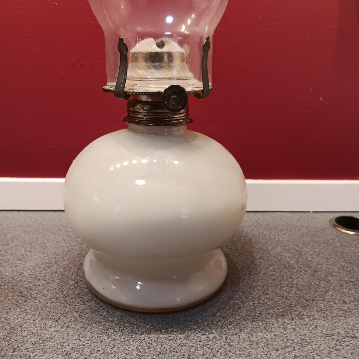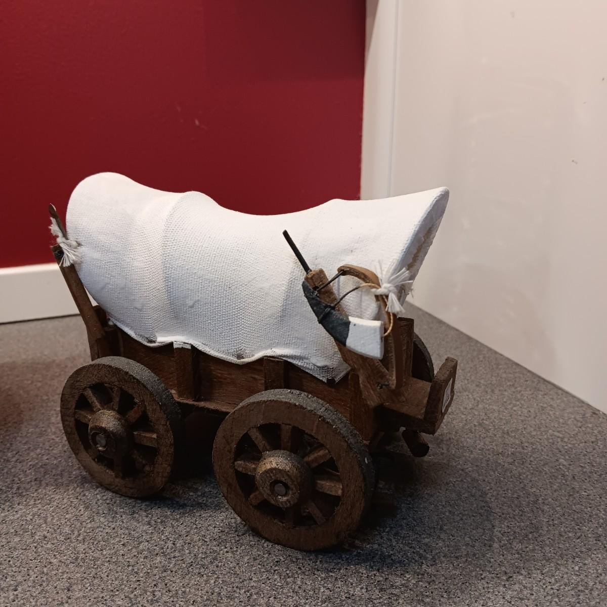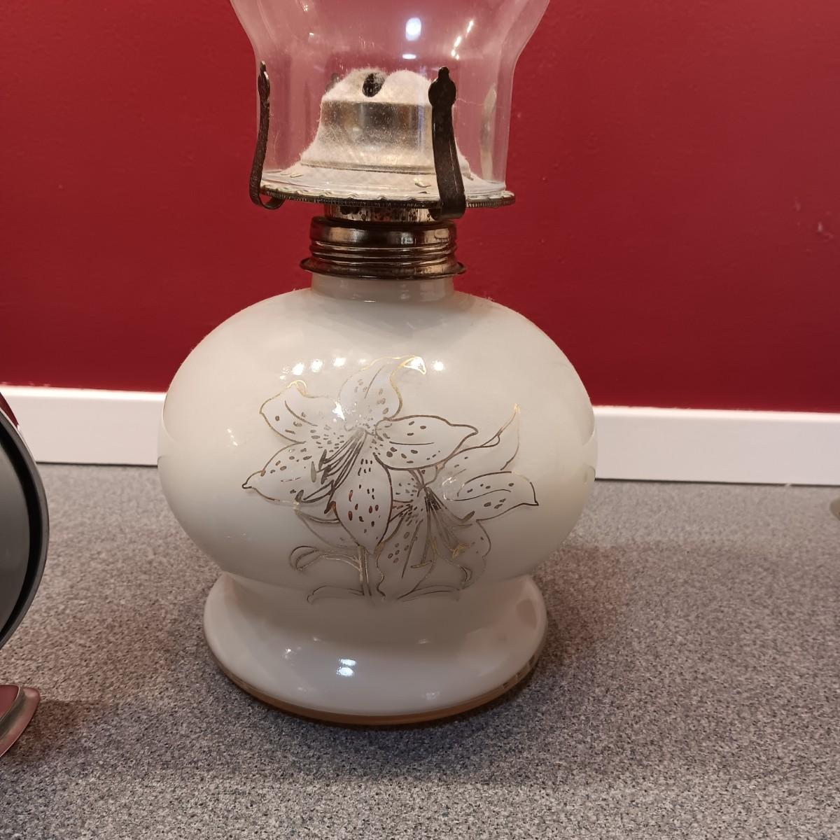 OLDER GLASS OIL LAMP, DETAILED MODEL WAGON AND A STERLING AND NOBLE ALARM CLOCK